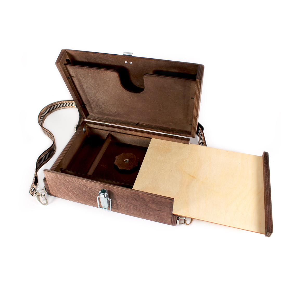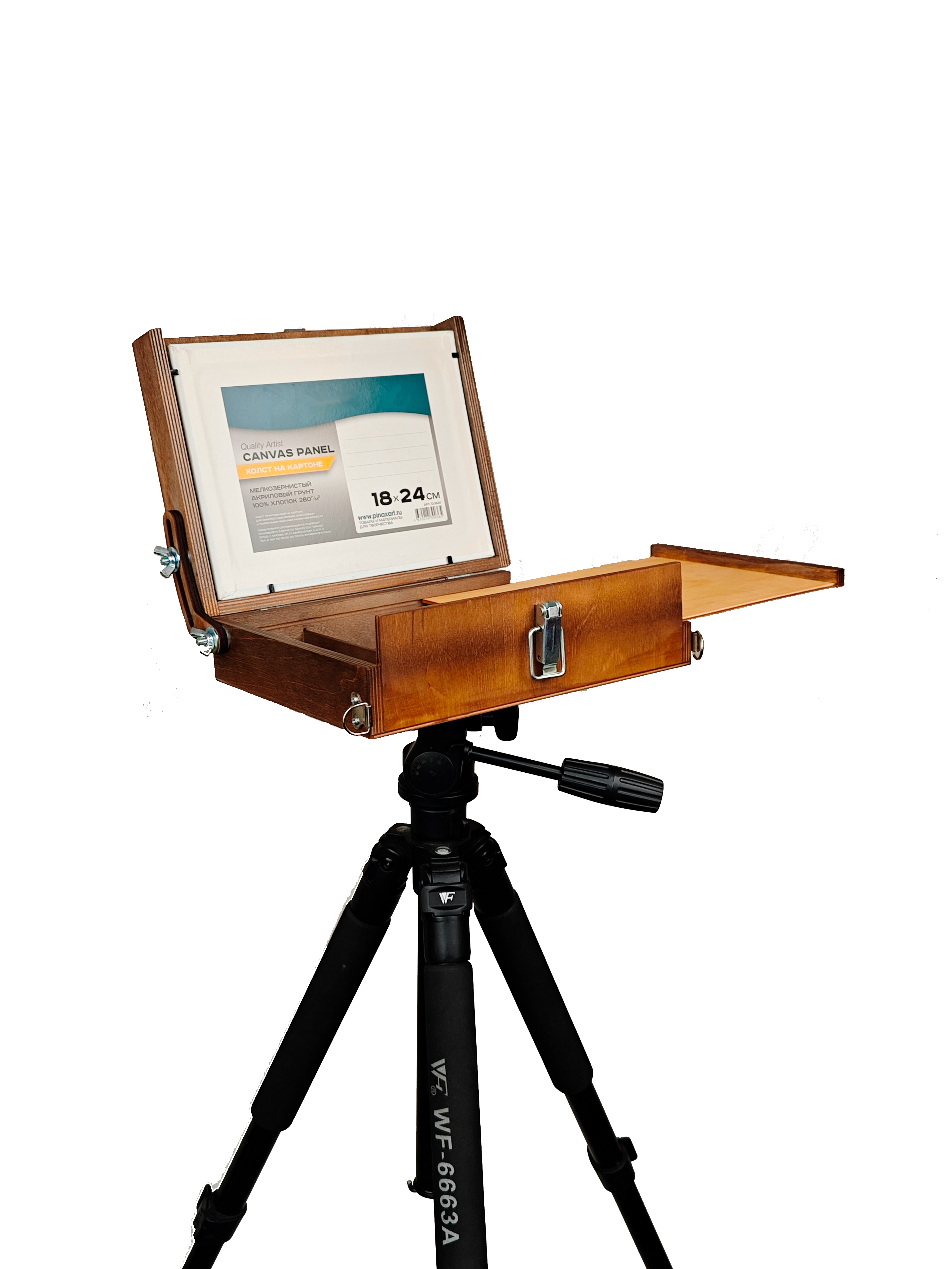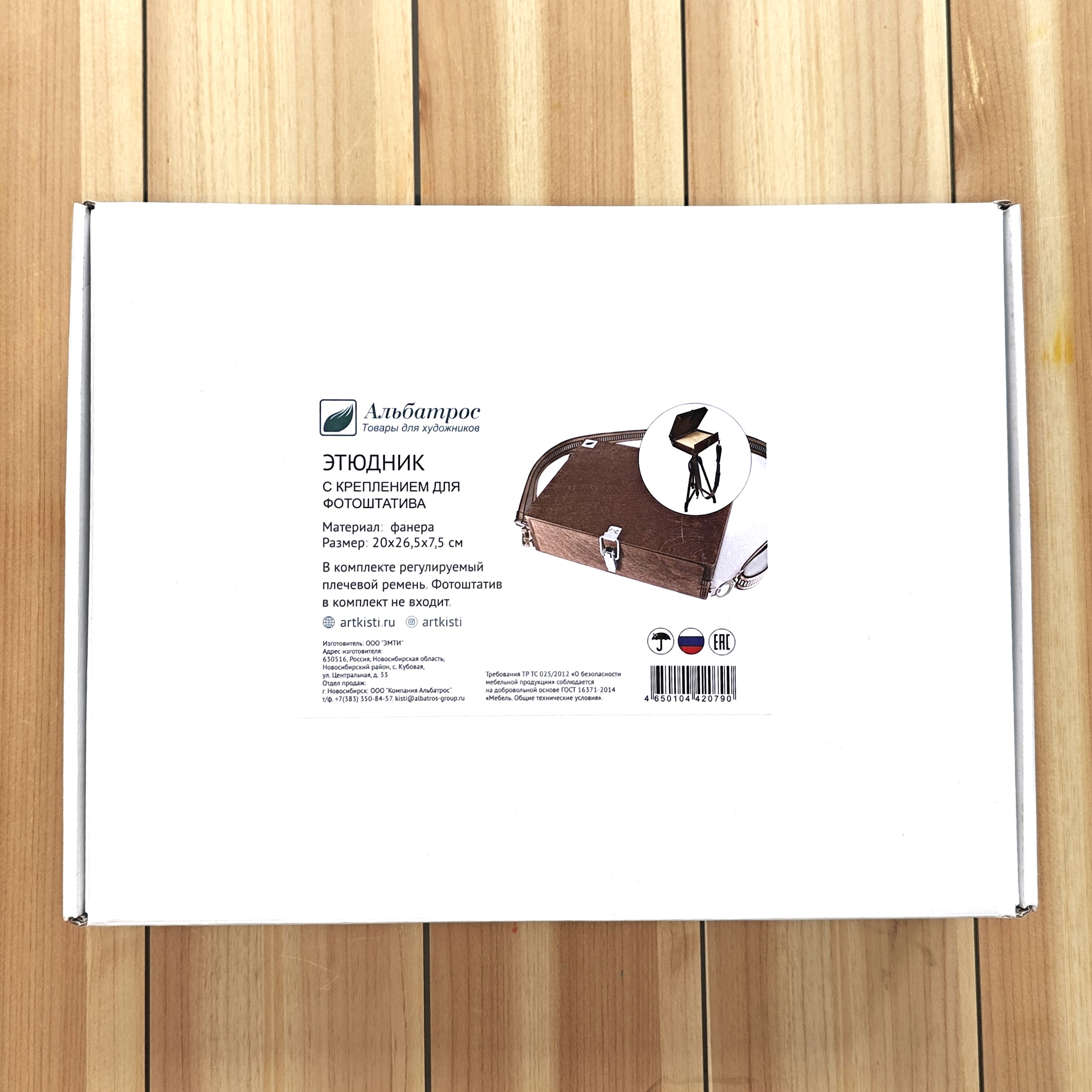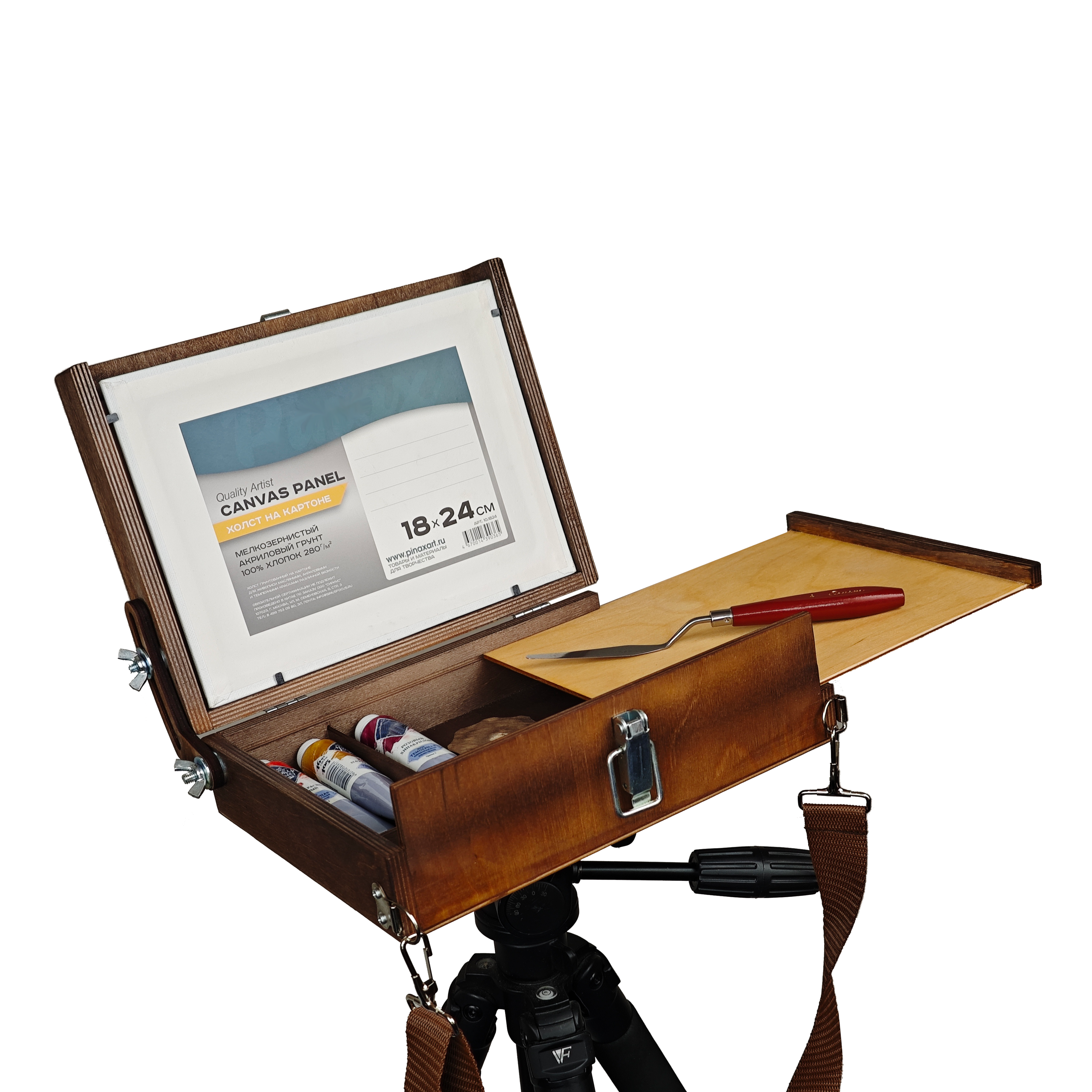 Оснащён плечевым ремнём, в комплекте с этюдником идет холст на ДВП.