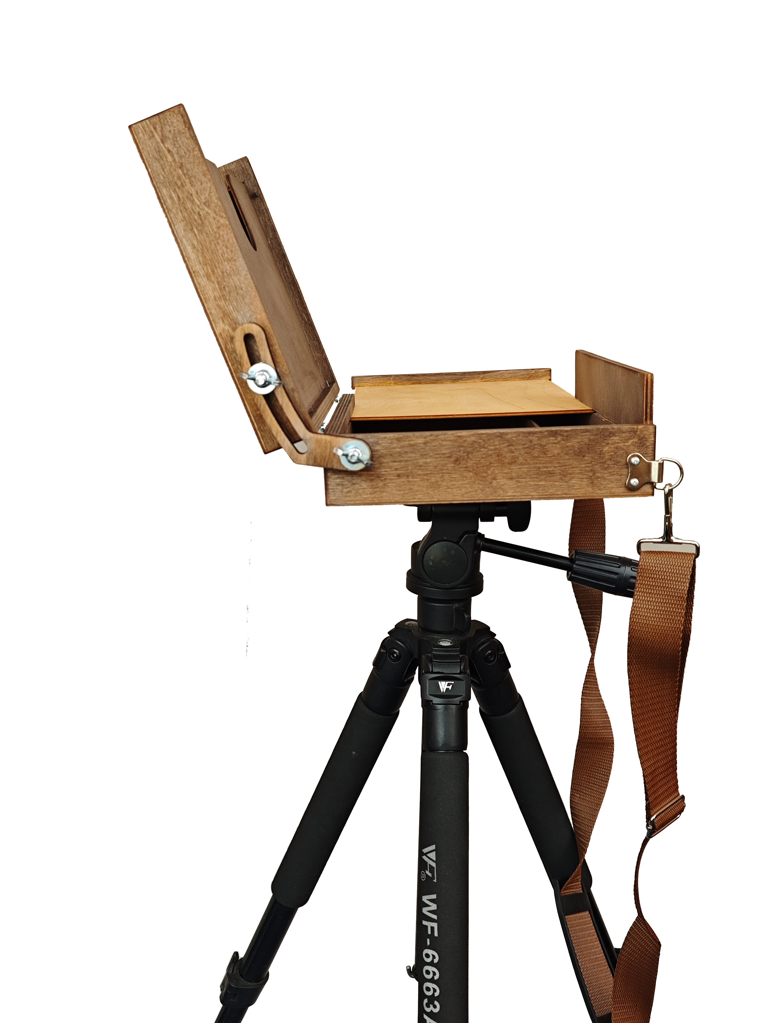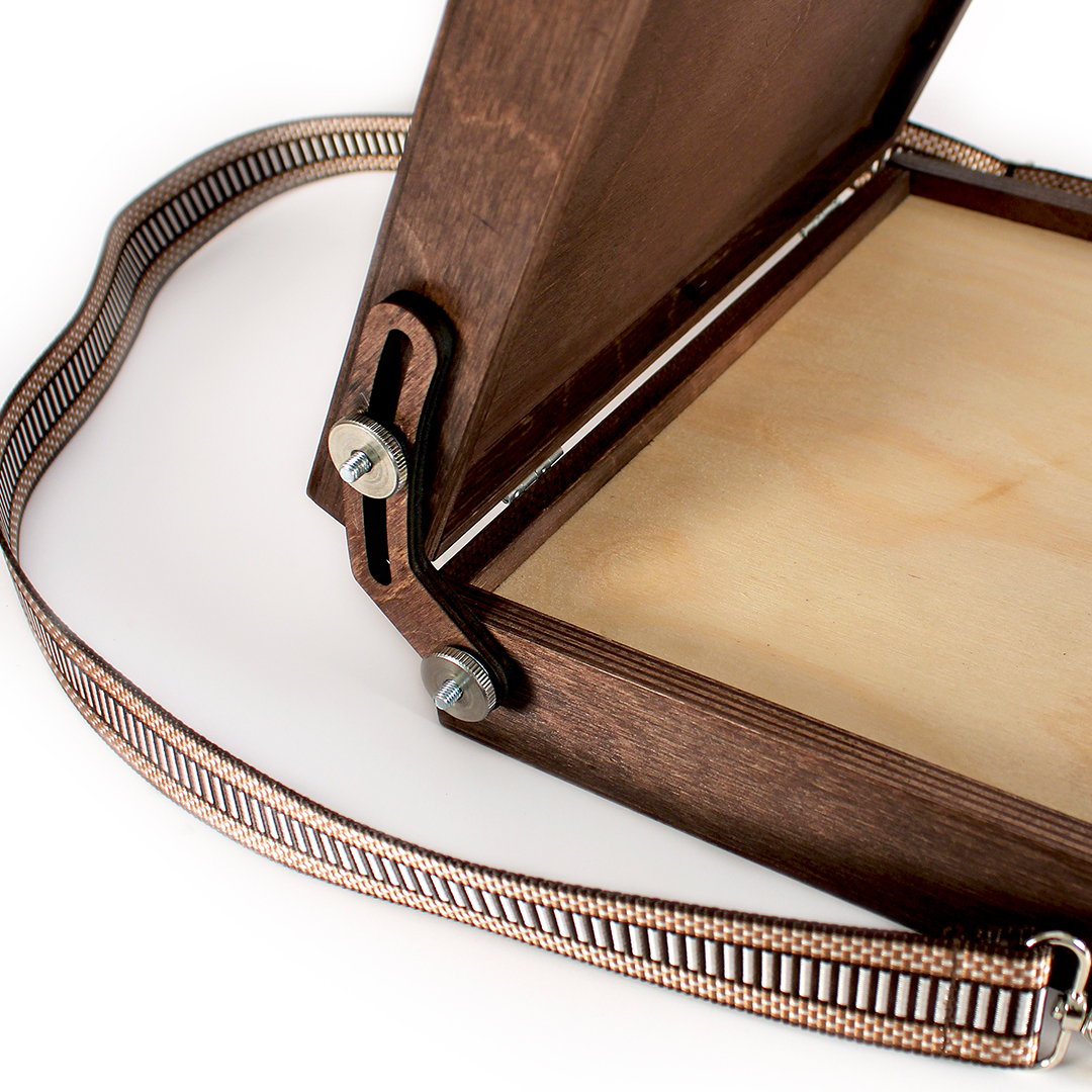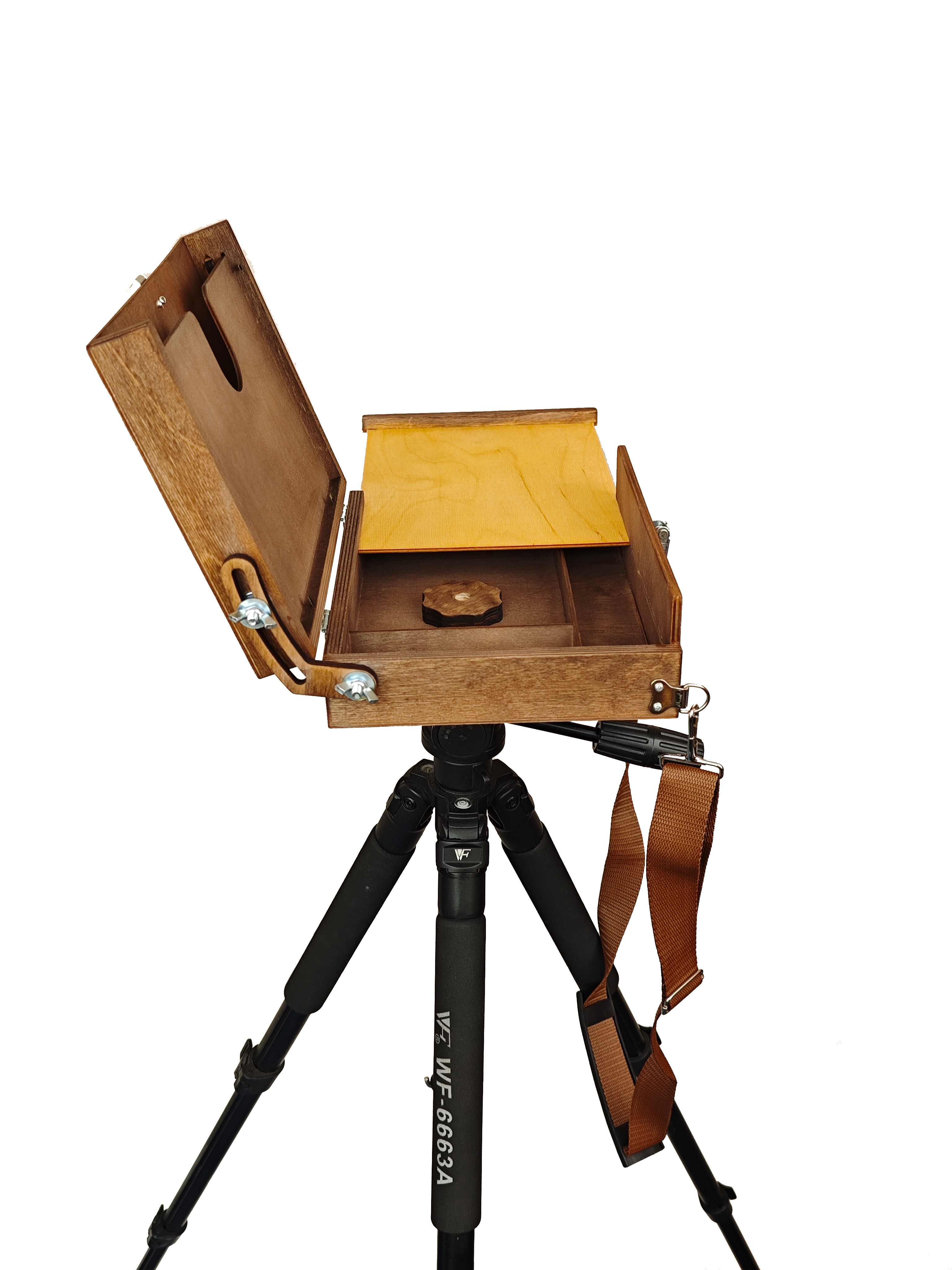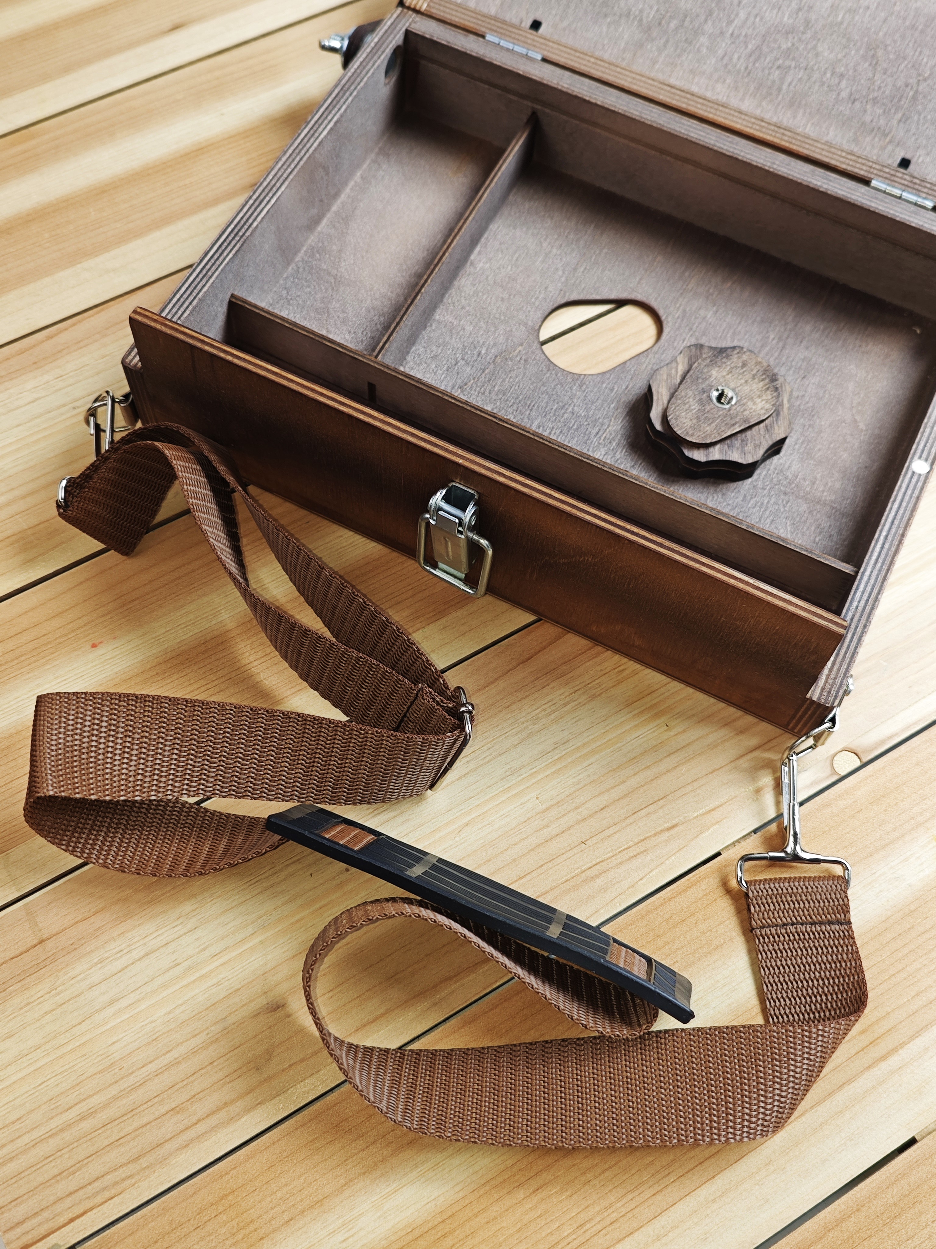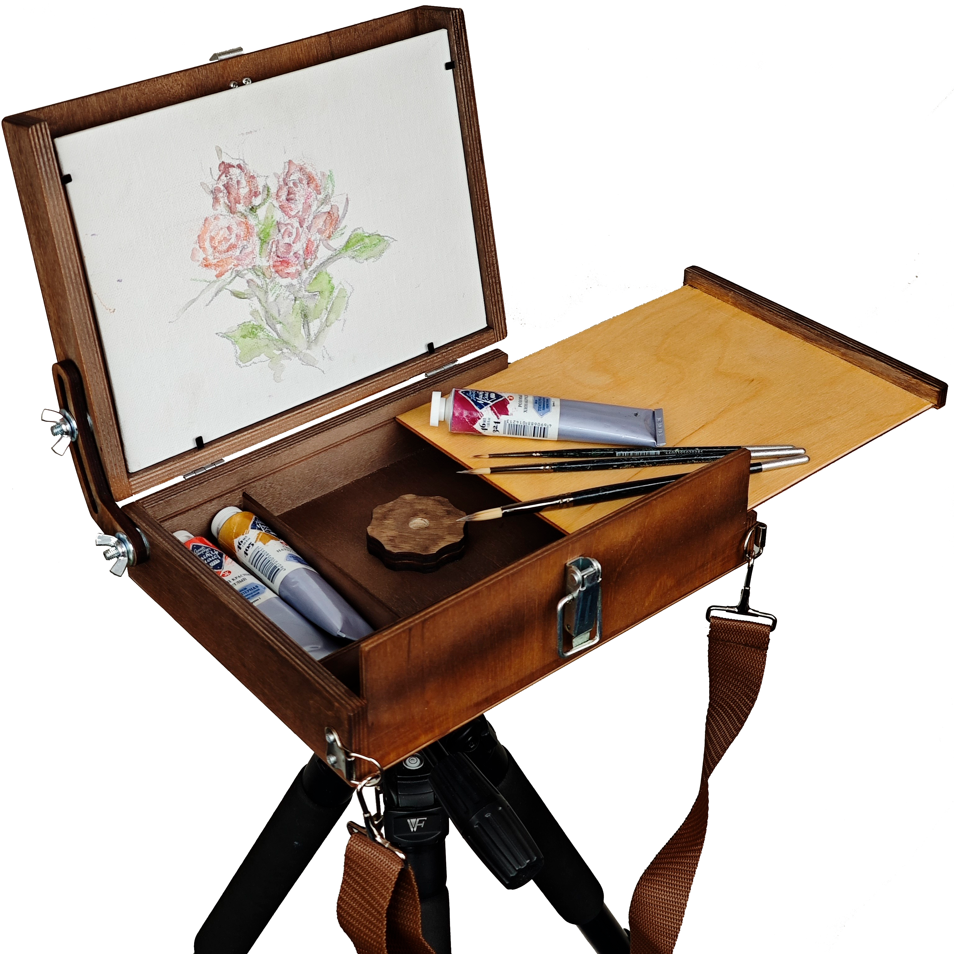 Оснащён плечевым ремнём, в комплекте с этюдником идет холст на ДВП.