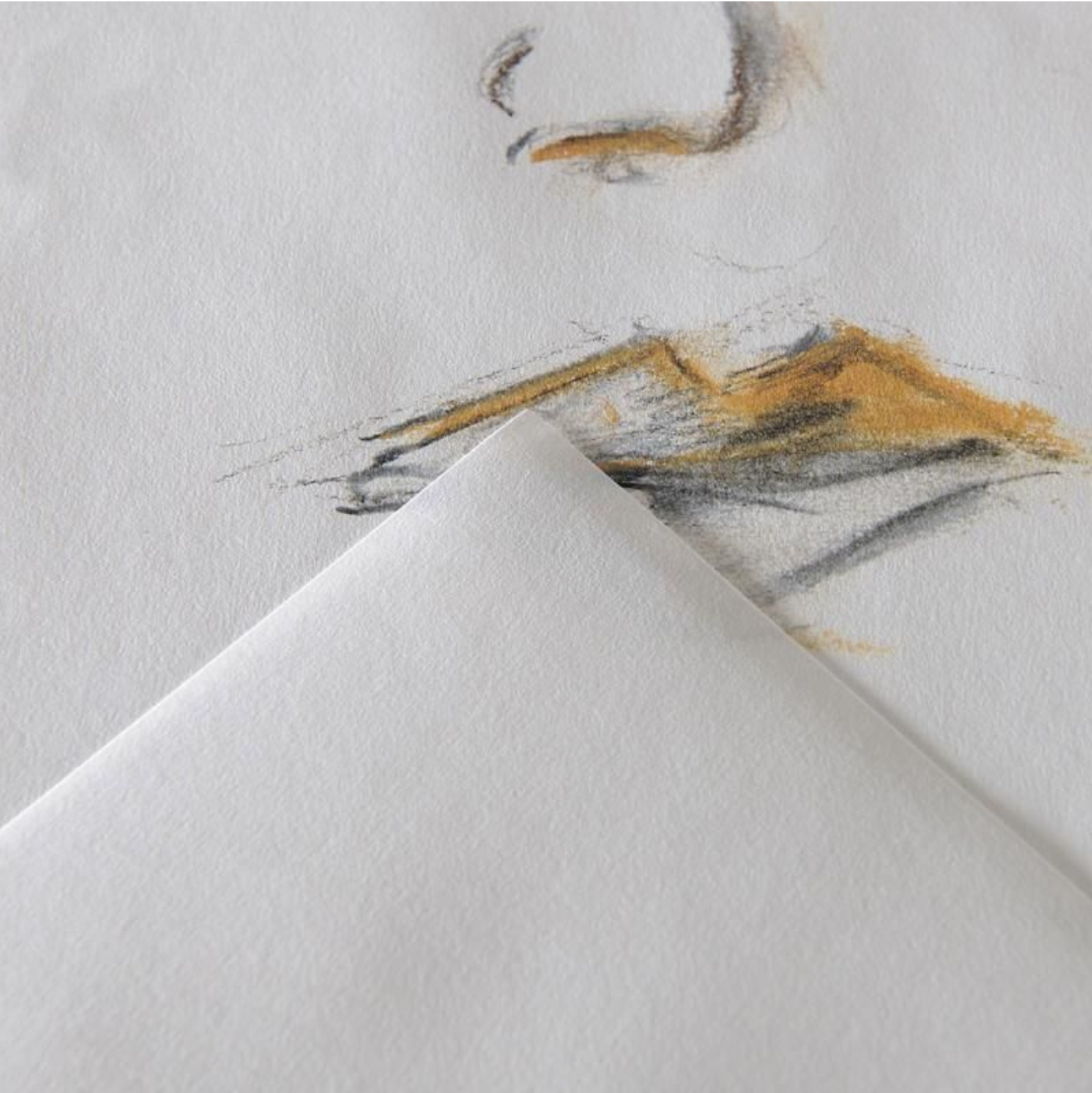 Бумага небольшой плотности обладает очень приятной натурально-хаотичной мелкой текстурой, на которой очень выигрышно смотрятся зарисовки сухими графическими материалами.