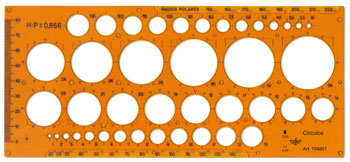 100х255х1,5 мм. Диаметр от 1 до 34 мм с полярными лучами для окружностей от 40 до 440 мм. Центрирующие риски 60° и 90°