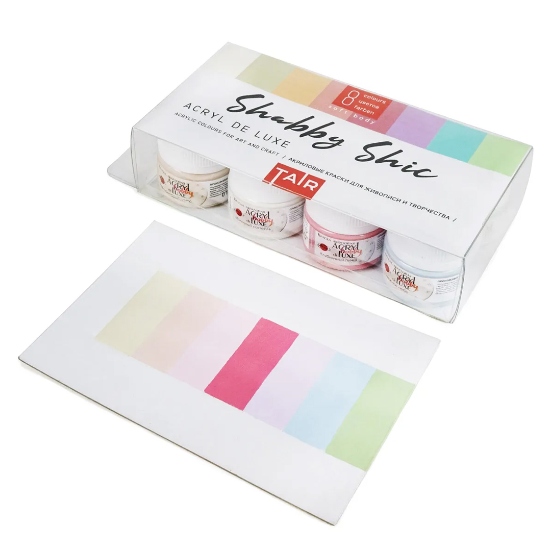 Краски «Акрил Де Люкс» — это акриловые краски приятной текучей консистенции, после высыхания образующие матовый слой. Благодаря этому свойству краски напоминают по своим характеристикам меловые. Преимущественно пастельная палитра, в сочетании со сложными глубокими оттенками потрясающе смотрятся в живописных работах. Красивая бархатистая поверхность, изысканные оттенки и возможность создавать плавные «акварельные» переходы — это только некоторые качества, за которые художники так любят эту линейку. Набор «Шебби Шик» — это гармоничное сочетание нежных пастельных оттенков. Светлая гамма придаст работе ощущение света, романтики, мягкого налёта старины.