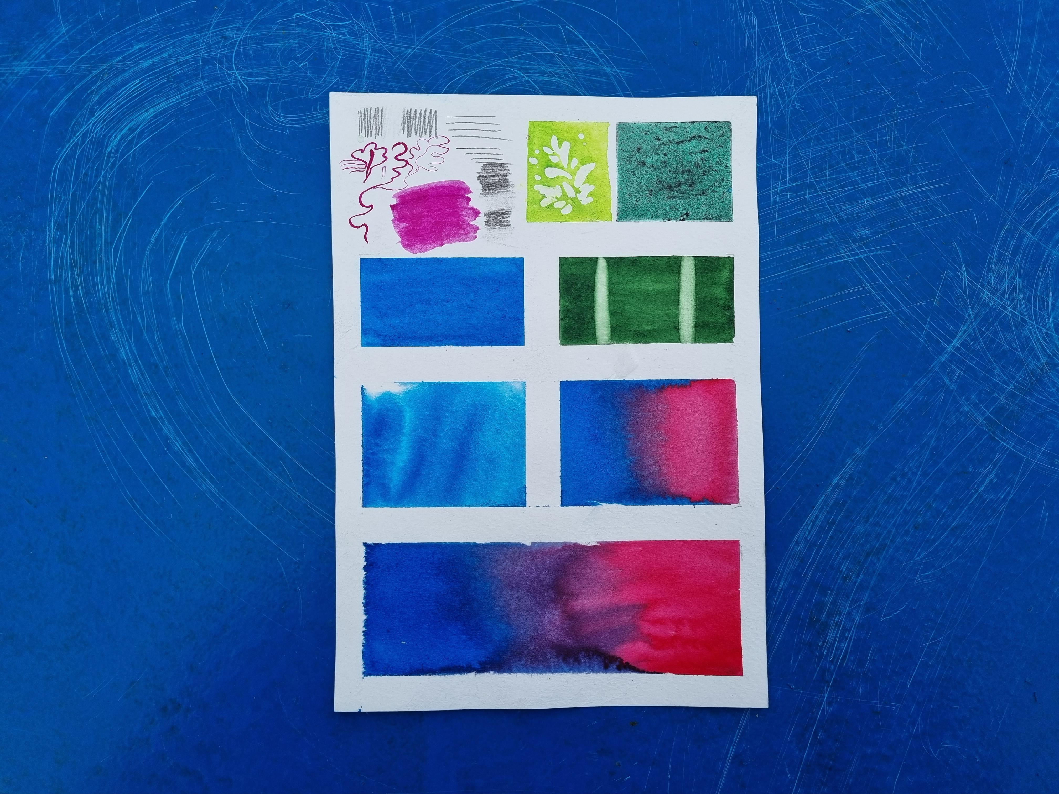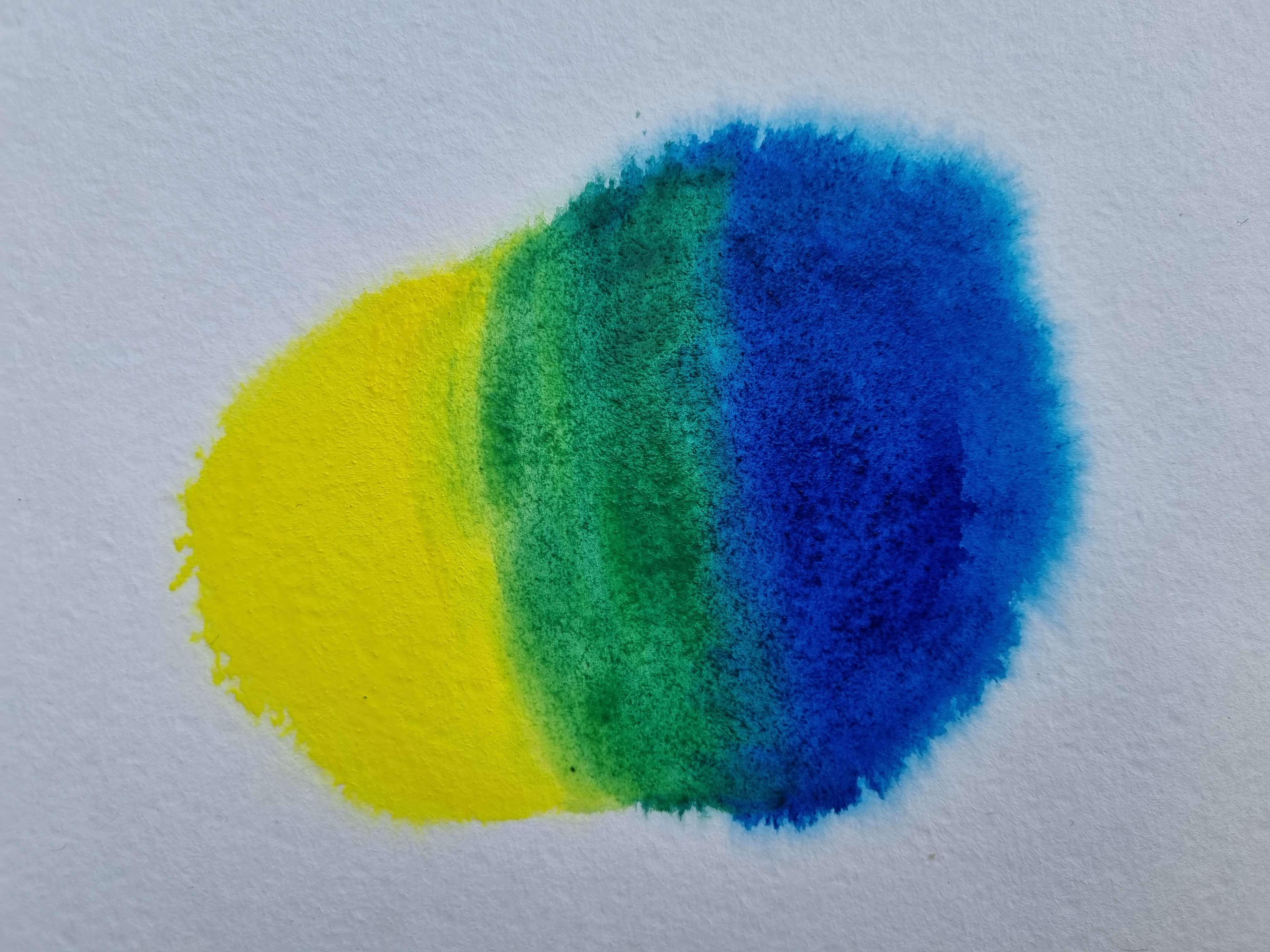 При смачивании бумага ощутимо приподнимается, что может повлиять на качество заливки. Растекание краски довольно пассивное. Влага впитывается быстро. Градиент «ведёт» также как и краску, которая преимущественно остаётся на поверхности листа. Есть ощущения «скатывания».