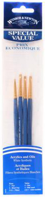 Набор кистей, белая синтетика, короткая ручка: №2 (закругленная), 4 (закругленная), 1 (плоская), 2 (короткая плоская)