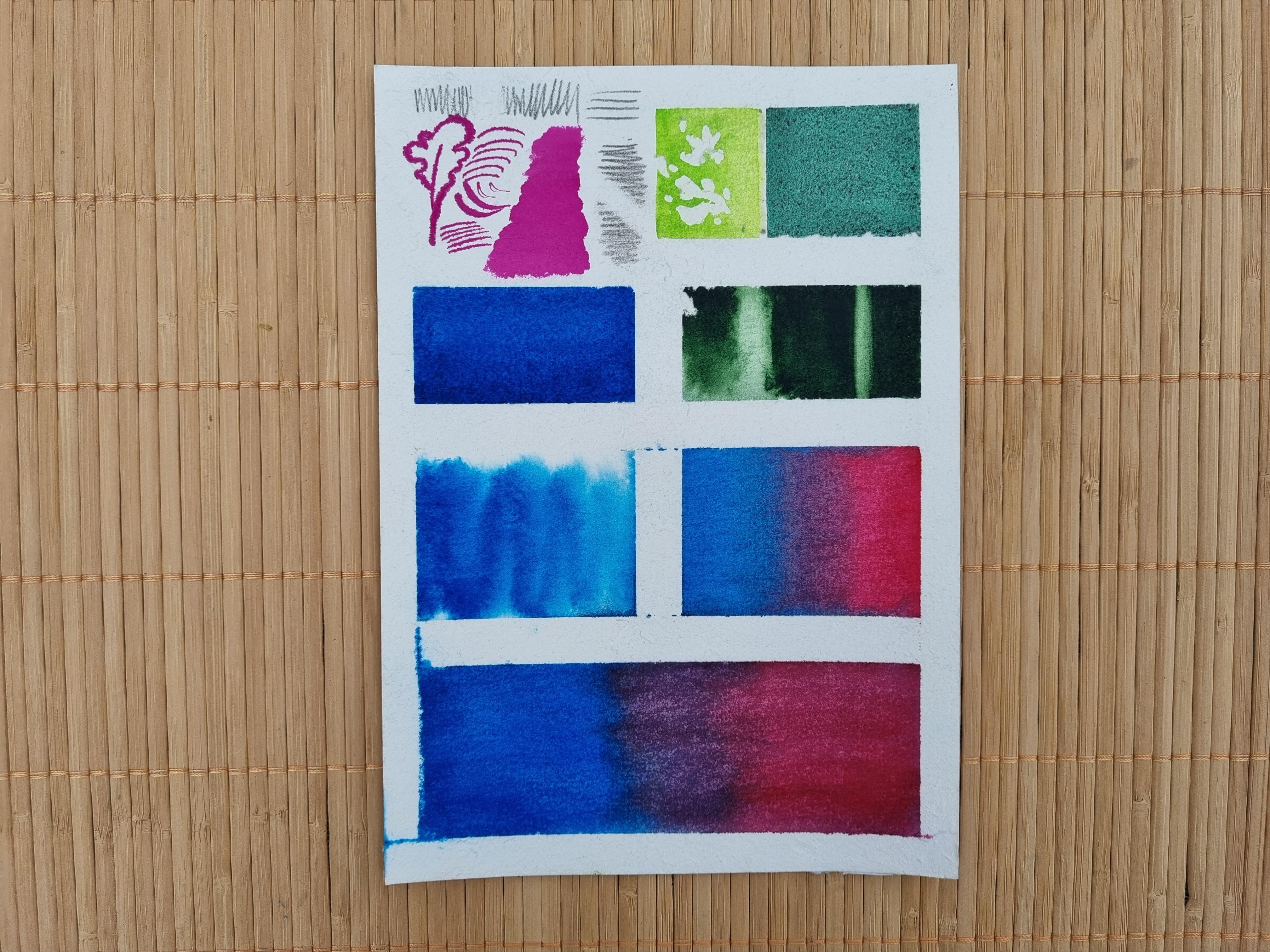 Краска быстро выхватывается листом с кисти, но её получается смешать в плавный градиент. Он получается с плавным затуханием в области контролируемого смешения и тонкими иглами в областях самораспредения.