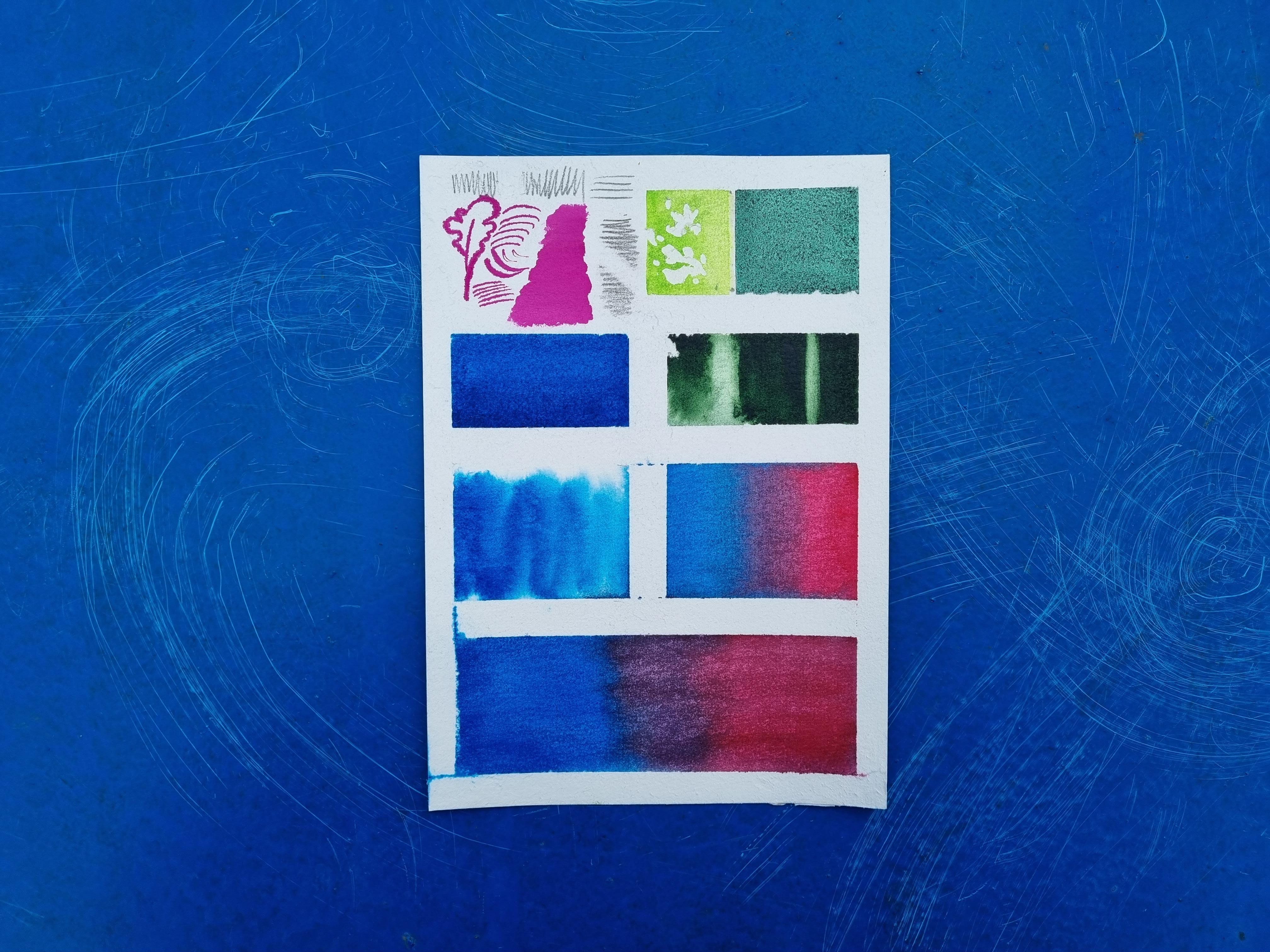 Краска быстро выхватывается листом с кисти, но её получается смешать в плавный градиент. Он получается с плавным затуханием в области контролируемого смешения и тонкими иглами в областях самораспредения.