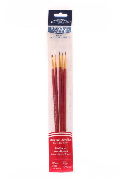 Набор кистей, соболь, длинная ручка: №3/0 (круглая), 1 (круглая), 2 (закругленная), 1 (короткая плоская), 2 (короткая плоская)