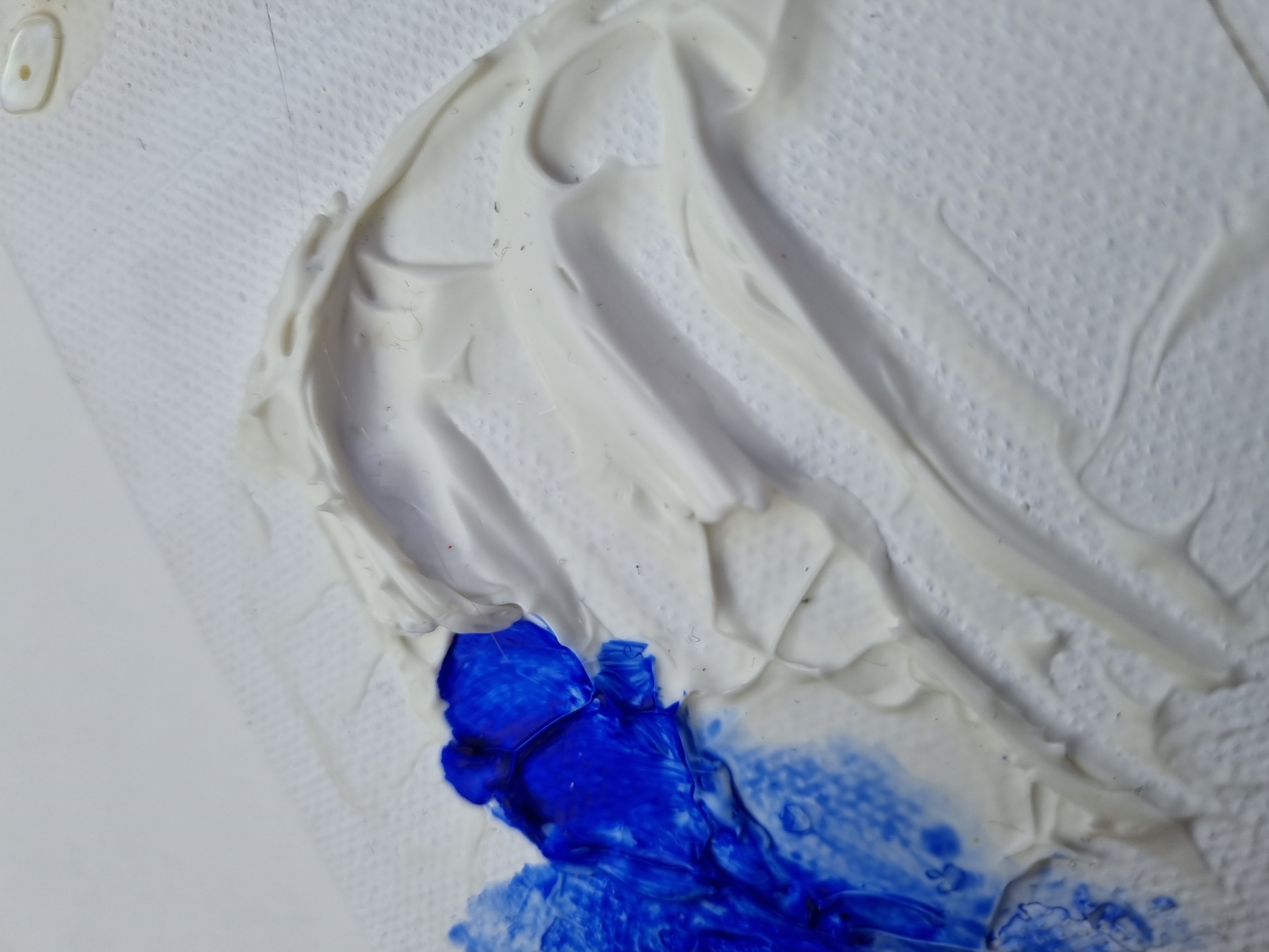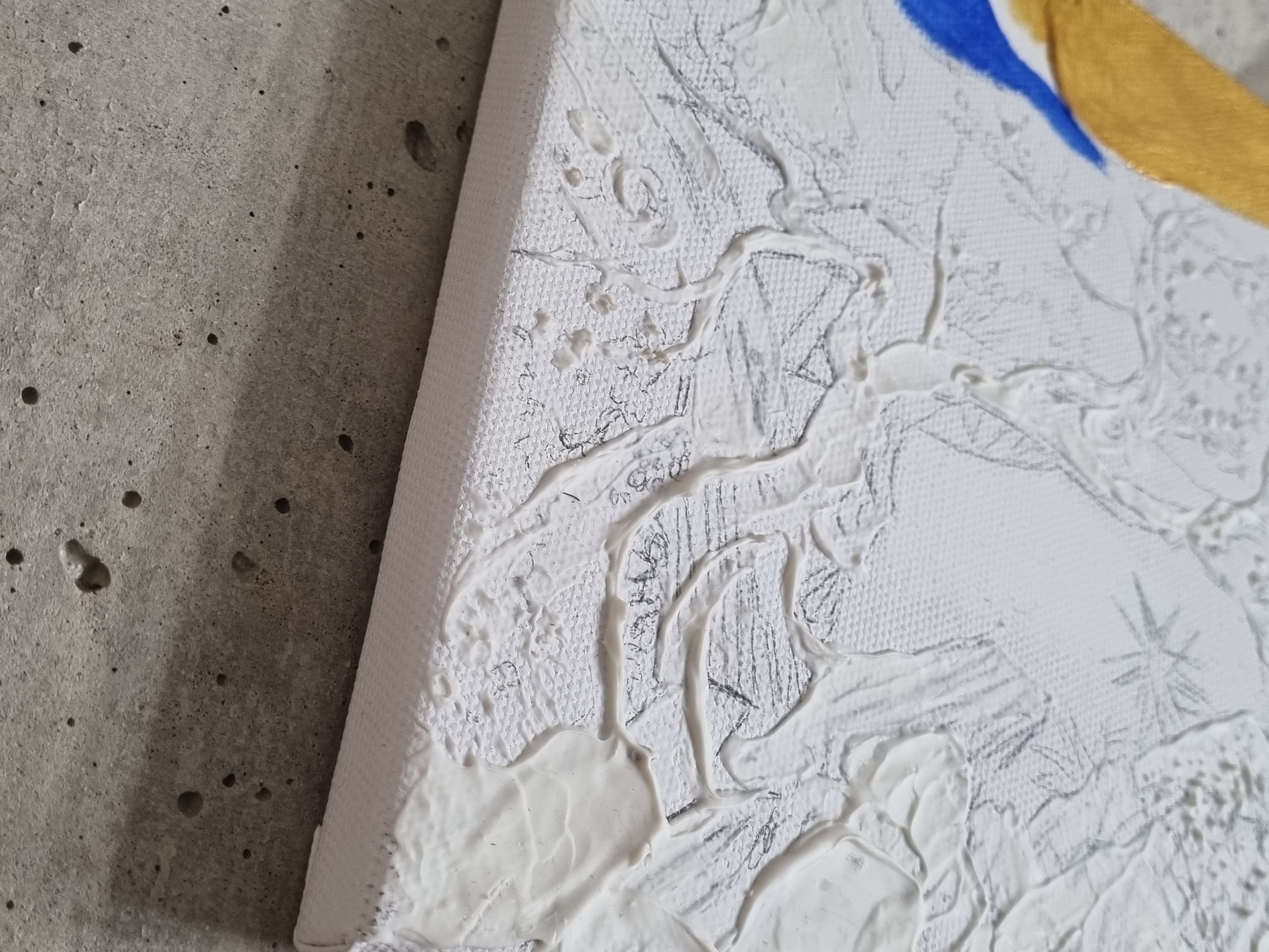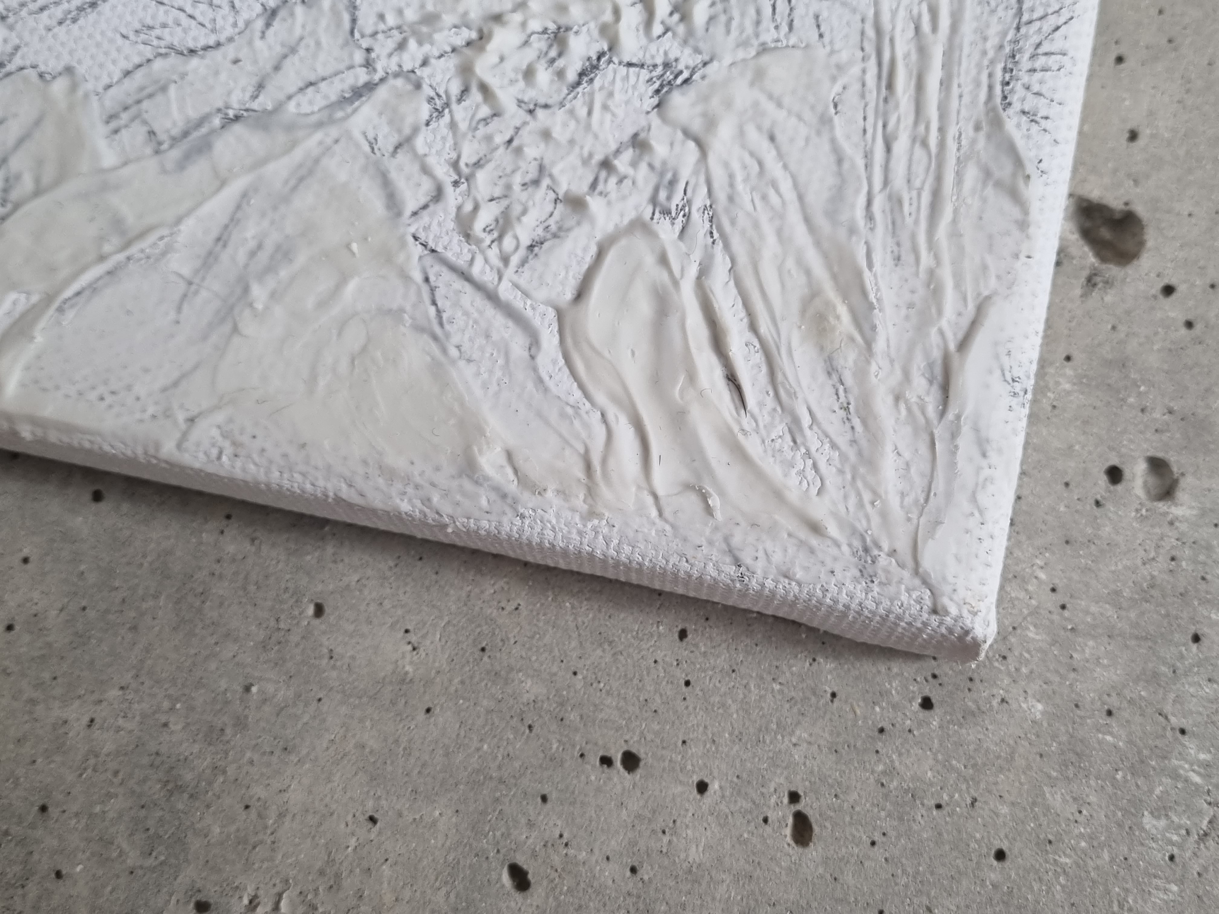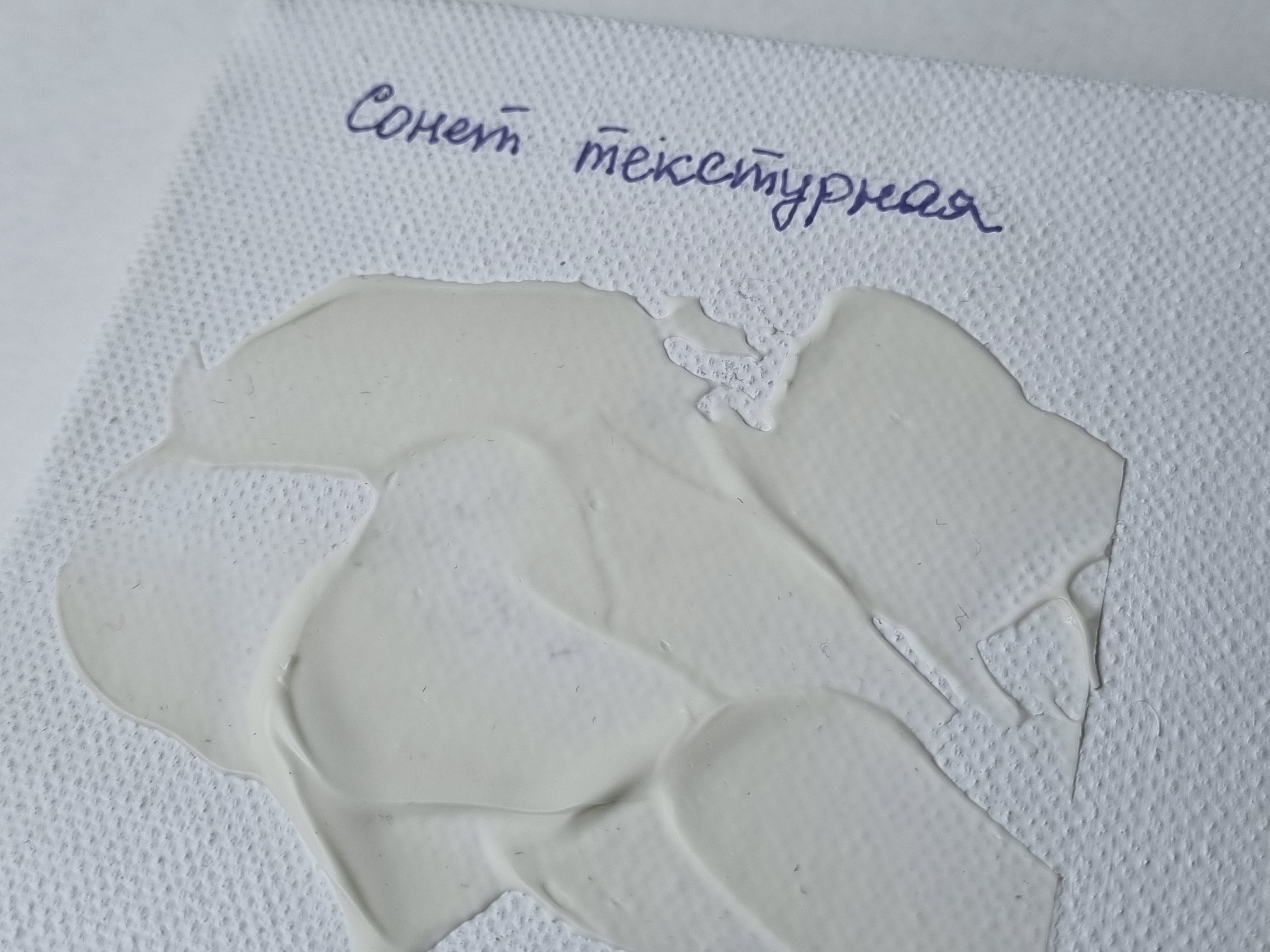 Важно отметить, что слой не трескается на холсте на подрамнике, т.е. на подвижной подложке, что очень важно и вовсе не повсеместно для такого рода материалов. При продавливании с изнанки холста, масса не расходится, образовывая трещины, а демонстрирует прекрасную адгезию с основой и свою целостность.