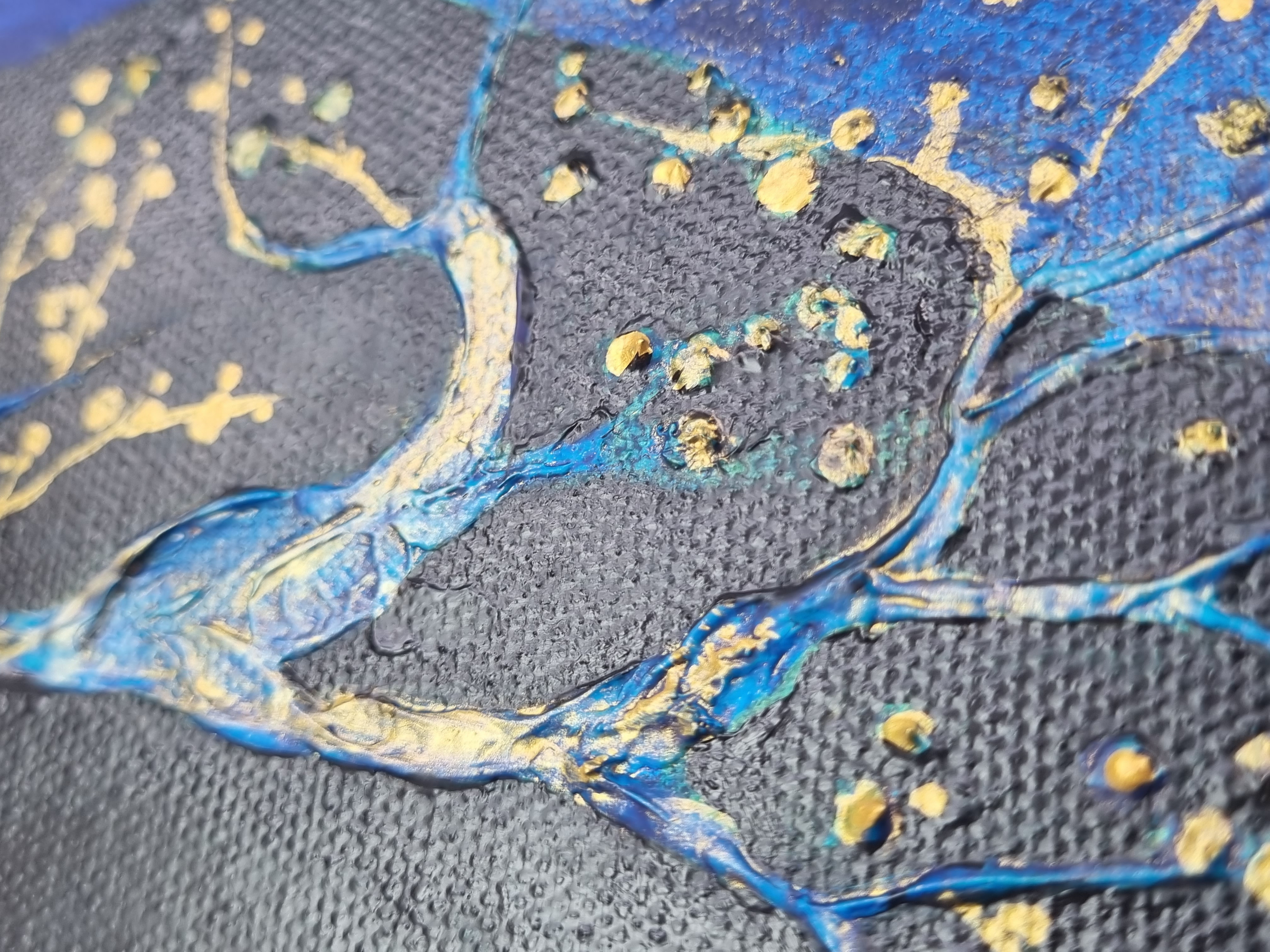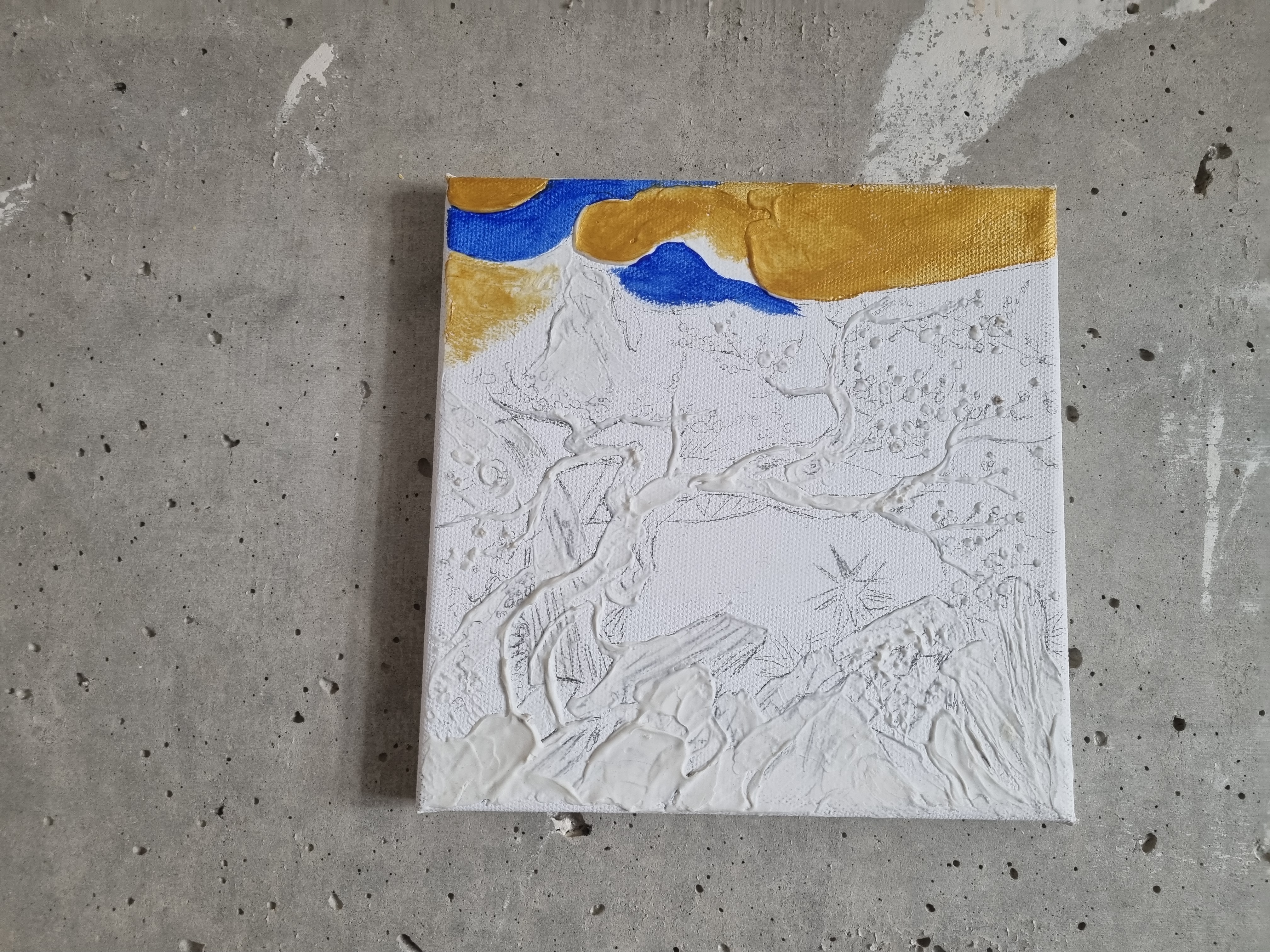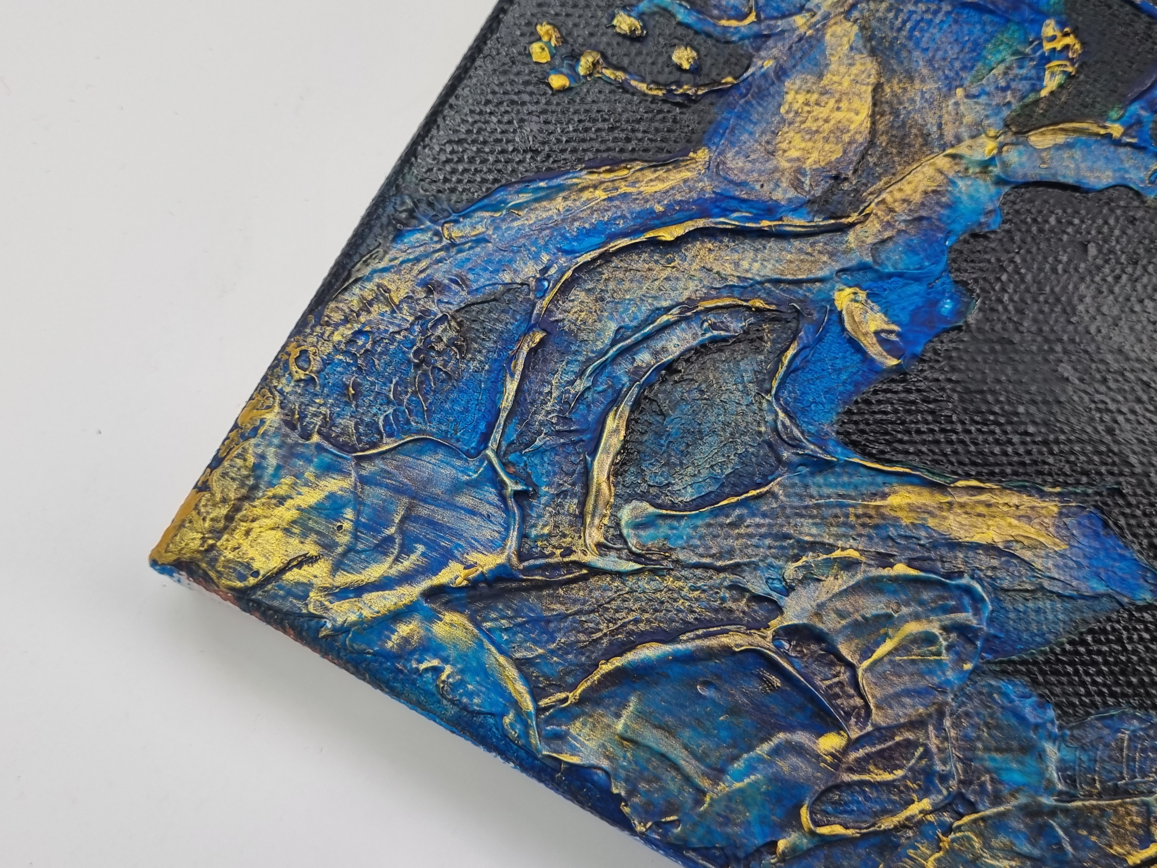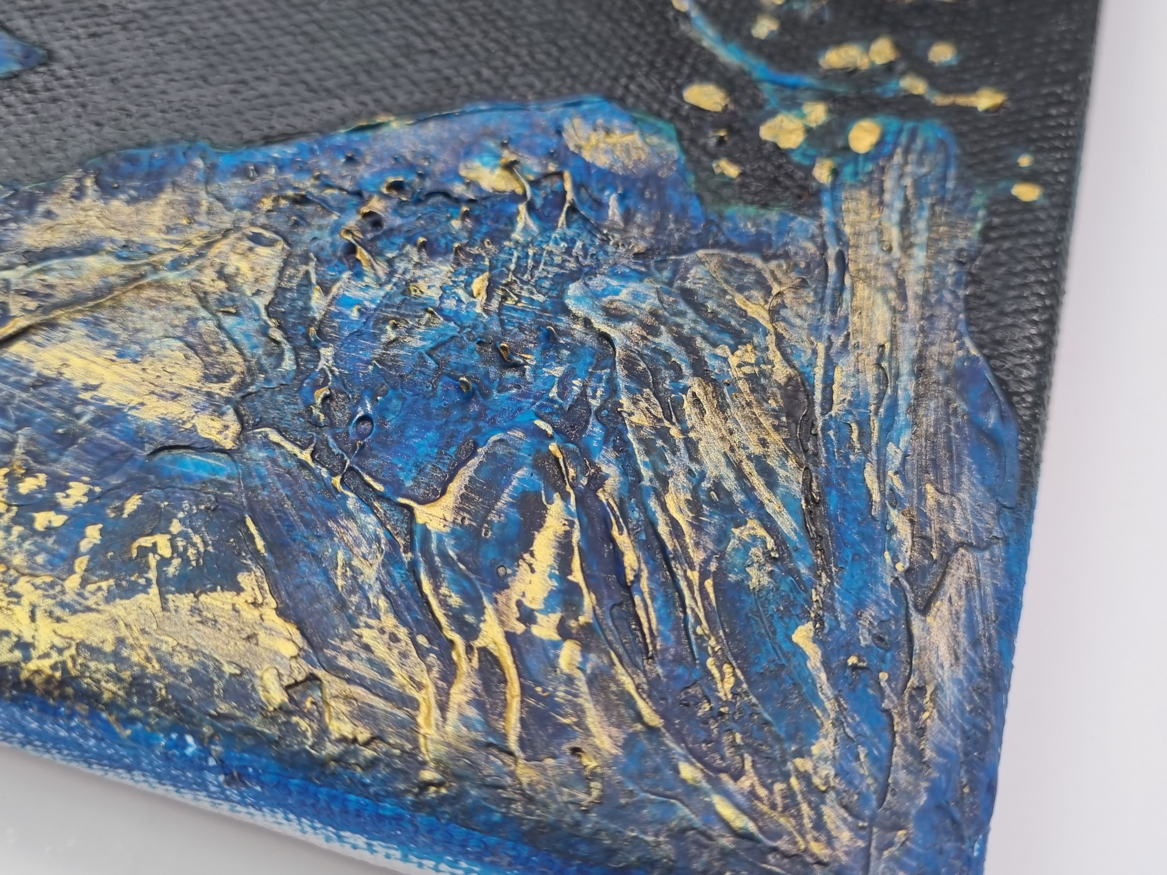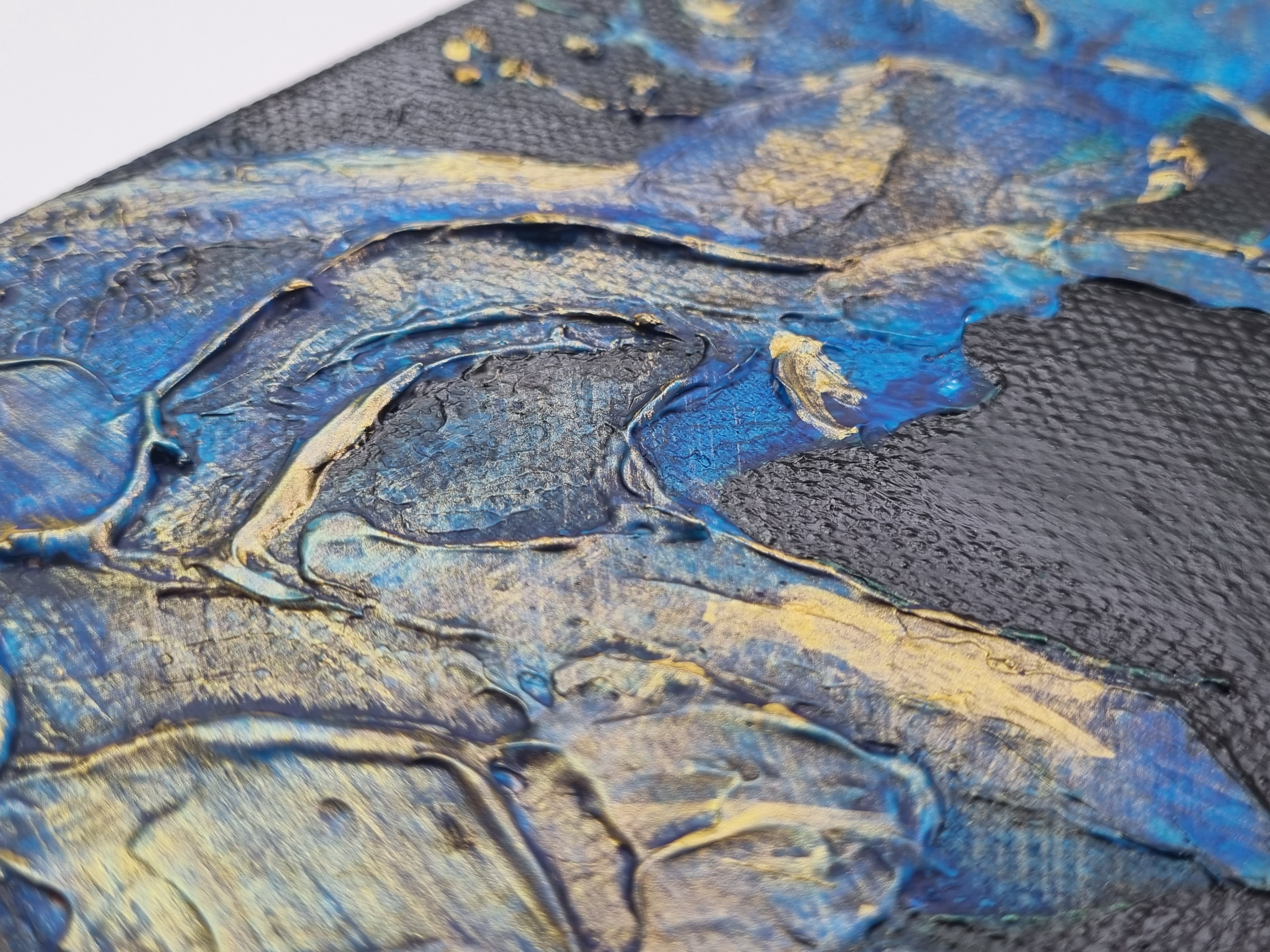 Важно отметить, что слой не трескается на холсте на подрамнике, т.е. на подвижной подложке, что очень важно и вовсе не повсеместно для такого рода материалов. При продавливании с изнанки холста, масса не расходится, образовывая трещины, а демонстрирует прекрасную адгезию с основой и свою целостность.