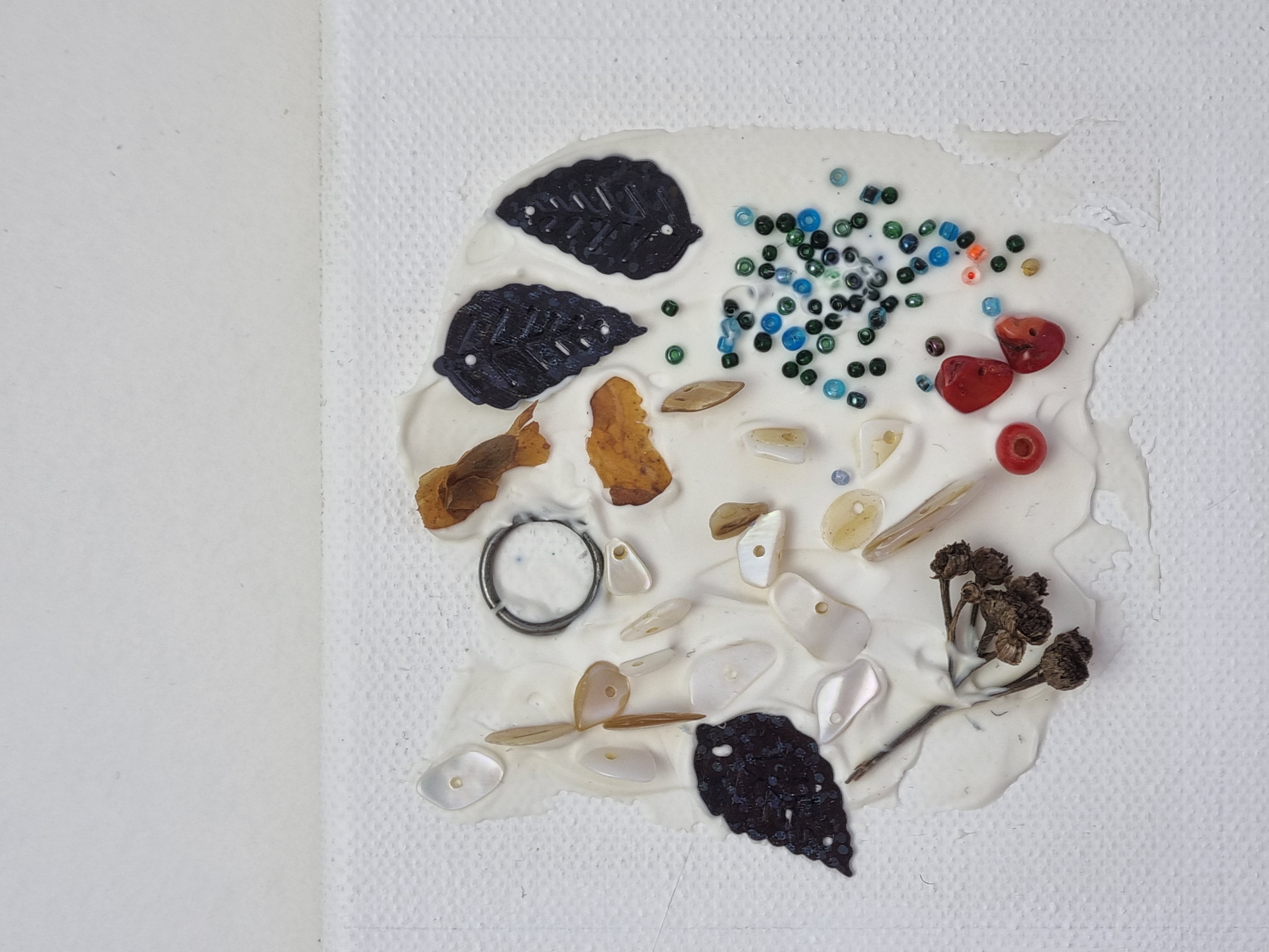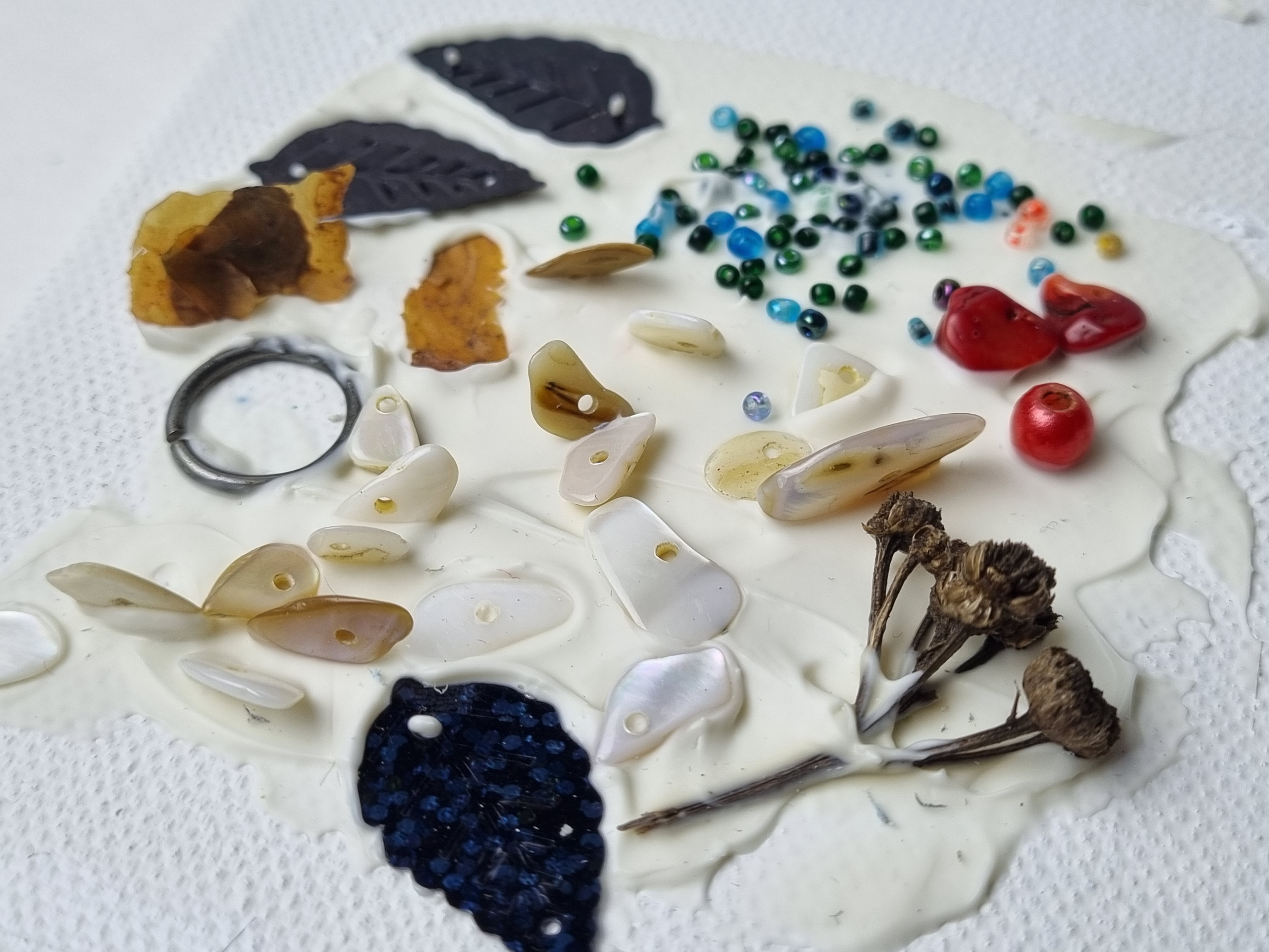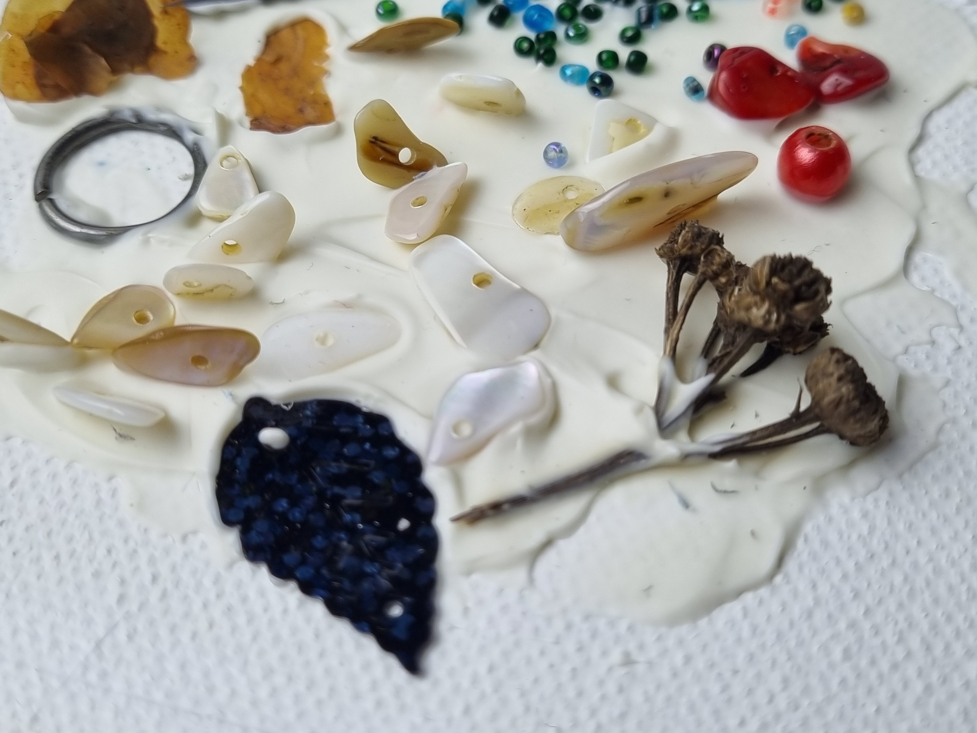 2 накладывается плотный слой и в него вдавливаются включения разного рода (бусины, сухоцветы, пайетки)