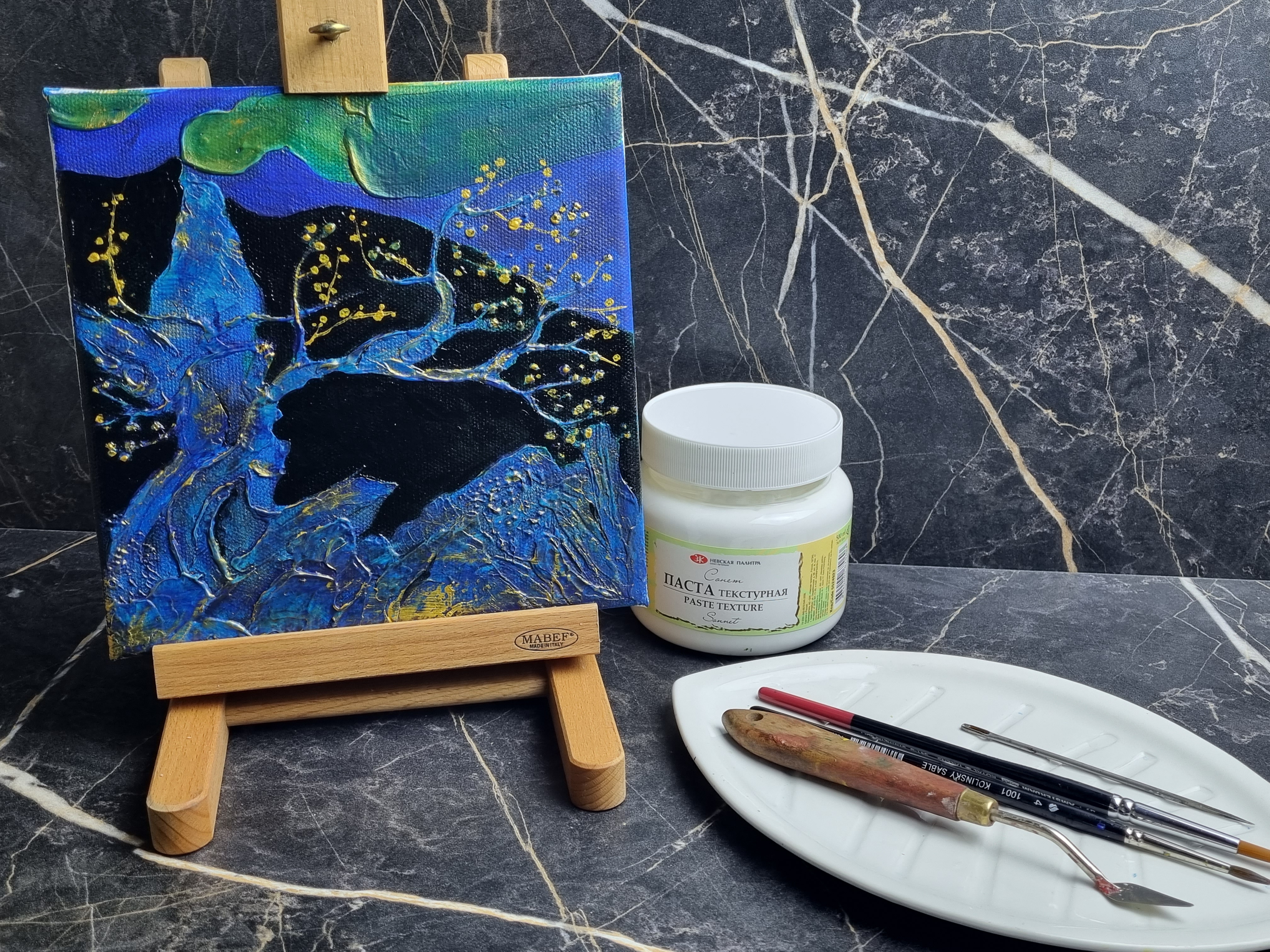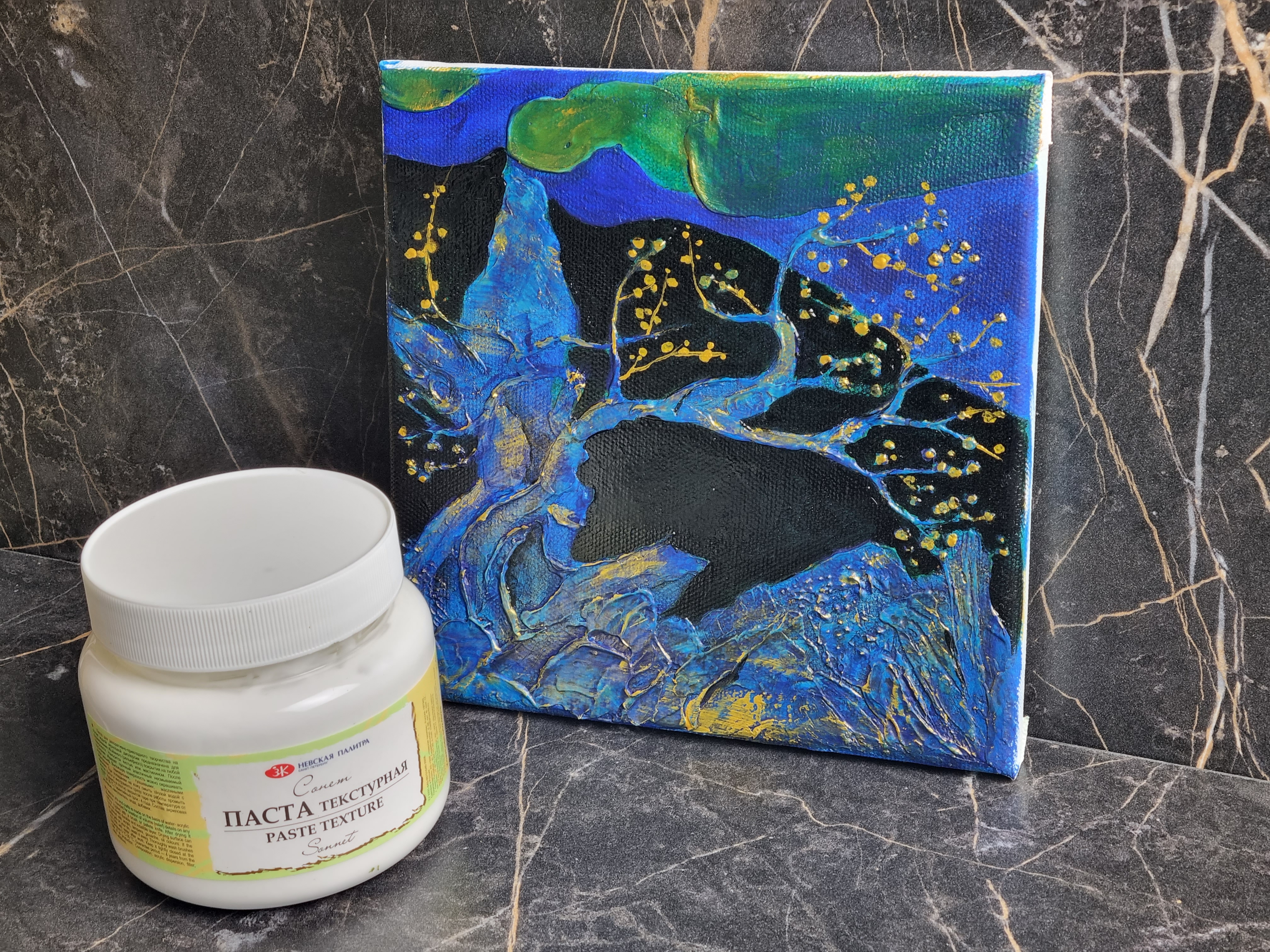 Структурную пасту "Сонет" используют также в объемной живописи. Можно сочетать с декупажем для создания объемных форм, для фиксирования любых небольших включений.