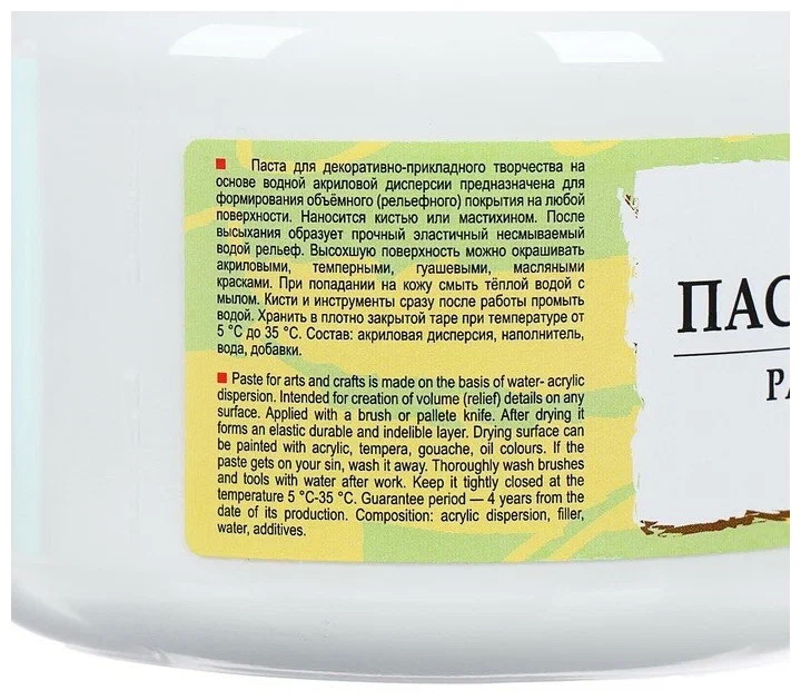 Густая, эластичная, моделирующая, белая паста на водной основе. Для получения дополнительных цветовых оттенков паста смешивается с акриловыми красками.