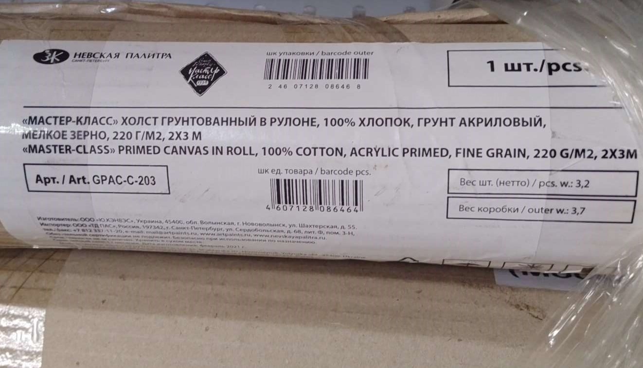 Холст грунтованный, в рулоне м/з, 2,0х3,0 м,100% хлопок, плотность 220 г/м2,акриловый грунт
