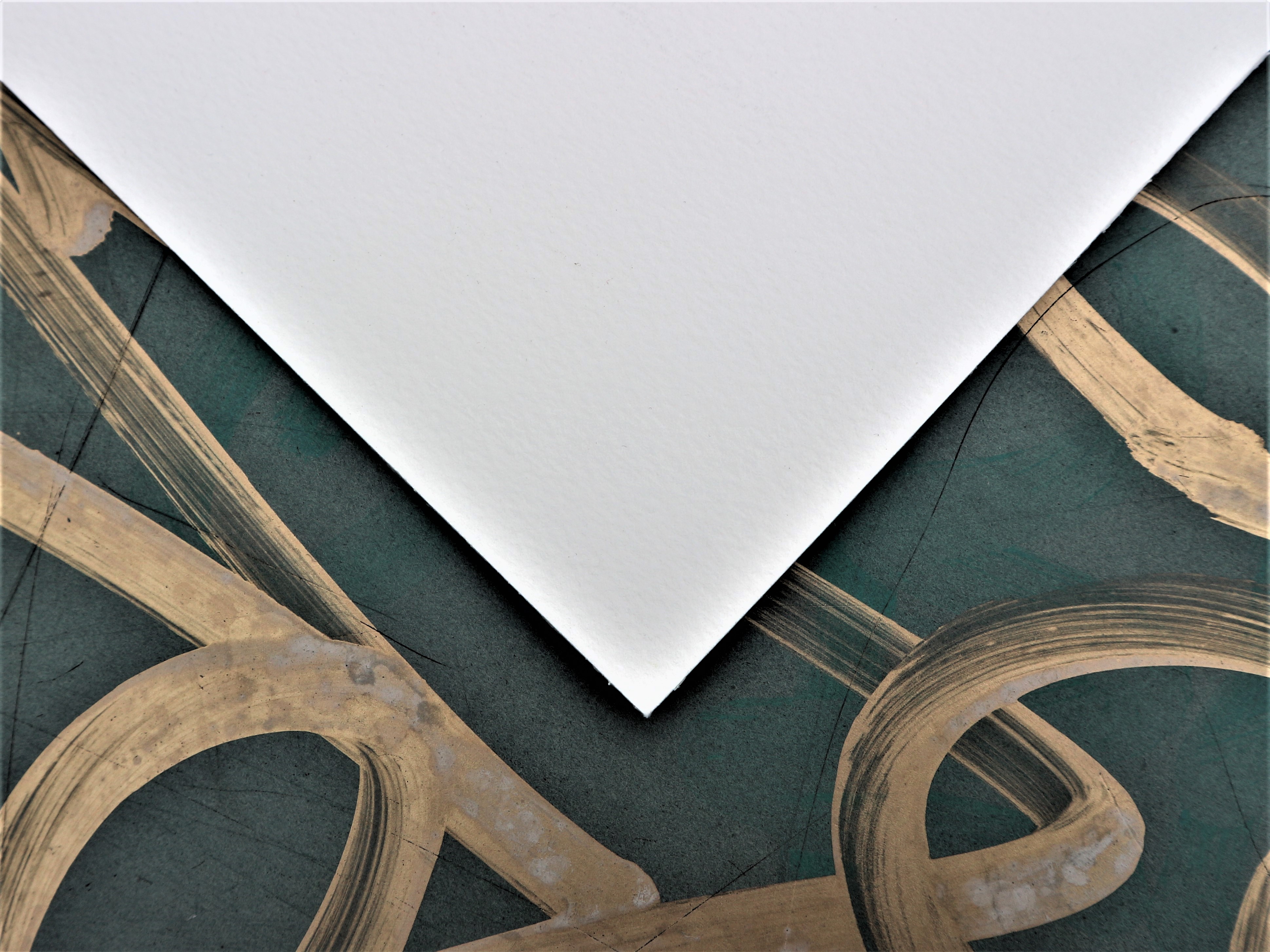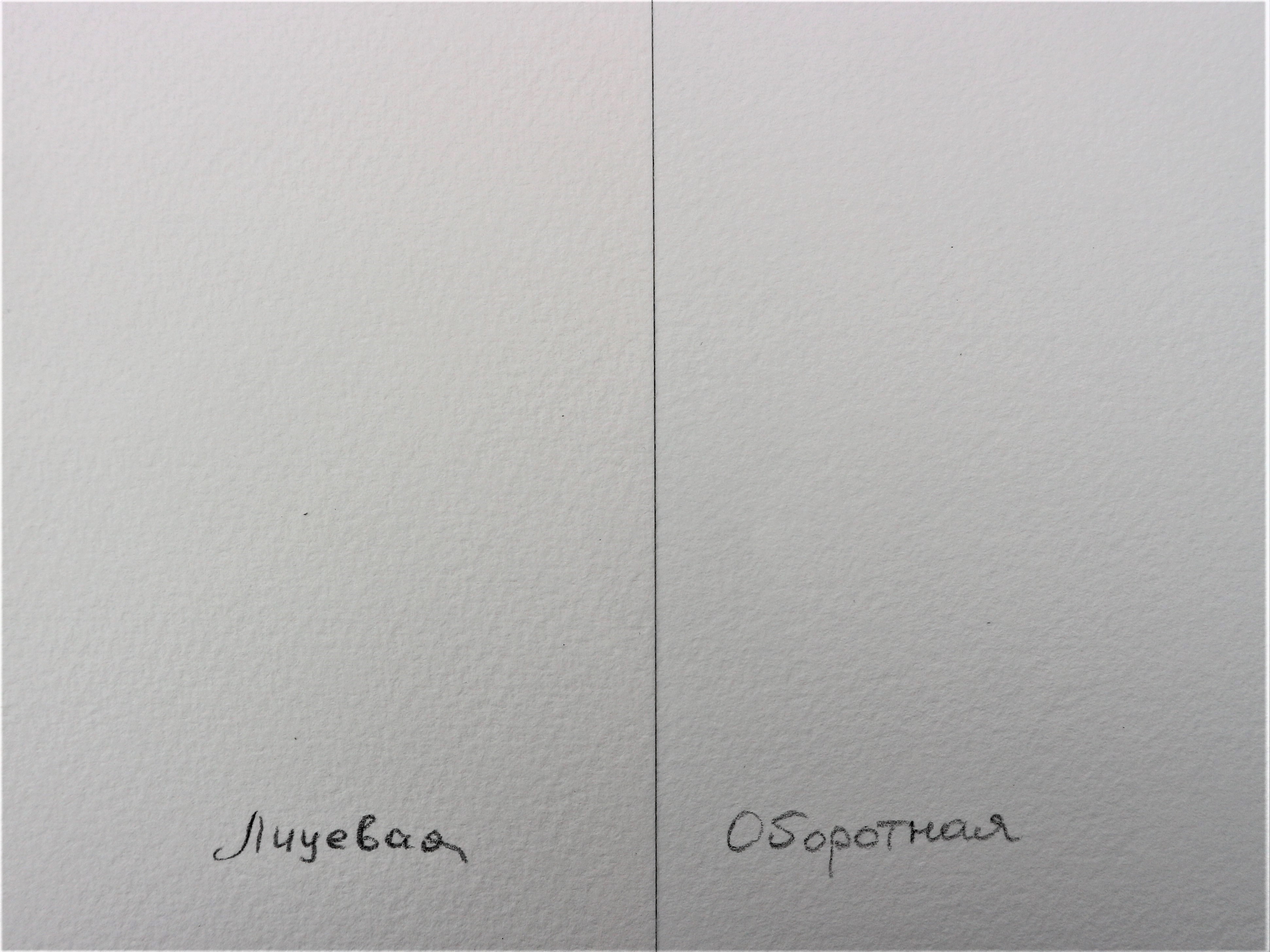 Если провести сравнение с бумагой для смешанных техник с тем же процентом содержания хлопка, в 60%, то у акварельной версии визуально гораздо более выраженная текстура и более кремовый цвет листа.