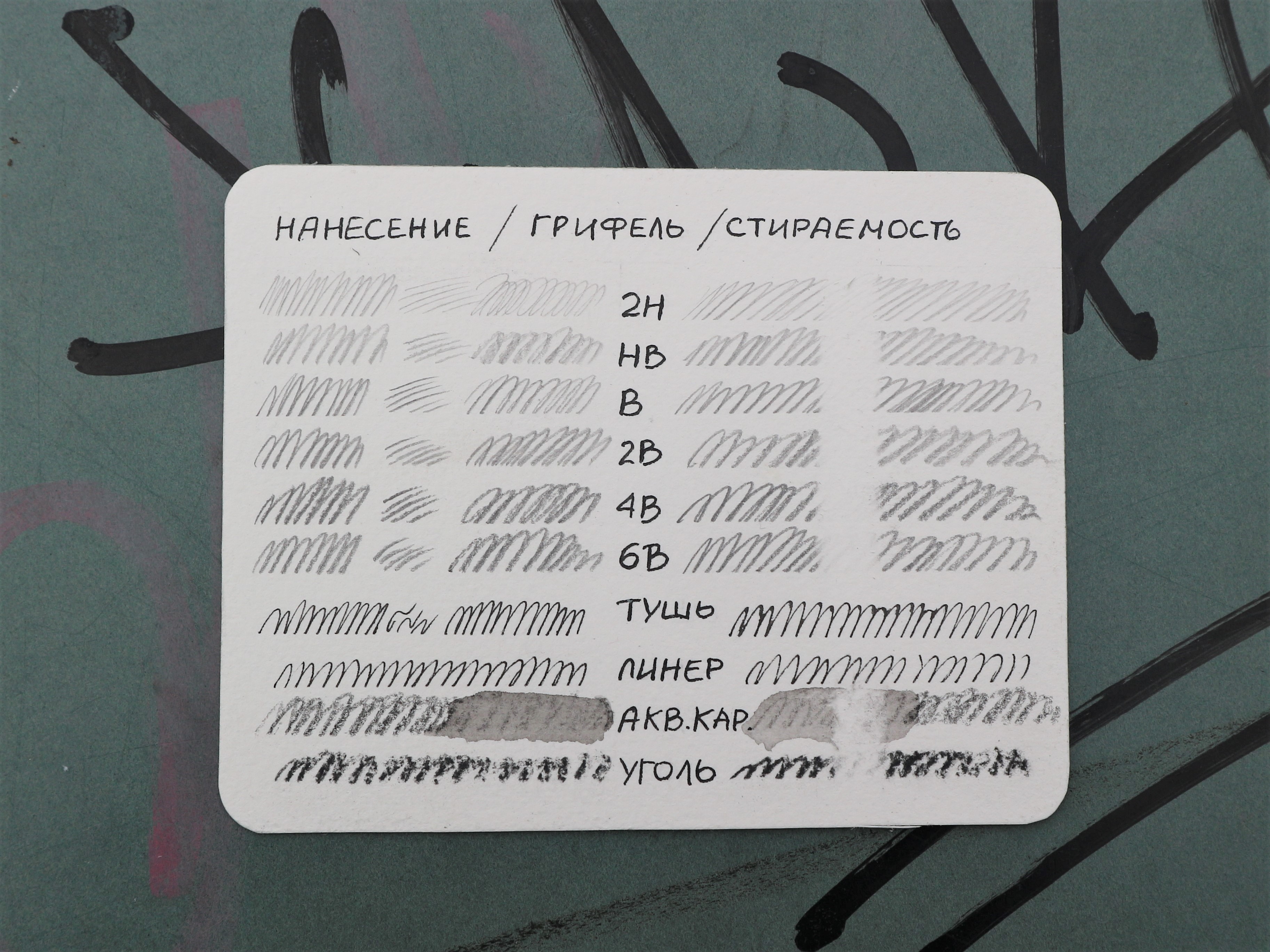 Пример с нанесением графических материалов и их удаления с листа, показал, что и твёрдый грифель 2H и экстра-мягкий грифель 6B стирается с поверхности почти в ноль. Следы от сильного нажима остаются только от 2H, HB и немного от B. Размытый акварельный карандаш стирается, но оставляет следы усталости, а вот уголь стирается безболезненно, но частично проникает в поры бумаги.