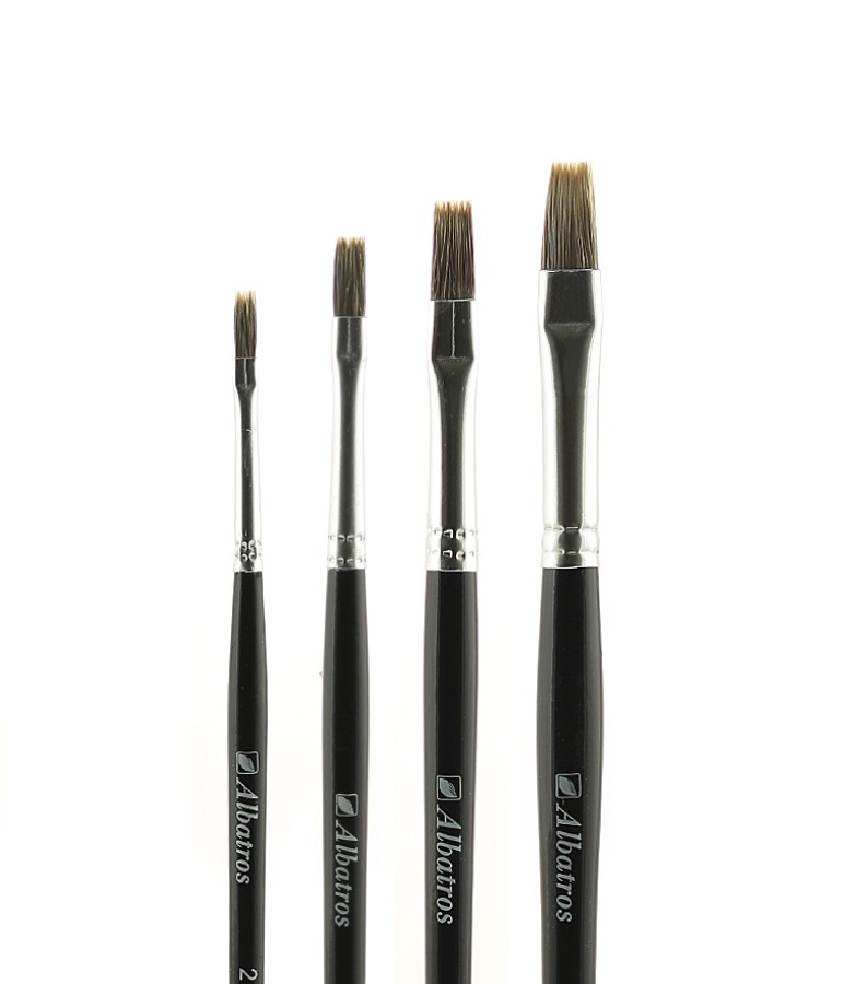 Кисти художественные из горного колонка. Цельнотянутая алюминиевая обойма, короткая, глянцевая черная ручка.