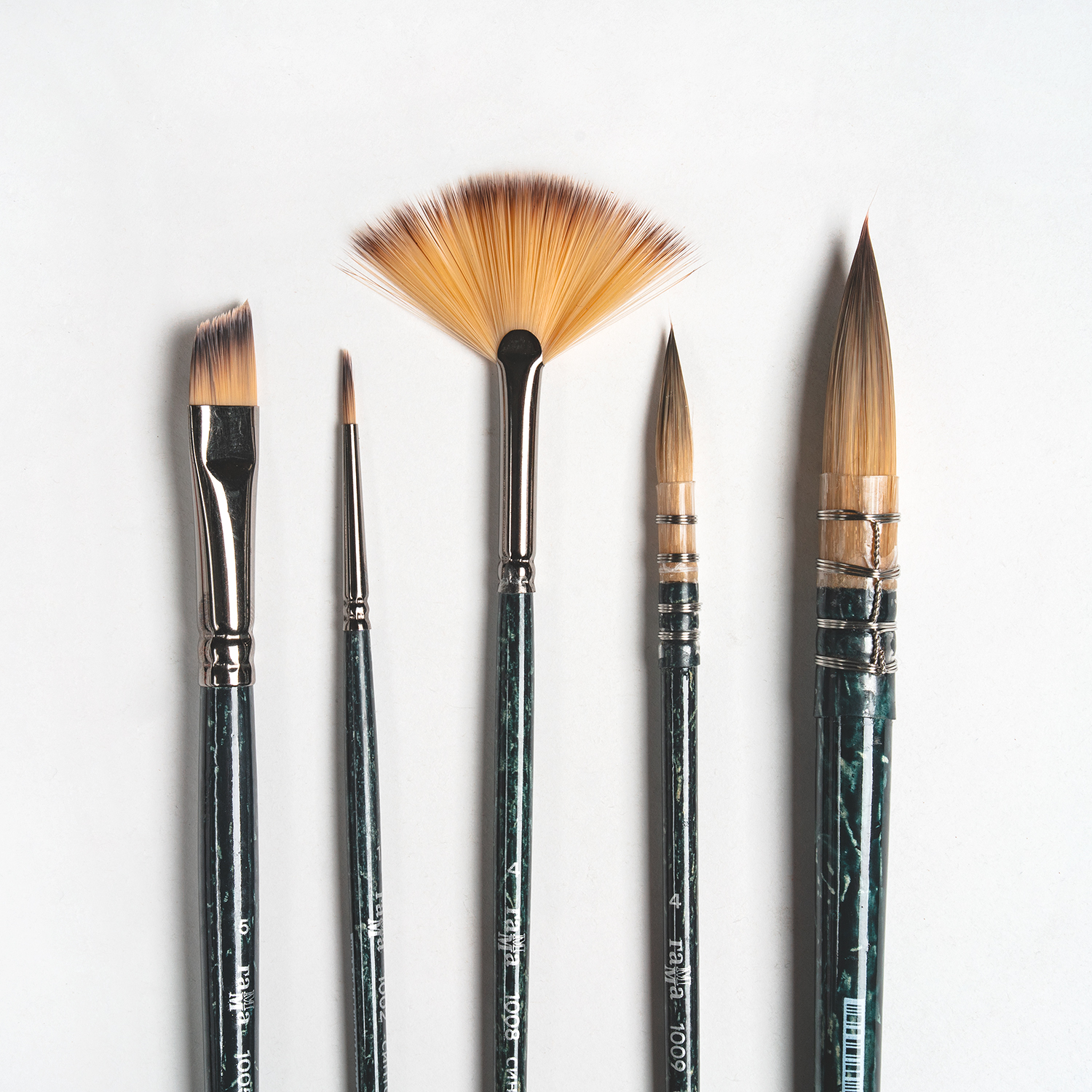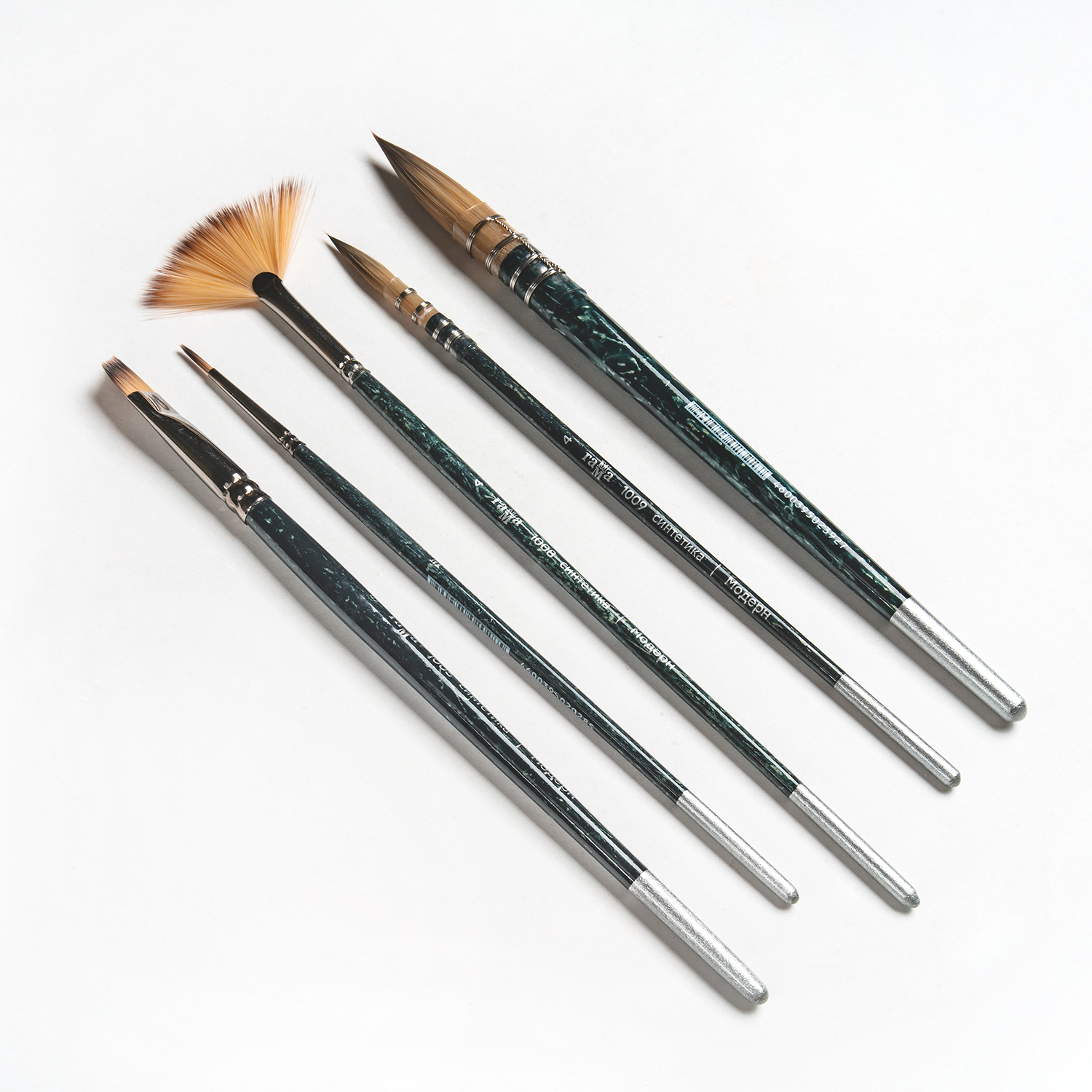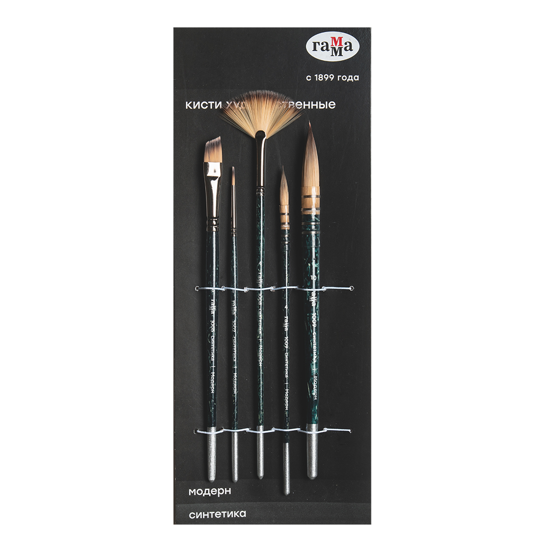 Набор состоит из 5-ти кистей серии "Модерн": веерная №4, круглая №2, плоская скошенная №5, круглая №4 с французской обоймой и №10.