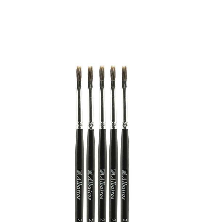 Кисти художественные из горного колонка. Цельнотянутая алюминиевая обойма, короткая, глянцевая черная ручка.