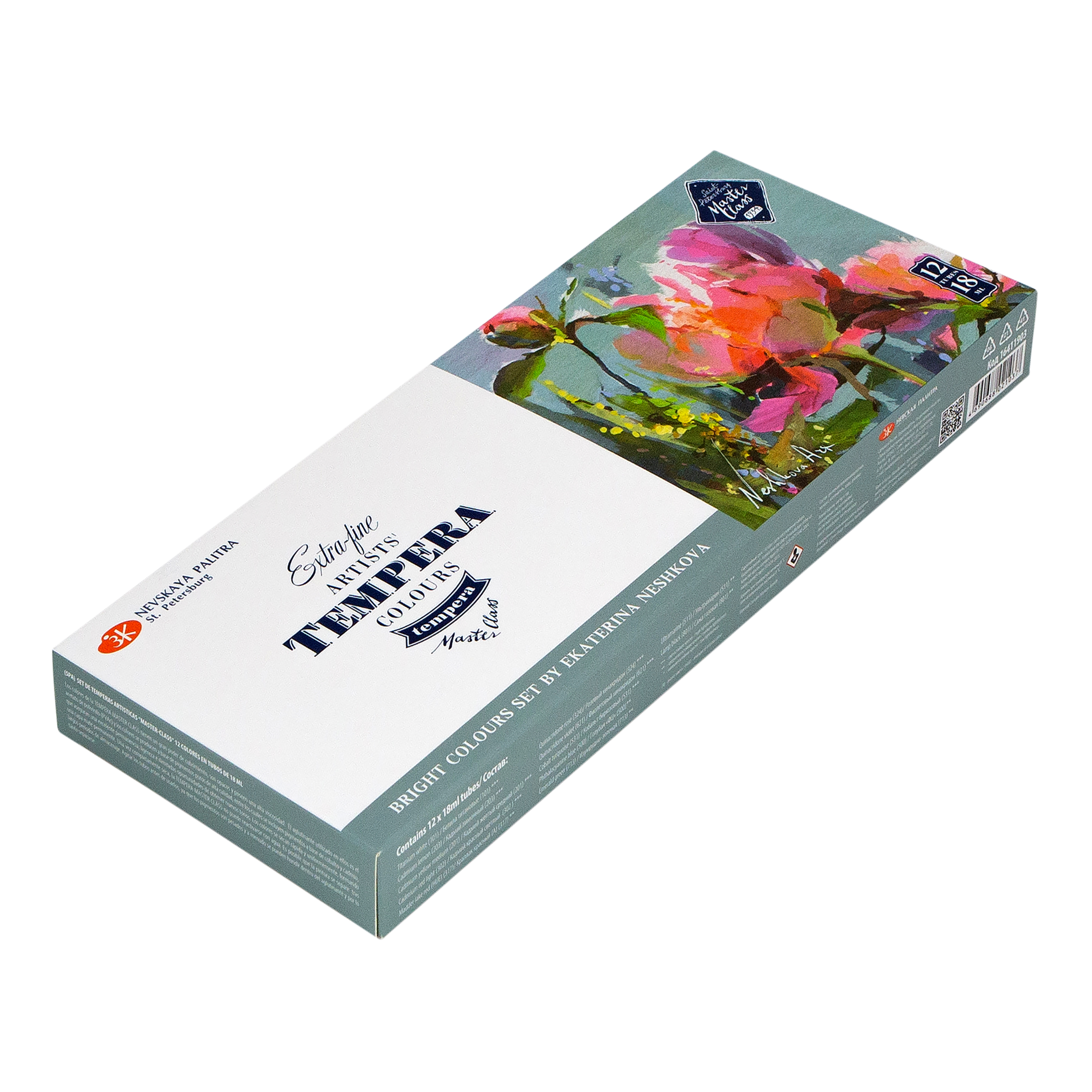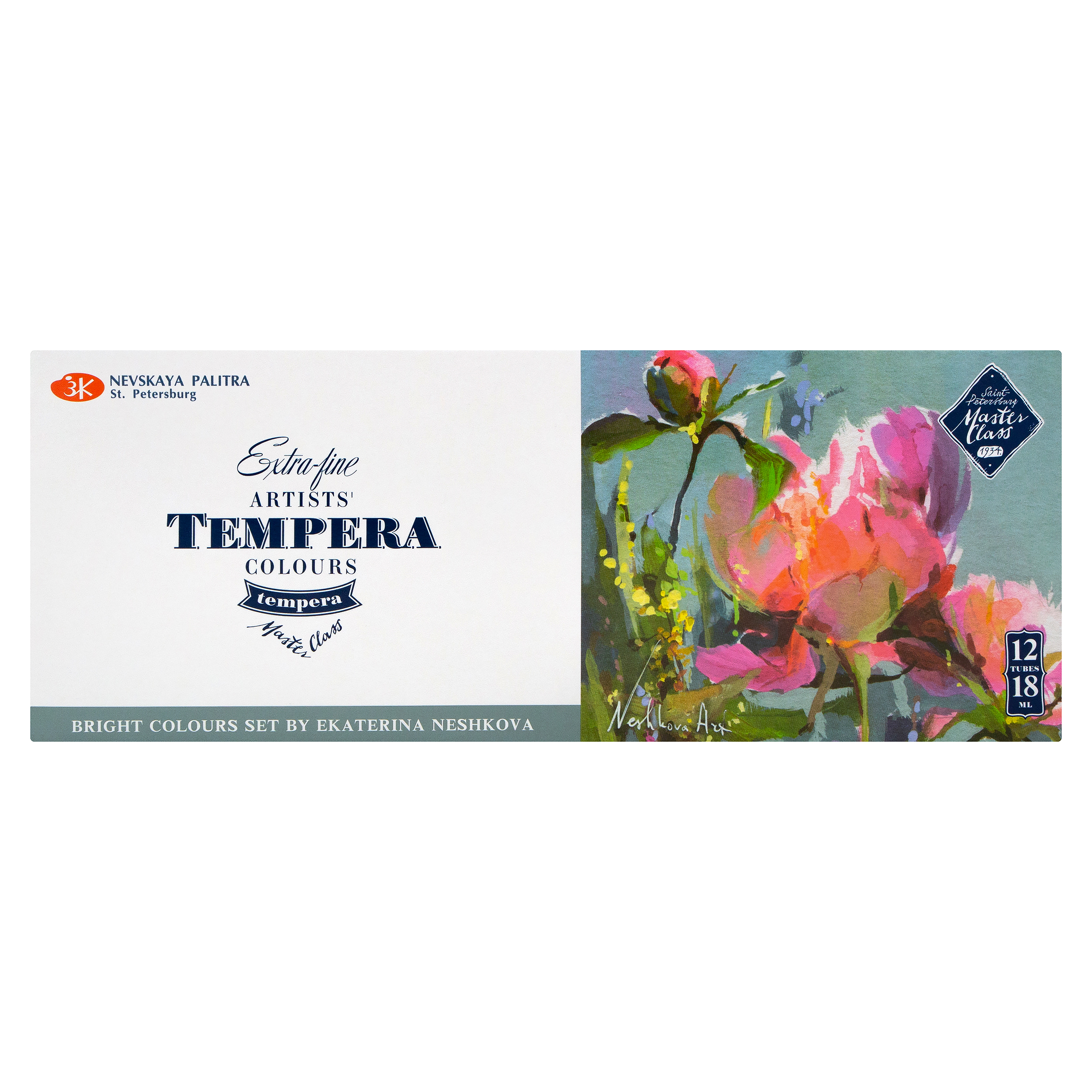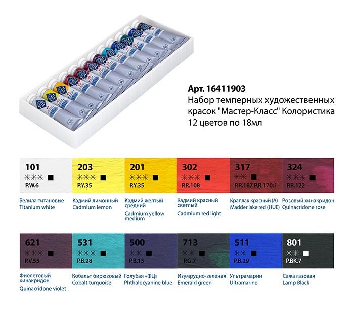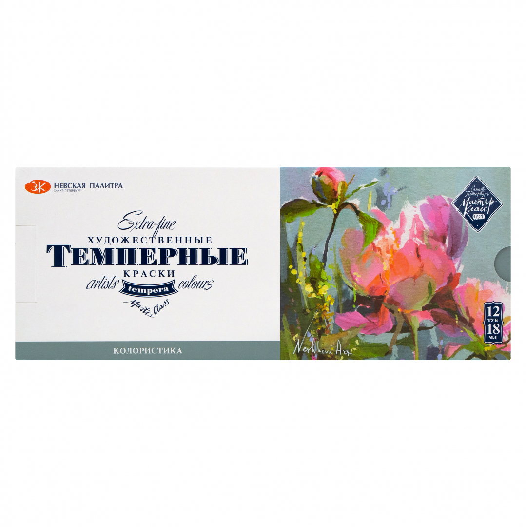 Художественные темперные поливинилацетатные краски «Мастер-Класс» изготавливаются на основе органических и неорганических пигментов и поливинилацетатной дисперсии и являются традиционным материалом для живописи. Благодаря тщательно подобранным компонентам темперные краски прекрасно подходят для живописных и декоративно-оформительских работ. Большинство цветов в палитре монопигментные и обладают высочайшим показателем светостойкости. Все краски выкопигментированные, яркие и чистые. Темпера «Мастер-Класс» позволяет получить многообразие благородных оттенков в разбелах и смесях. Краски легко наносятся на бумагу, картон, дерево, керамику, грунтованный и негрунтованный холст. При высыхании образуют эластичную, непрозрачную, несмываемую пленку. Палитра набора подобрана художницей Екатериной Нешковой.
