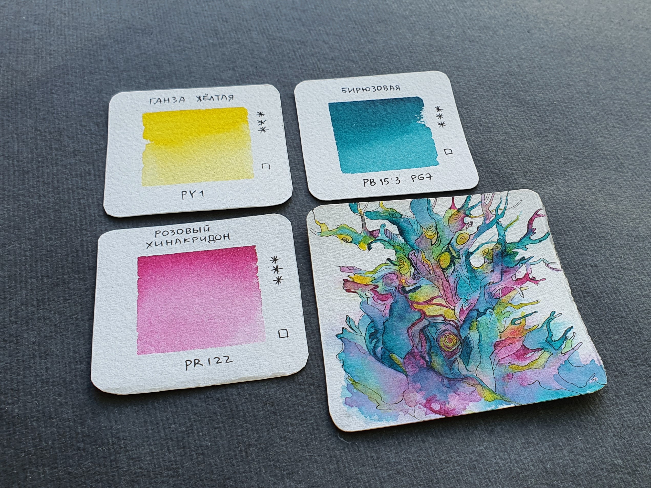 В составе красок гуммиарабик высшей степени очистки и высококачественные пигменты, которые обеспечивают насыщенность цветов, чистоту и прозрачность красочного слоя.