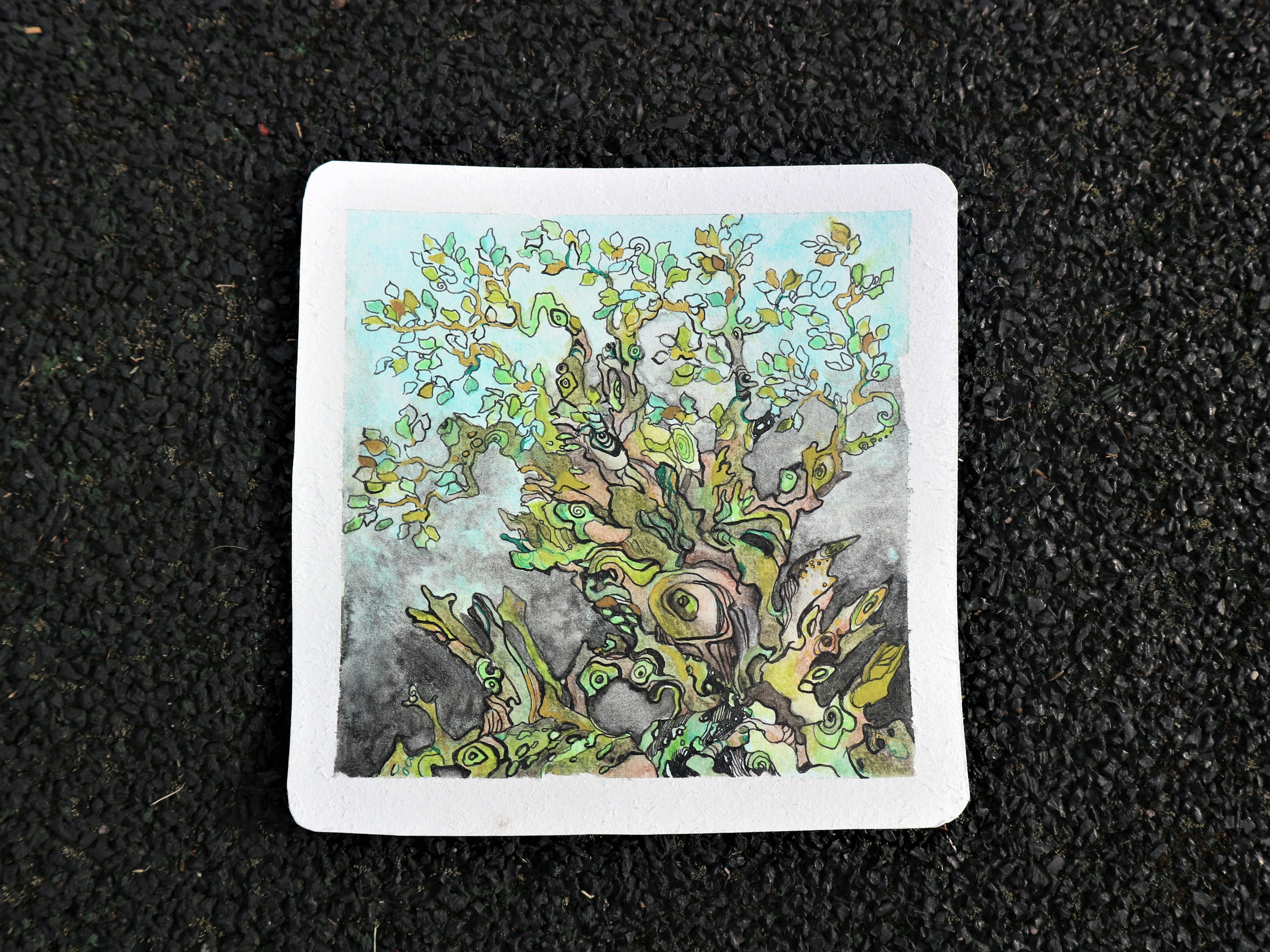 Следом прорисованы элементы дерева при помощи акварельных карандашей и зелёной гелевой ручки. Затем весь рисунок был прокрашен полупрозрачной перламутровой голубой акриловой краской, которая словно залакировала поверхность. Уже поверх образованной плёнки наносились штрихи золотой гелевой ручкой и оливковой и чёрной гуашью. Окончательные штрихи были нанесены тушью.