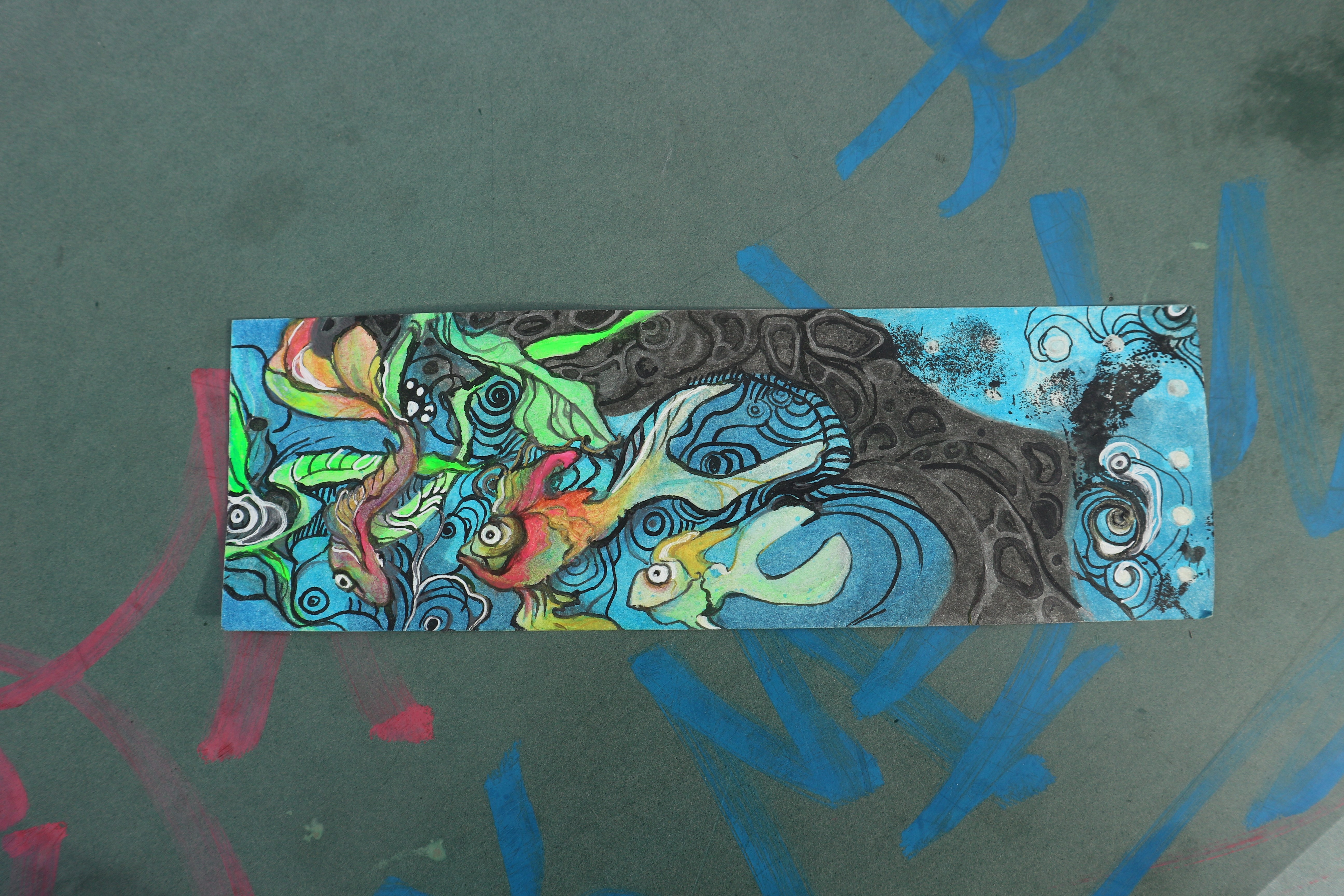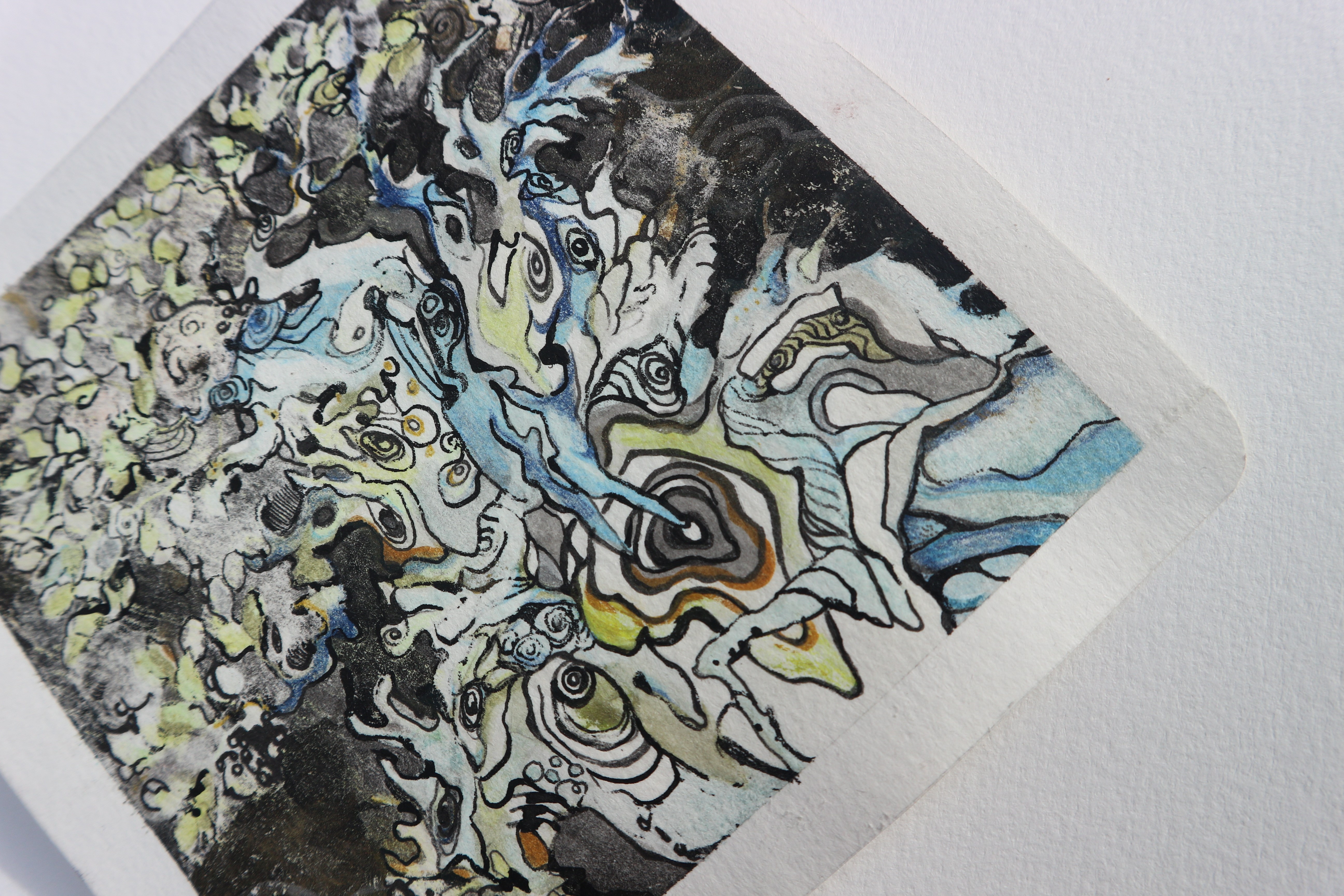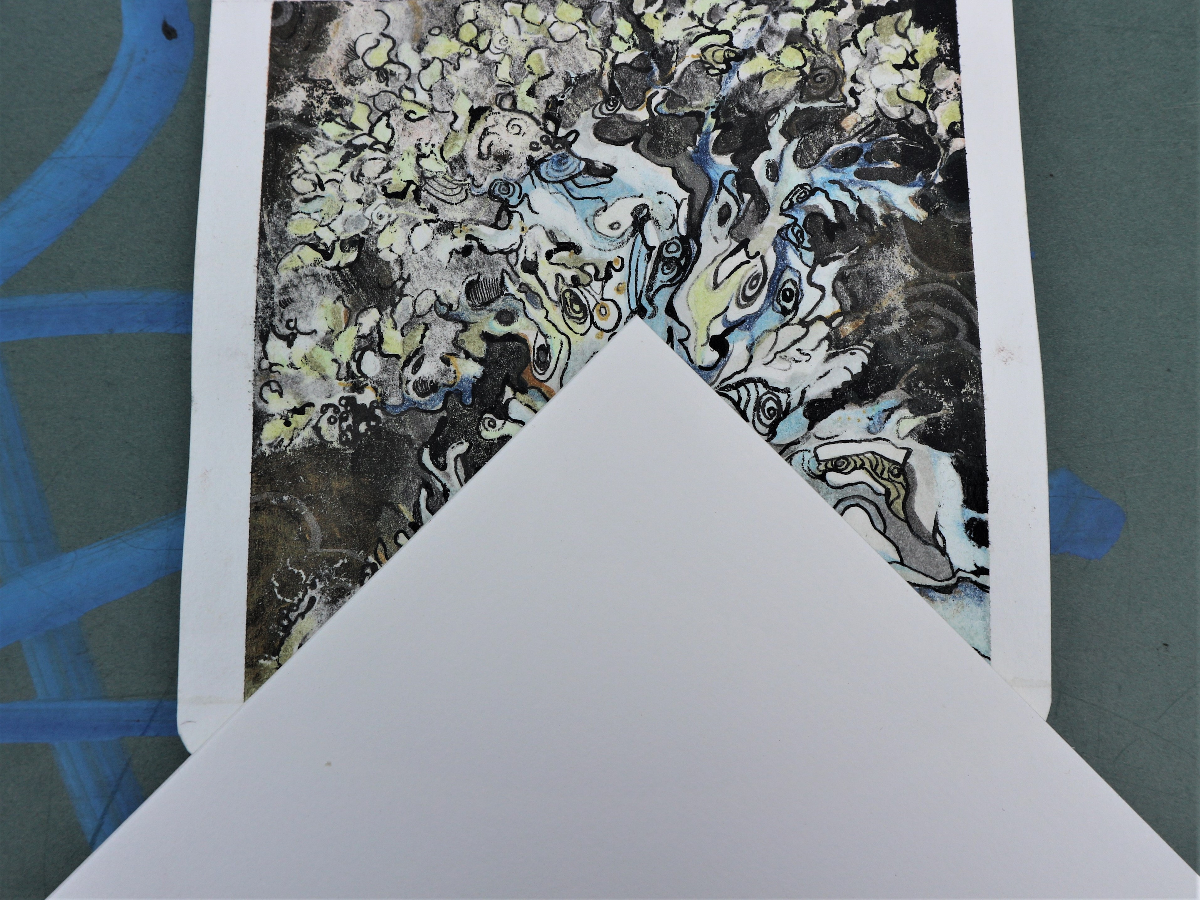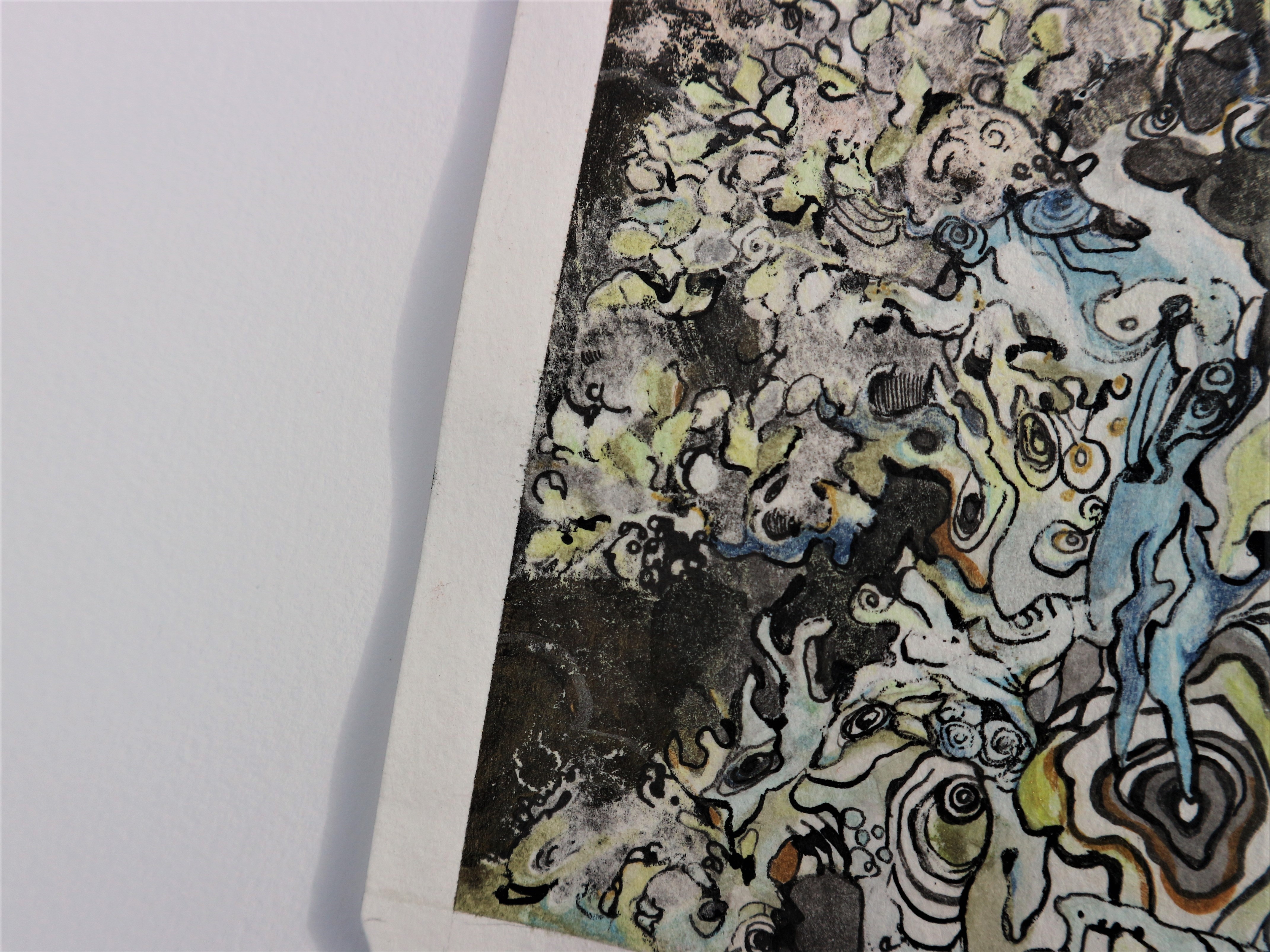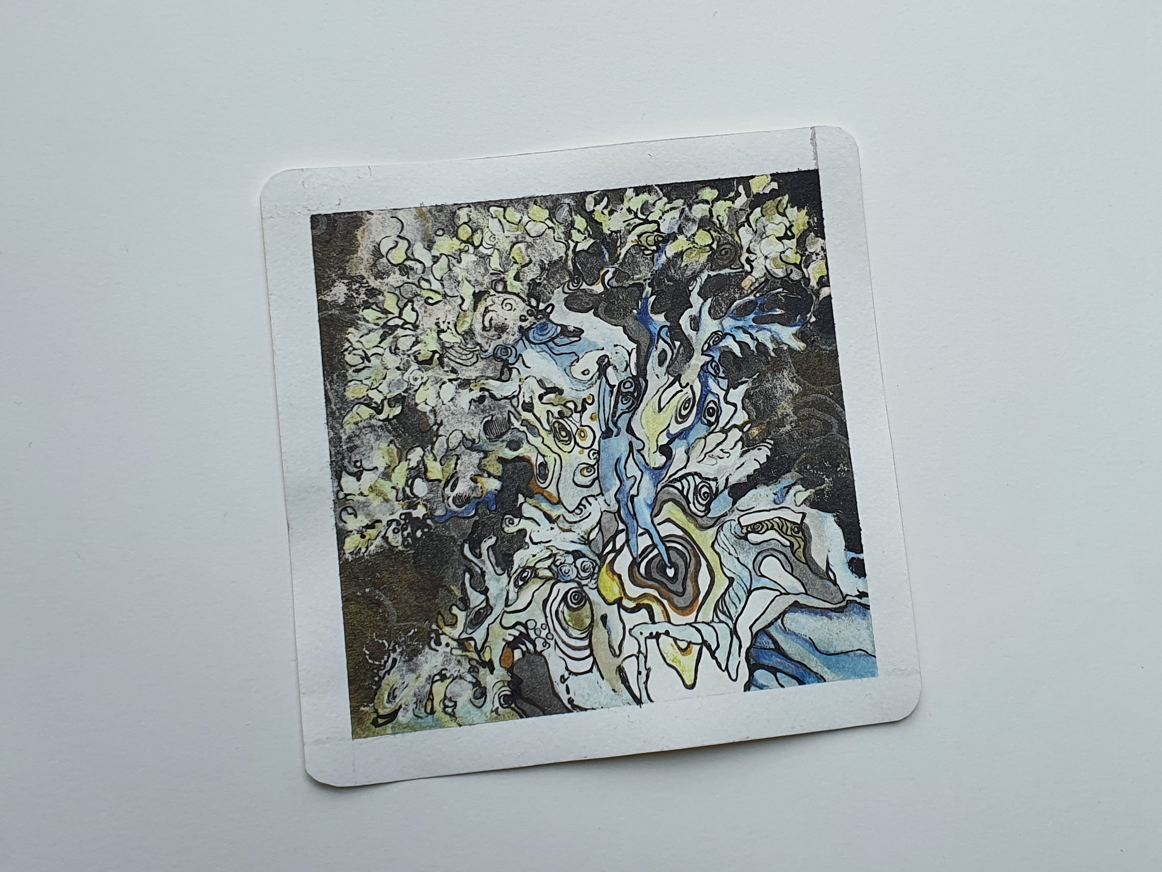 После игры с фоном, само дерево показалось слишком светлым и была применена тушь, нанесённая пером. Краски стали очень интенсивными, работа-очень тёмной и было решено провести эксперимент, который мог полностью уничтожить работу, или её спасти.