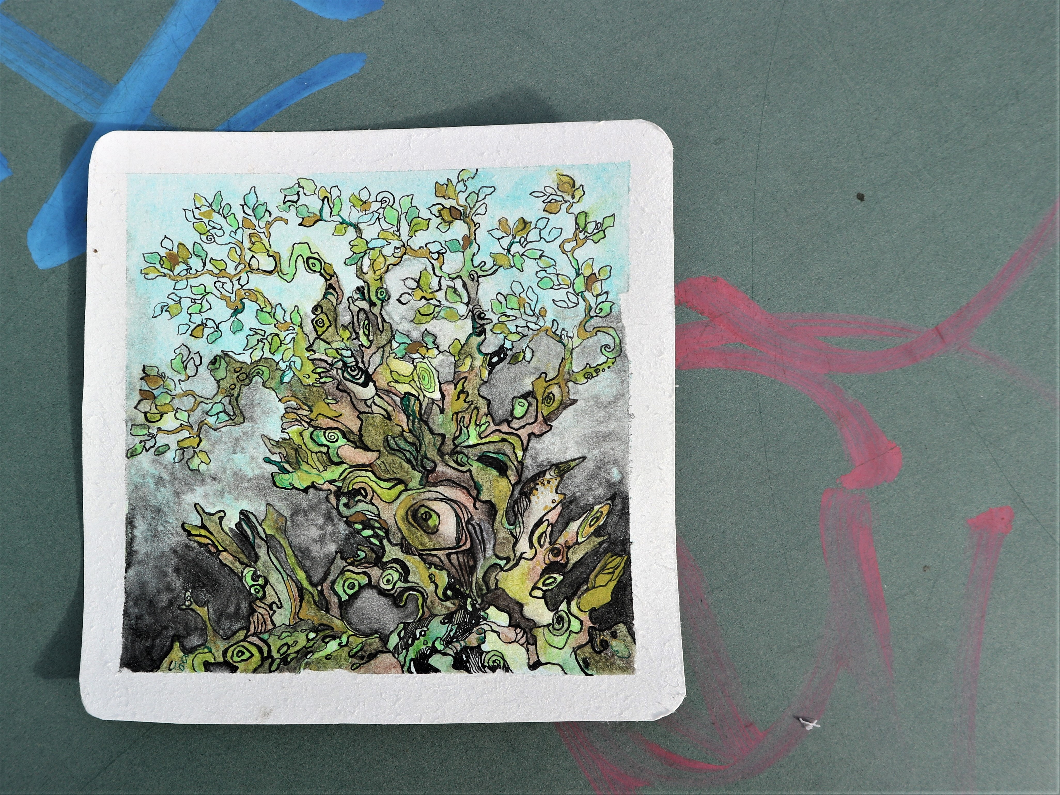 Следом прорисованы элементы дерева при помощи акварельных карандашей и зелёной гелевой ручки. Затем весь рисунок был прокрашен полупрозрачной перламутровой голубой акриловой краской, которая словно залакировала поверхность. Уже поверх образованной плёнки наносились штрихи золотой гелевой ручкой и оливковой и чёрной гуашью. Окончательные штрихи были нанесены тушью.