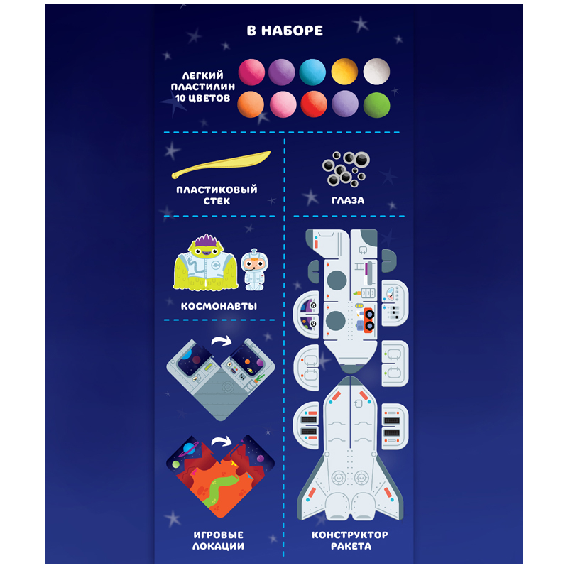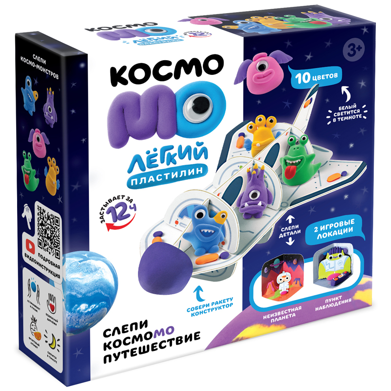 В игровой набор КосмоМО входят: легкий пластилин 10 цветов. В том числе белый, который светится в темноте!