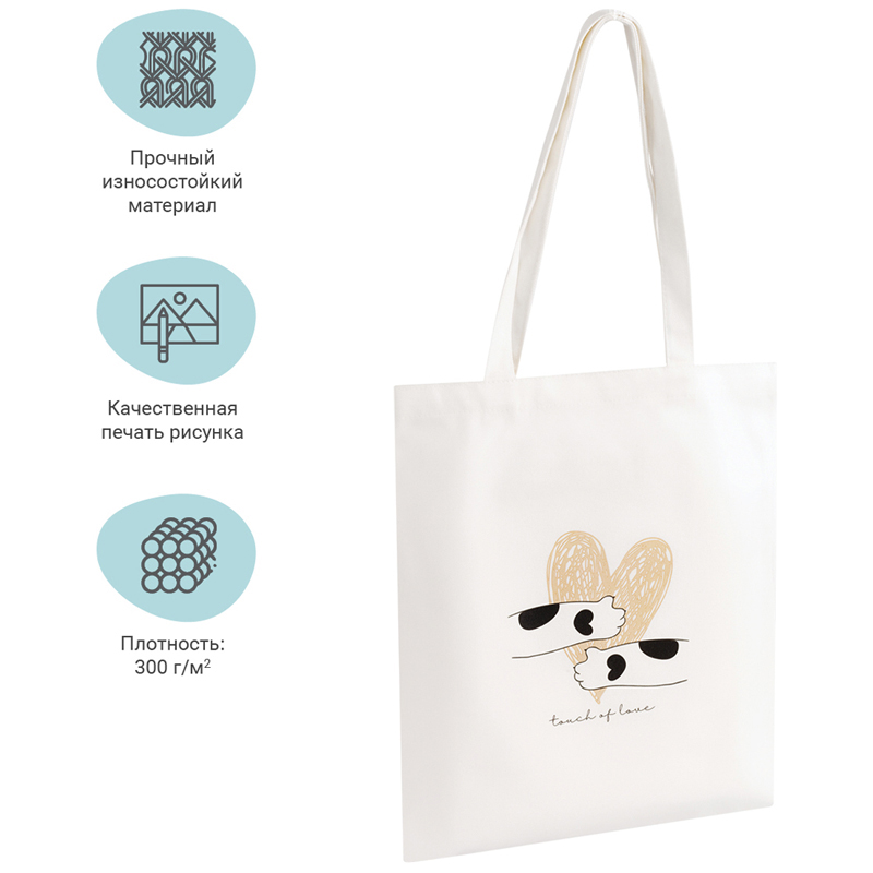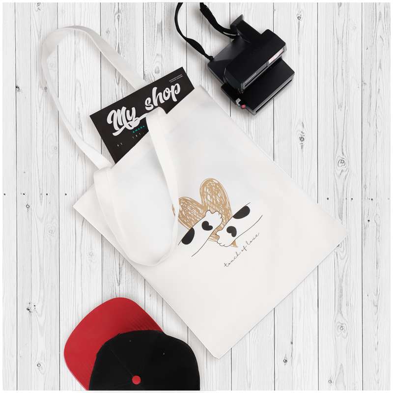 Размер шоппера- 330*400 мм., в качестве дизайна выступает яркий рисунок на однотонном материале сумки.