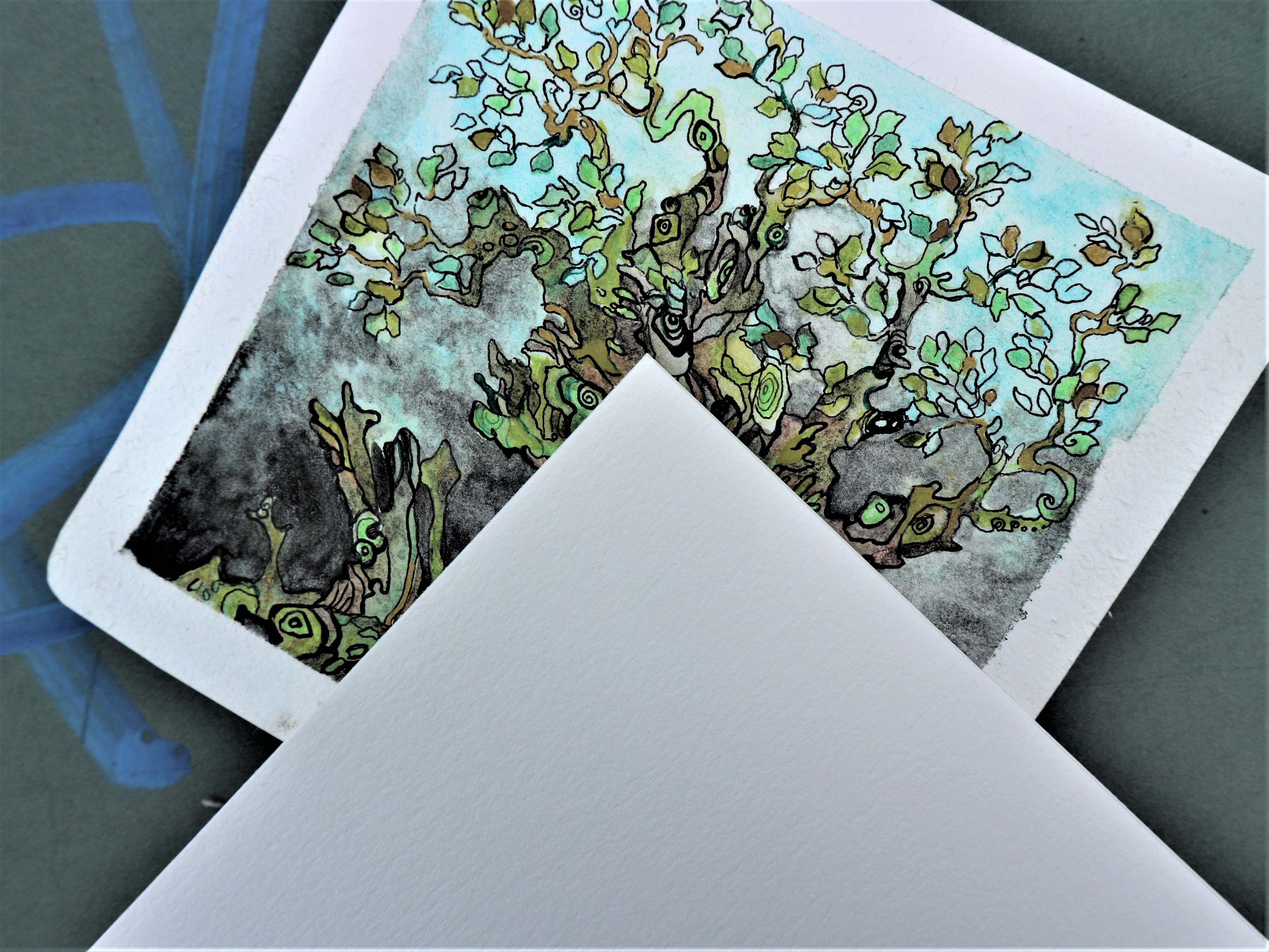 Следом прорисованы элементы дерева при помощи акварельных карандашей и зелёной гелевой ручки. Затем весь рисунок был прокрашен полупрозрачной перламутровой голубой акриловой краской, которая словно залакировала поверхность. Уже поверх образованной плёнки наносились штрихи золотой гелевой ручкой и оливковой и чёрной гуашью. Окончательные штрихи были нанесены тушью.