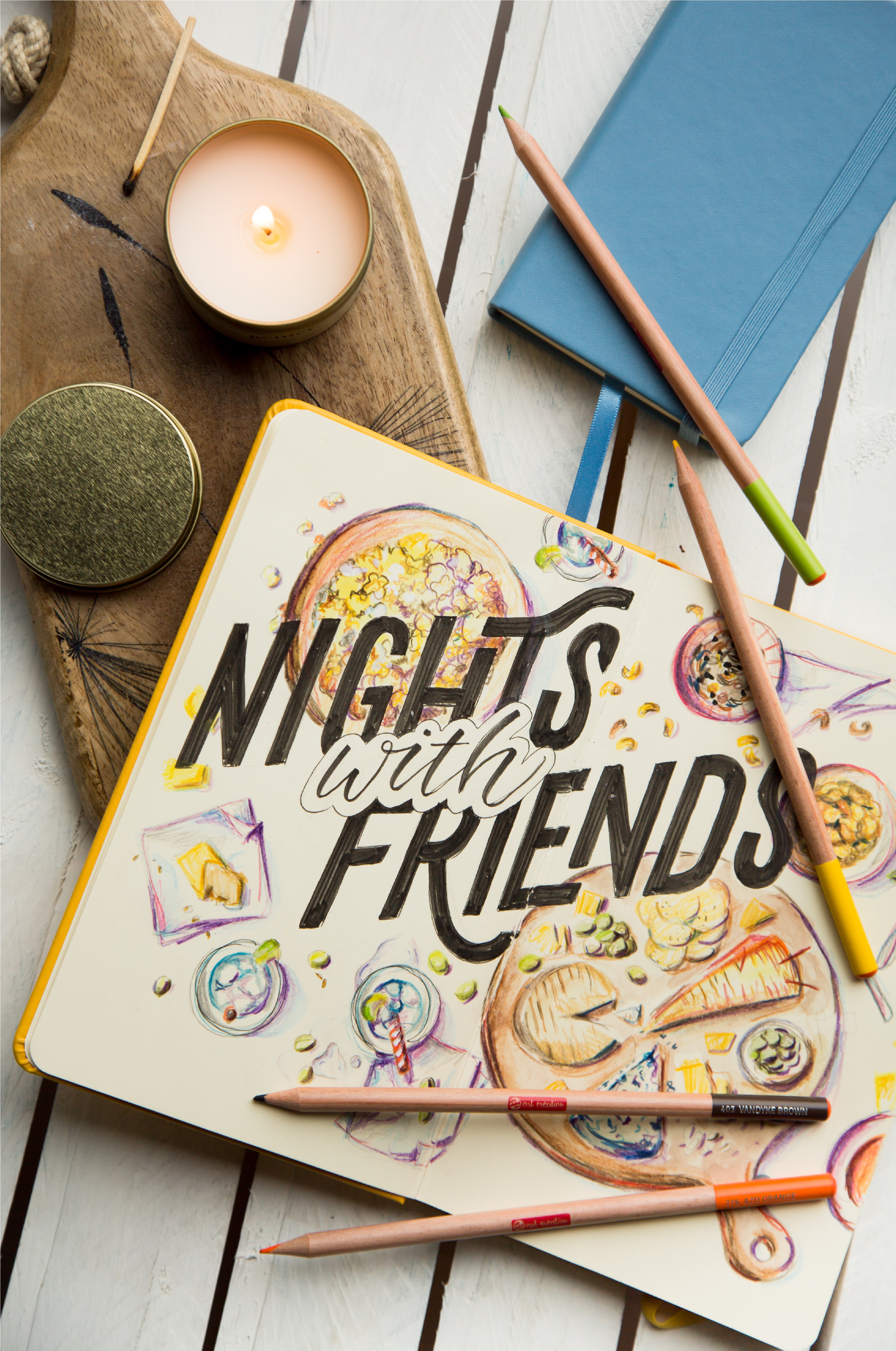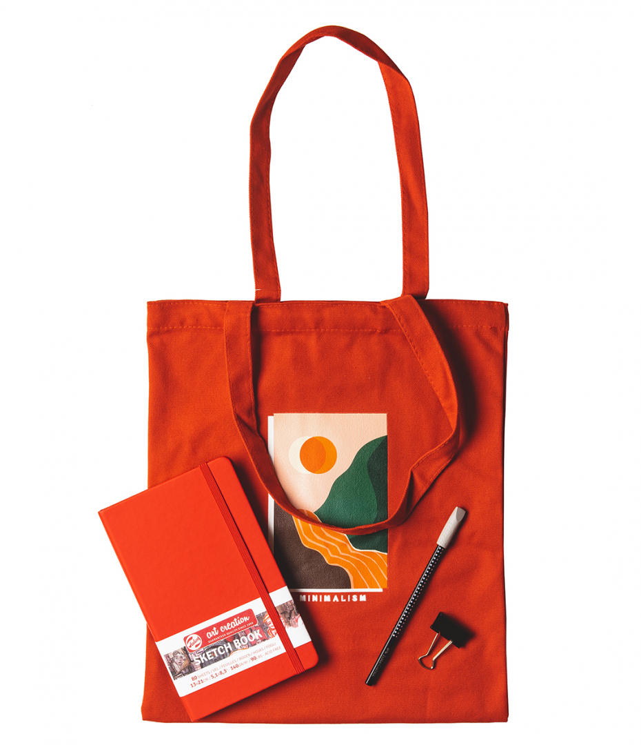 В комплекте: сумка-шоппер Meshu из канваса с принтом; скетчбук Talens "Art Creation", формата А5, 80л; карандаш Faber-Castel; ластик-насадка и зажим для бумаги.