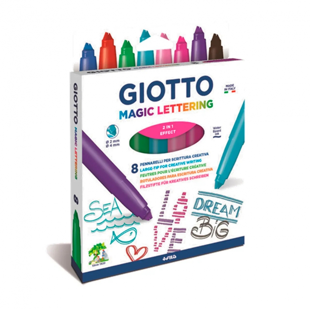 Giotto Magic Lettering - это магические фломастеры для леттеринга. Идеально подходит для написания и украшения благодаря специальному наконечнику фломастеров для тонких и широких штрихов благодаря чему новички в технике lettering автоматически получают результат.