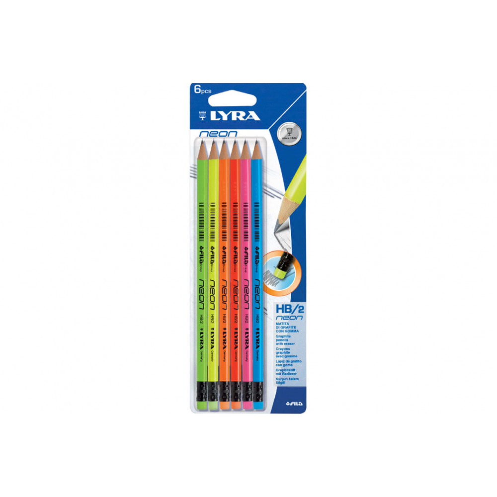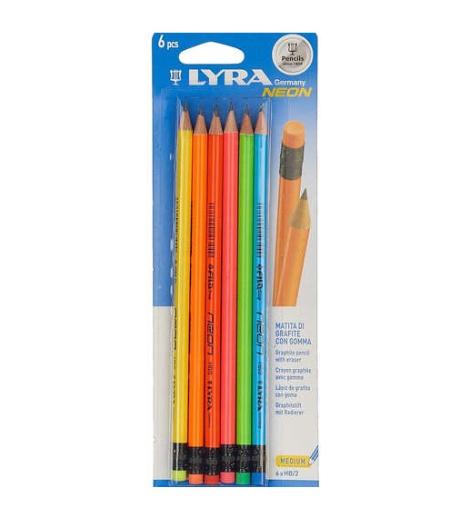 Набор Lyra Neon состоит из 6 чернографитных карандашей круглой формы с ластиком на конце.