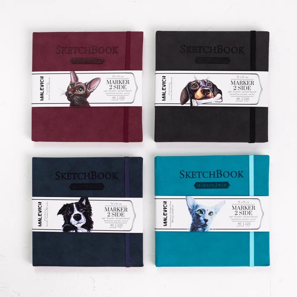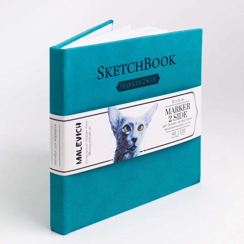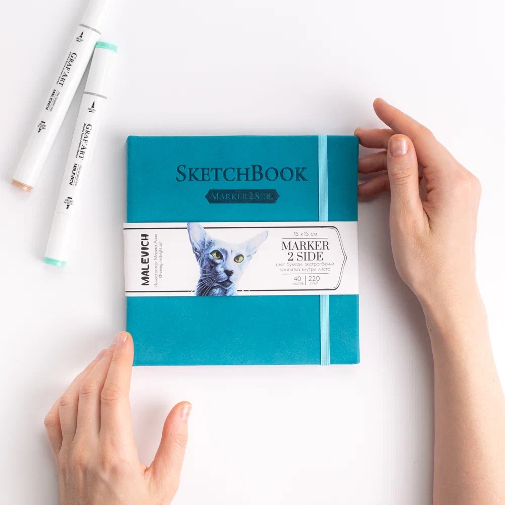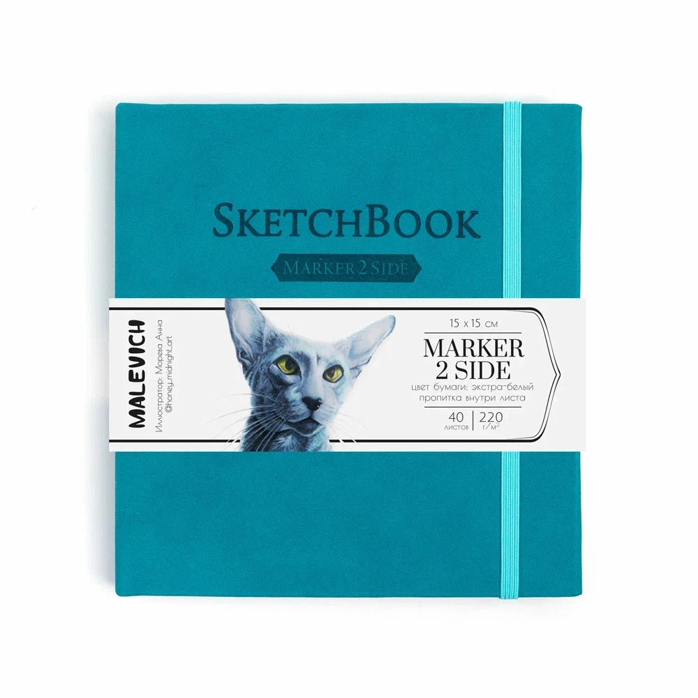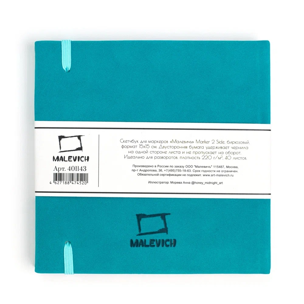 Скетчбук для маркеров Малевичъ, двусторонняя бумага 220 г/м, 15х15 см, 40 л, бирюзовый