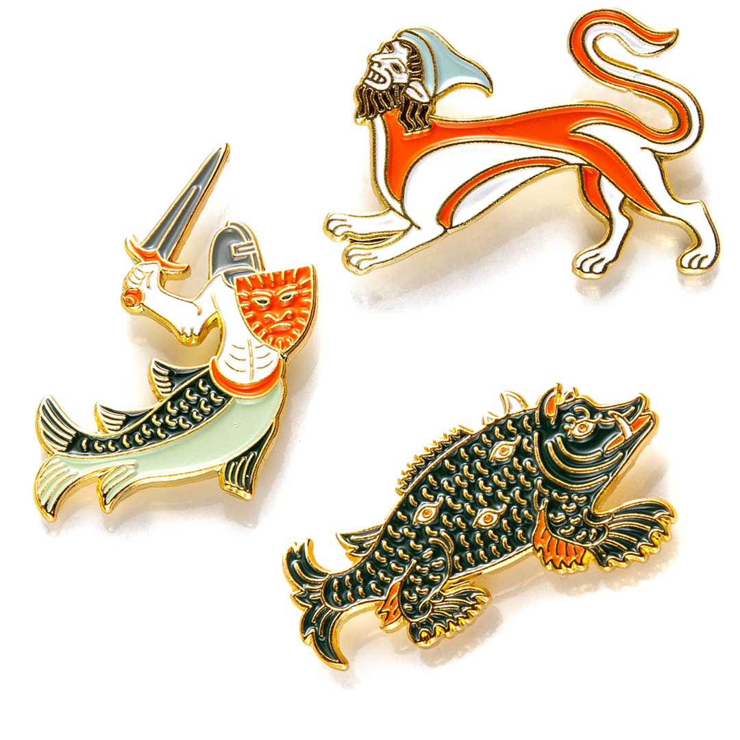 Тематический набор значков: Мантикора, Морской гад, Тритон. Значки произведены из качественного металла с четкой заливкой цвета и формами. После того, как вы прицепите один значок на свою куртку или рюкзак, то он начнет стремительно обрастать новыми и новыми значками. Это стильный и элегантный атрибут для любой вещи. Каждому творческому человеку понравится такой подарок.