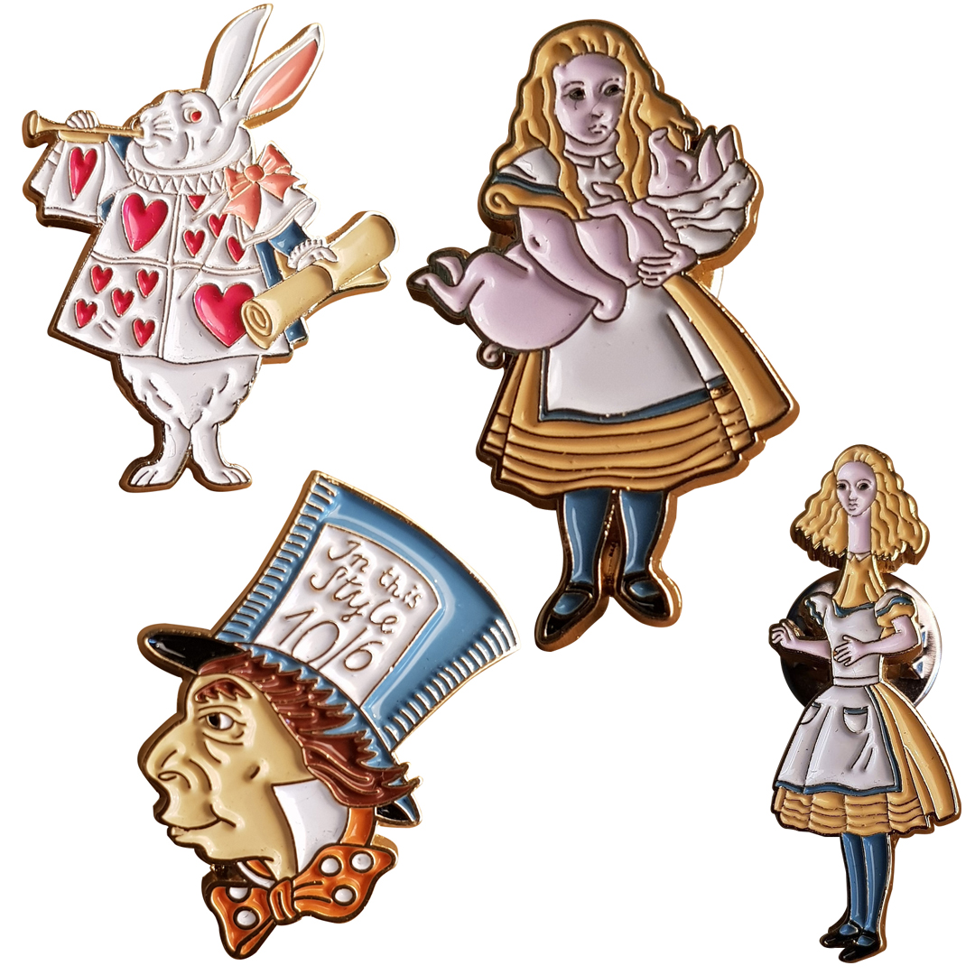 Тематический набор значков: "Алиса с поросенком", "Высокая Алиса", "Кролик", "Шляпник". Значки произведены из качественного металла с четкой заливкой цвета и формами. После того, как вы прицепите один значок на свою куртку или рюкзак, то он начнет стремительно обрастать новыми и новыми значками. Это стильный и элегантный атрибут для любой вещи. Каждому творческому человеку понравится такой подарок.
