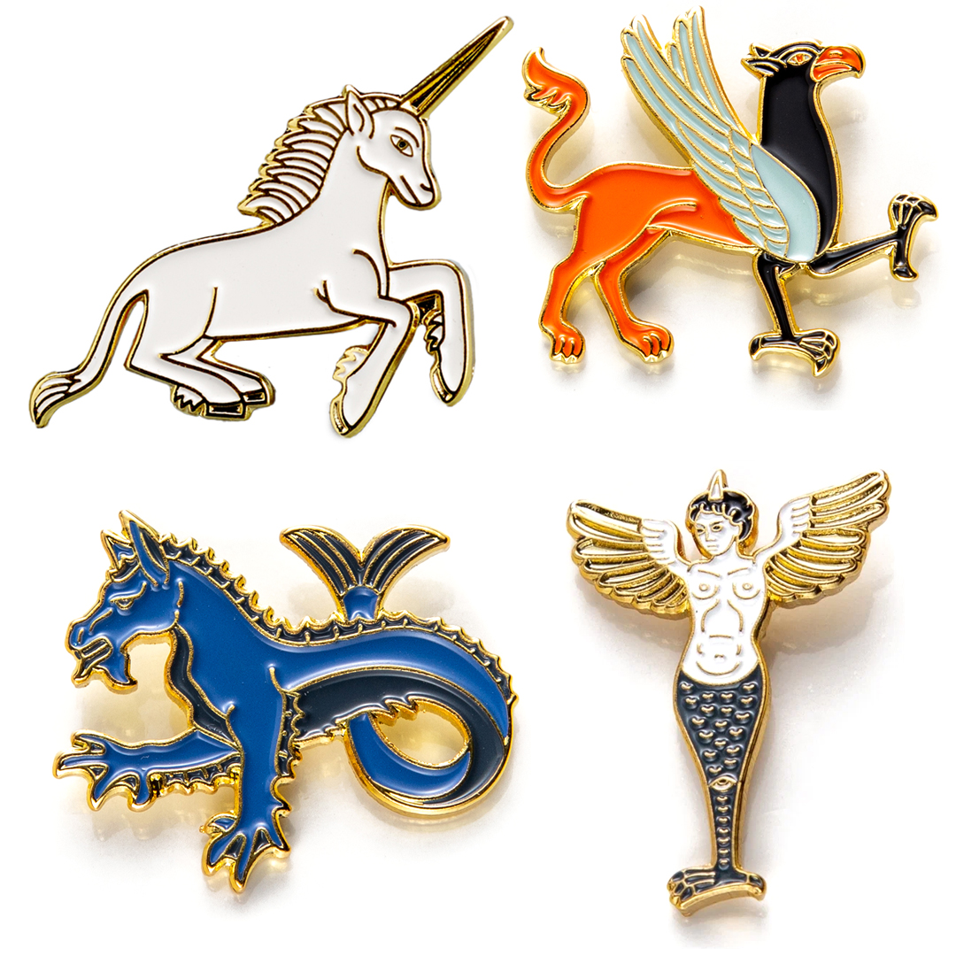 Тематический набор значков: Гарпия, Гиппокампус, Грифон, Единорог. Значки произведены из качественного металла с четкой заливкой цвета и формами. После того, как вы прицепите один значок на свою куртку или рюкзак, то он начнет стремительно обрастать новыми и новыми значками. Это стильный и элегантный атрибут для любой вещи. Каждому творческому человеку понравится такой подарок.