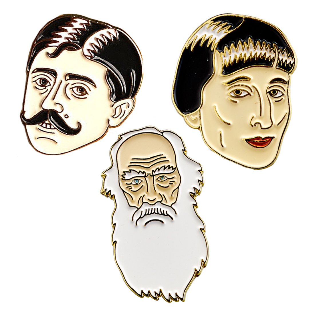 Тематический набор значков: Анна Ахматова, Лев Толстой, Марсель Пруст. Значки произведены из качественного металла с четкой заливкой цвета и формами. После того, как вы прицепите один значок на свою куртку или рюкзак, то он начнет стремительно обрастать новыми и новыми значками. Это стильный и элегантный атрибут для любой вещи. Каждому творческому человеку понравится такой подарок.