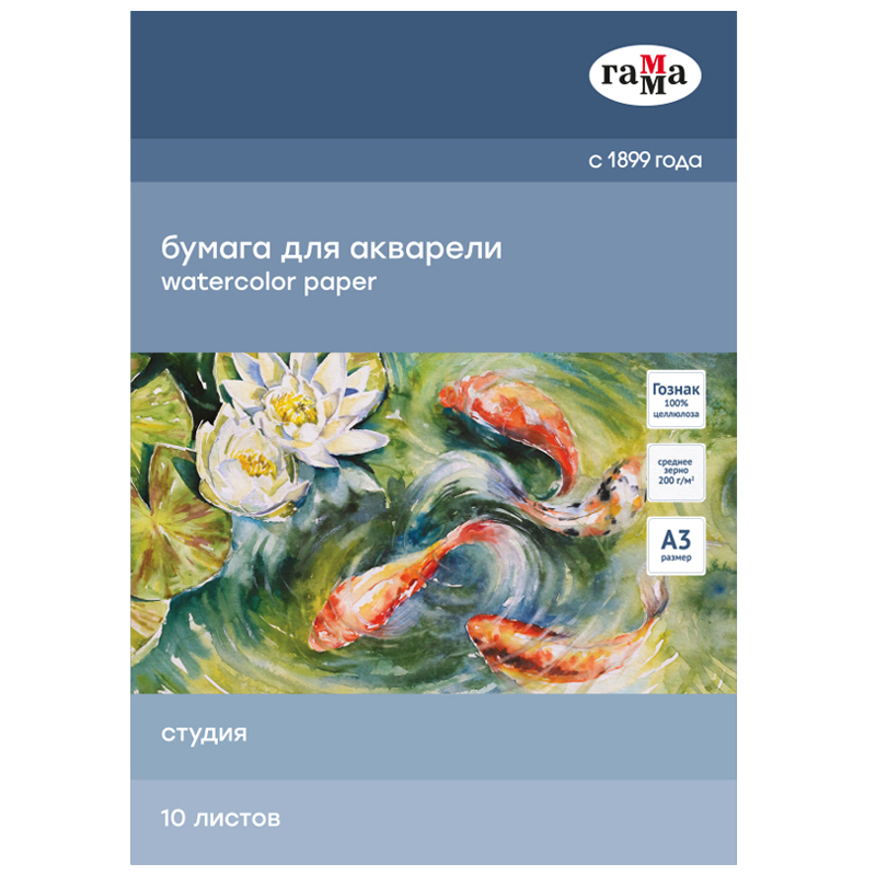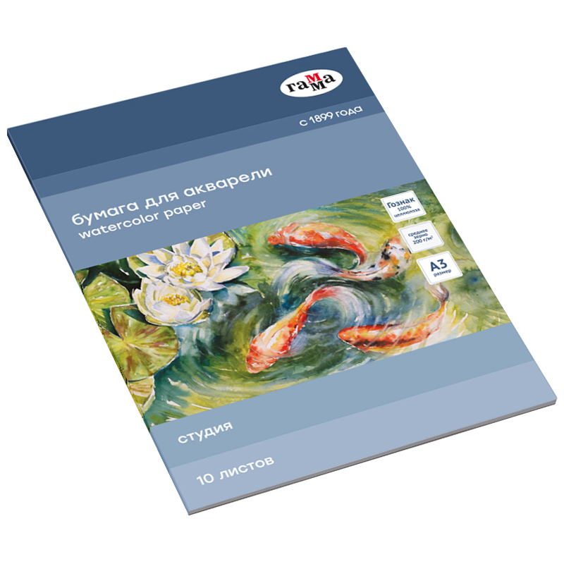 В папке «ГАММА» серии «Студия» используется бумага Гознак, подходящая для акварели. Листы изготовлены из 100% целлюлозы, плотностью 200г/м2.