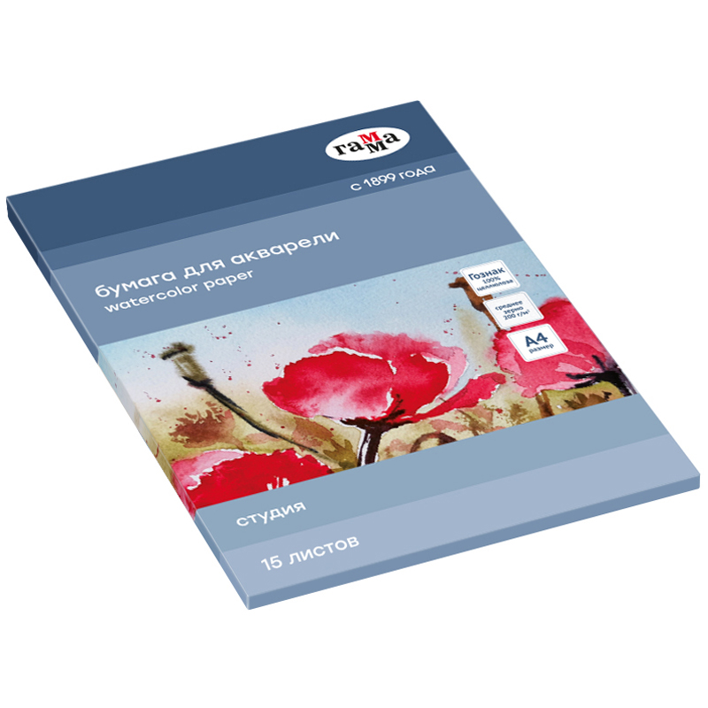 В папке «ГАММА» серии «Студия» используется бумага Гознак, подходящая для акварели. Листы изготовлены из 100% целлюлозы, плотностью 200г/м2.