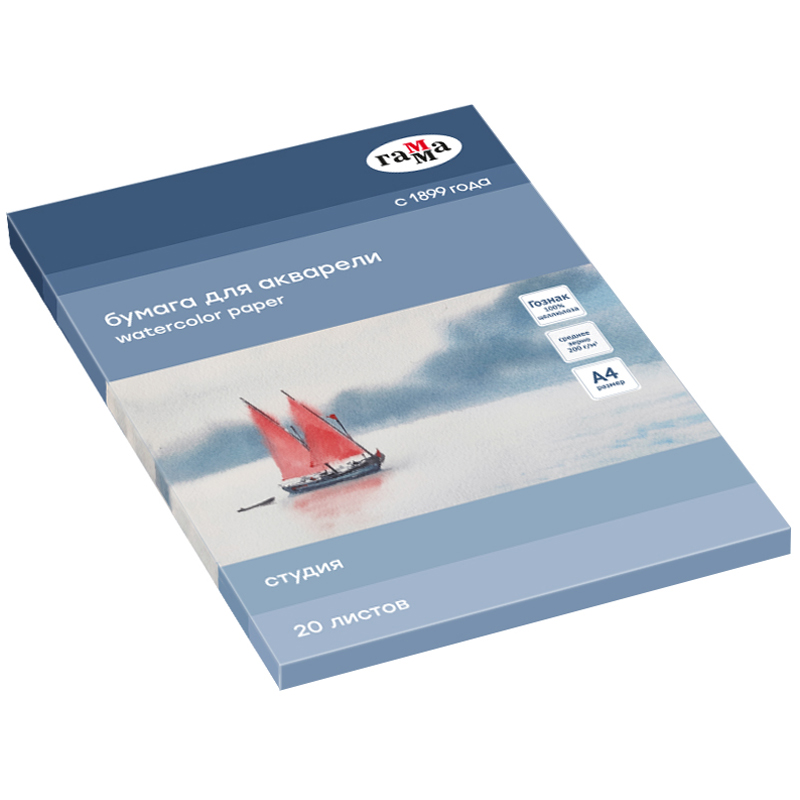 В папке «ГАММА» серии «Студия» используется бумага Гознак, подходящая для акварели. Листы изготовлены из 100% целлюлозы, плотностью 200г/м2.