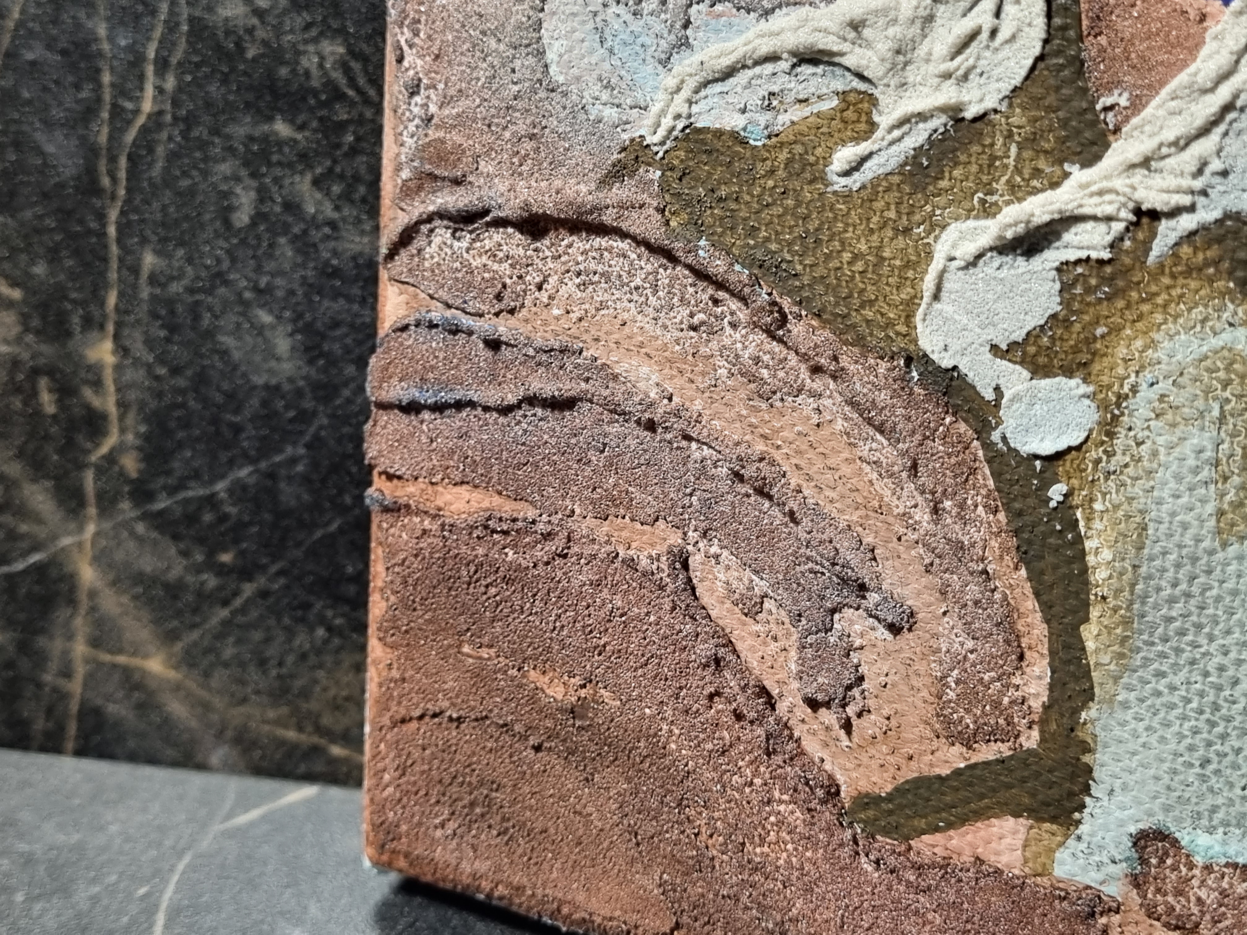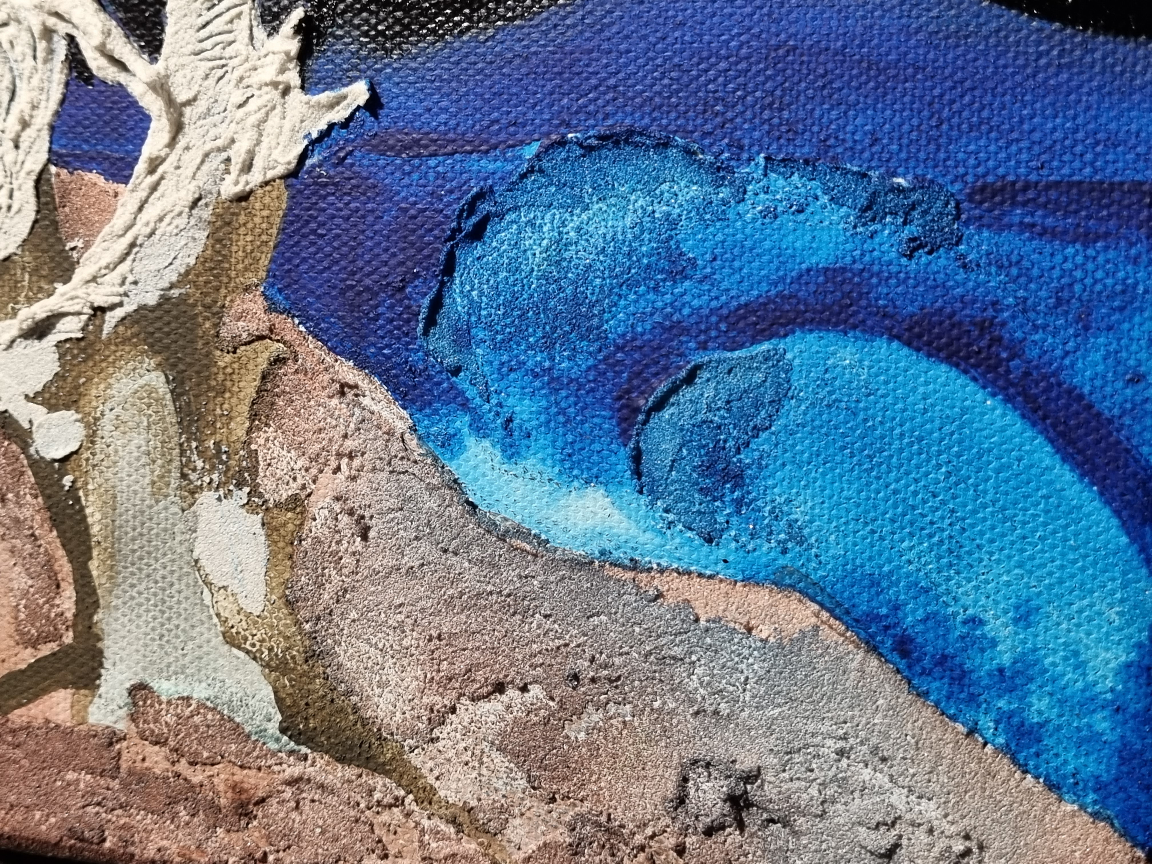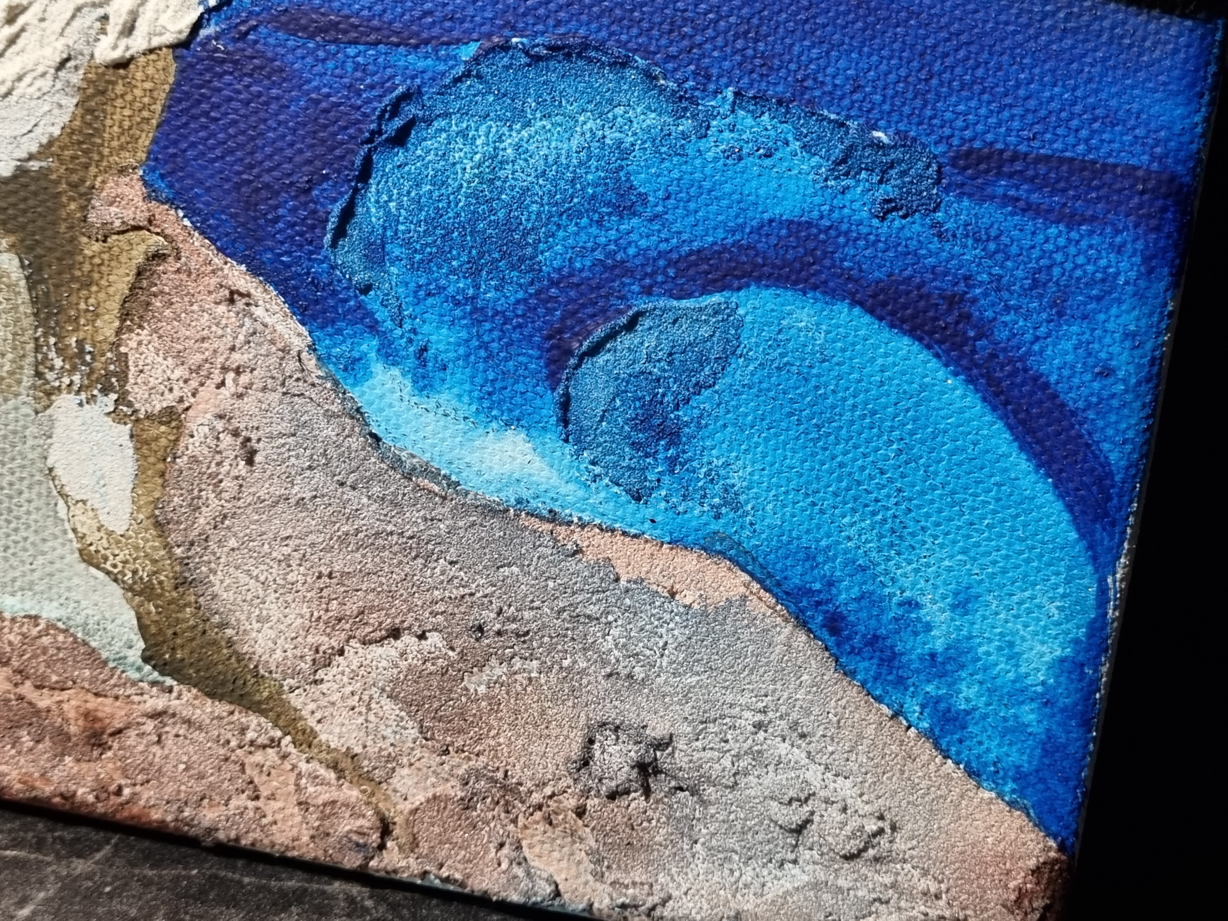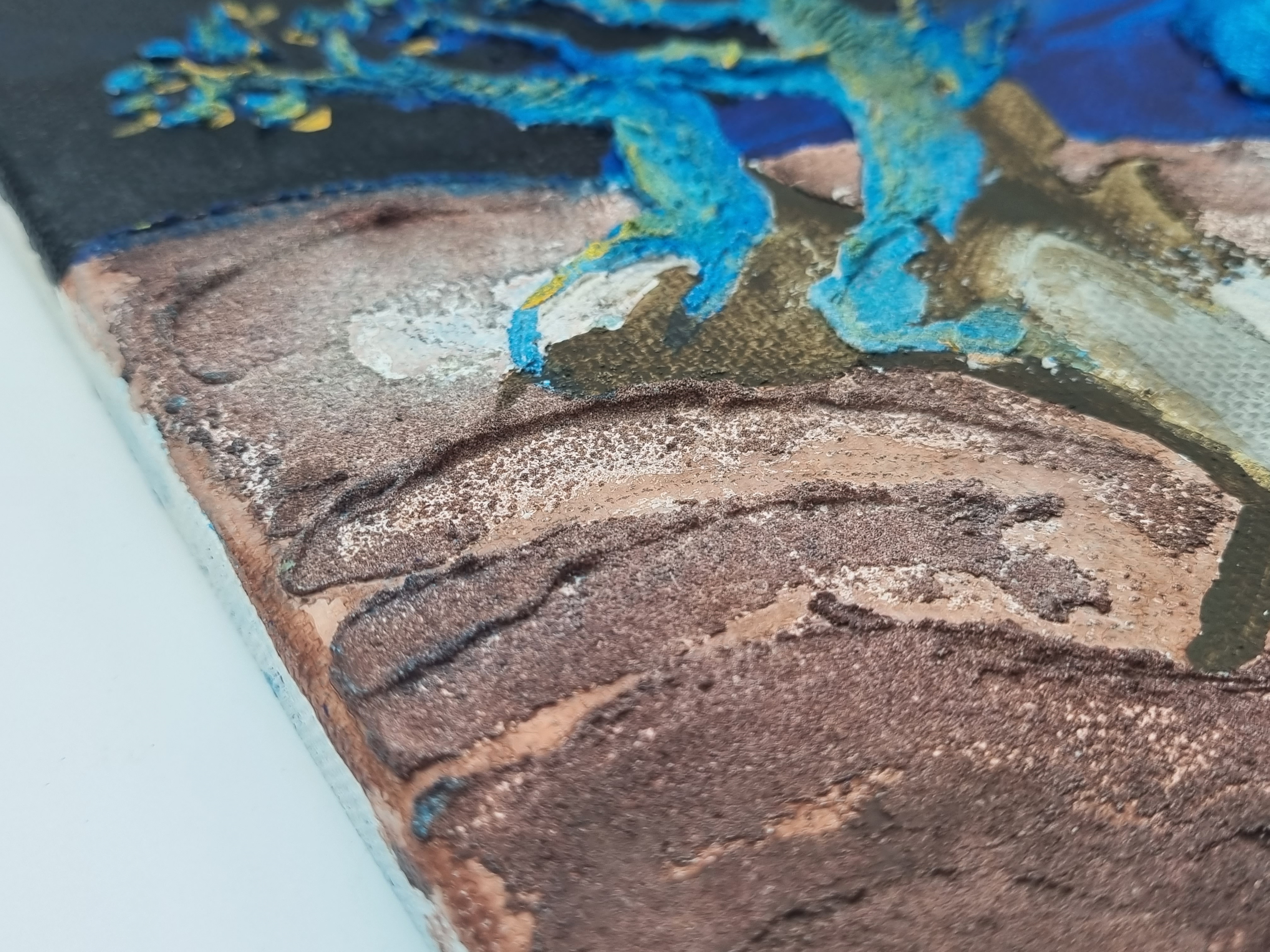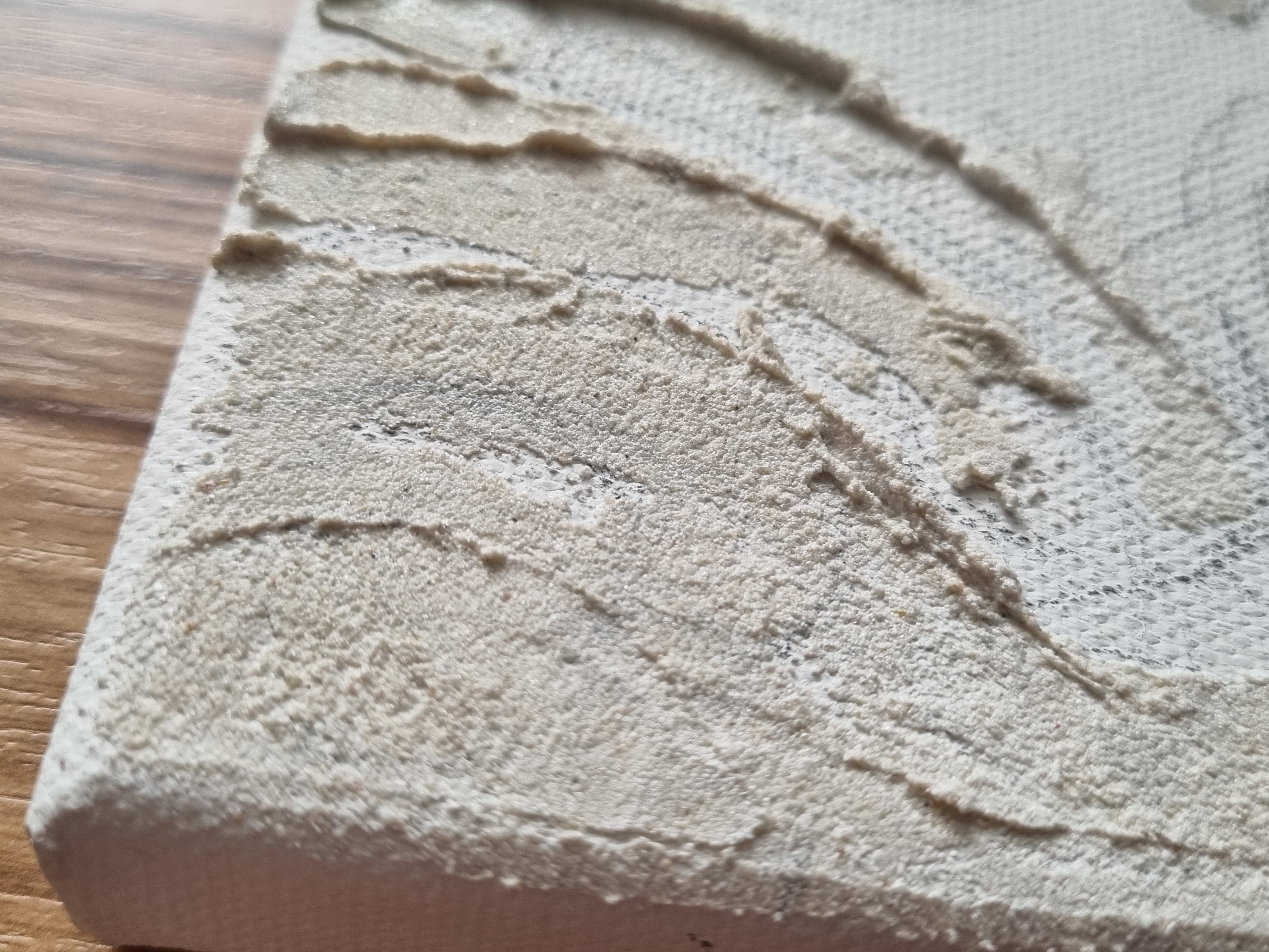 При последующем окрашивании пористой поверхности, она, жадно вбирает в себя акрил. Краска моментально подчёркивает каждую микровпадинку и сохраняет песочную фактуру, сразу же стабилизируется. Некоторое время ещё можно разбавлять/добавлять краску, но чтобы сохранить фактуру, лучше не забивать её излишками краски. Она сразу берёт в себя столько, сколько ей нужно.