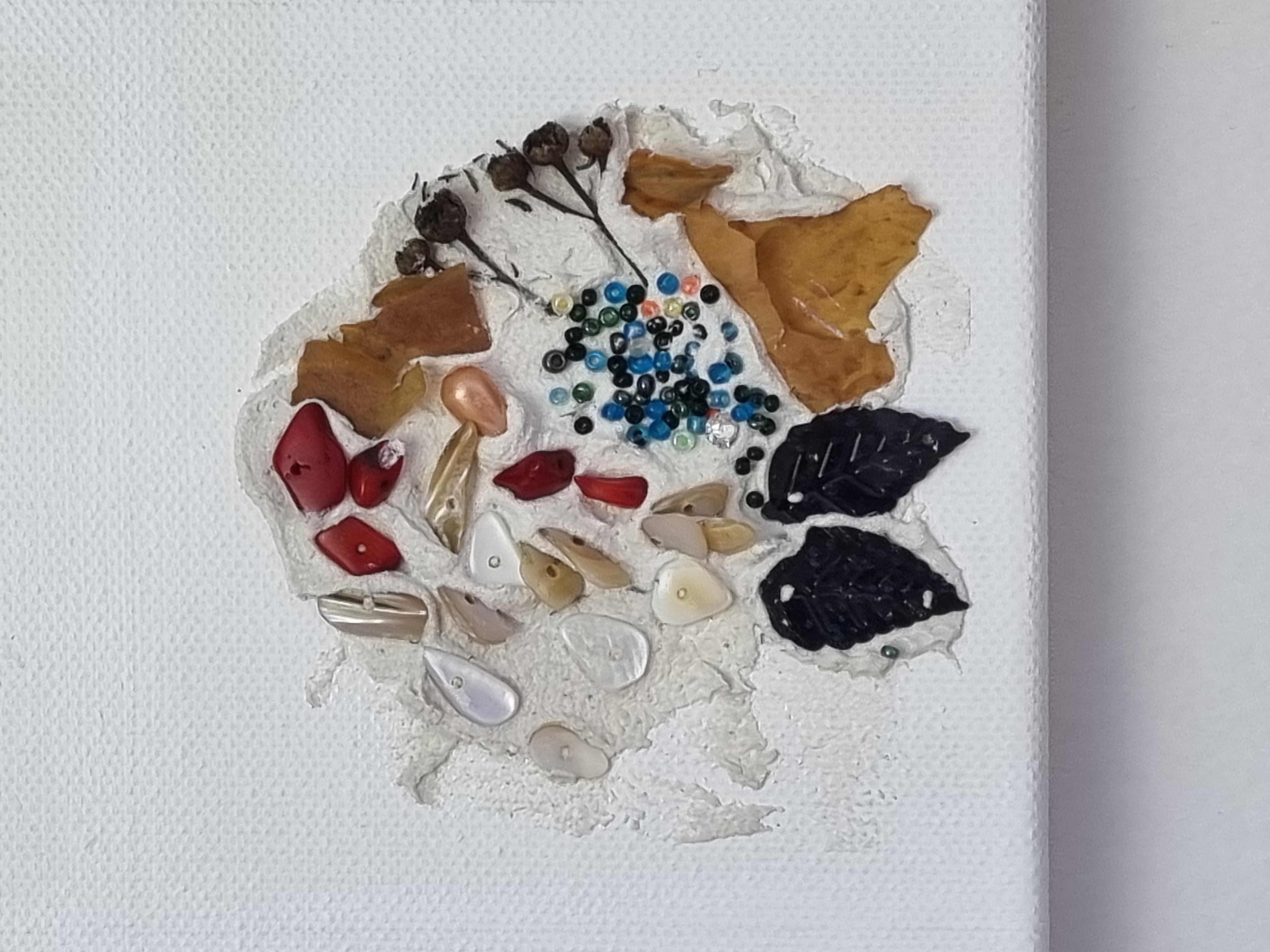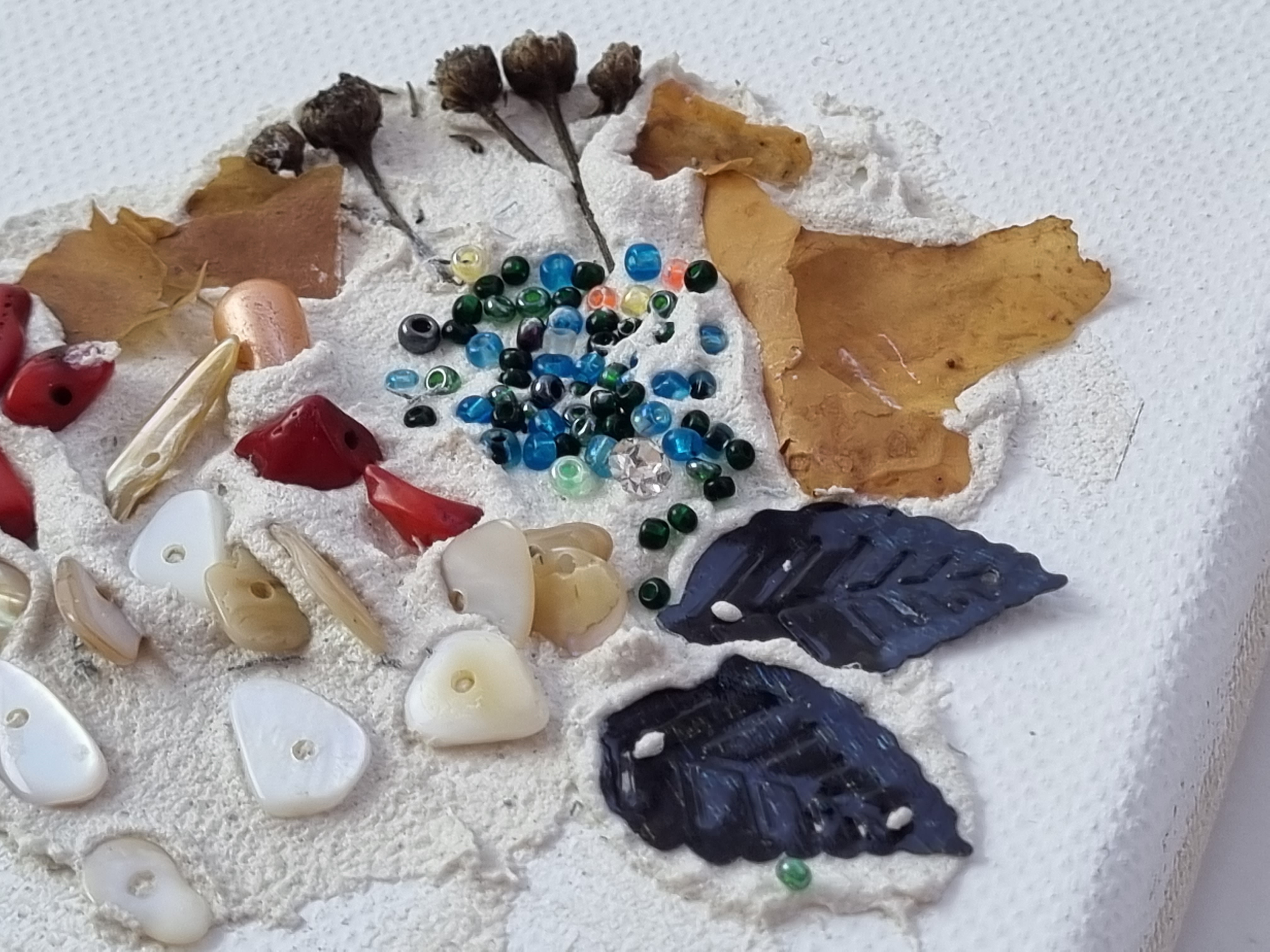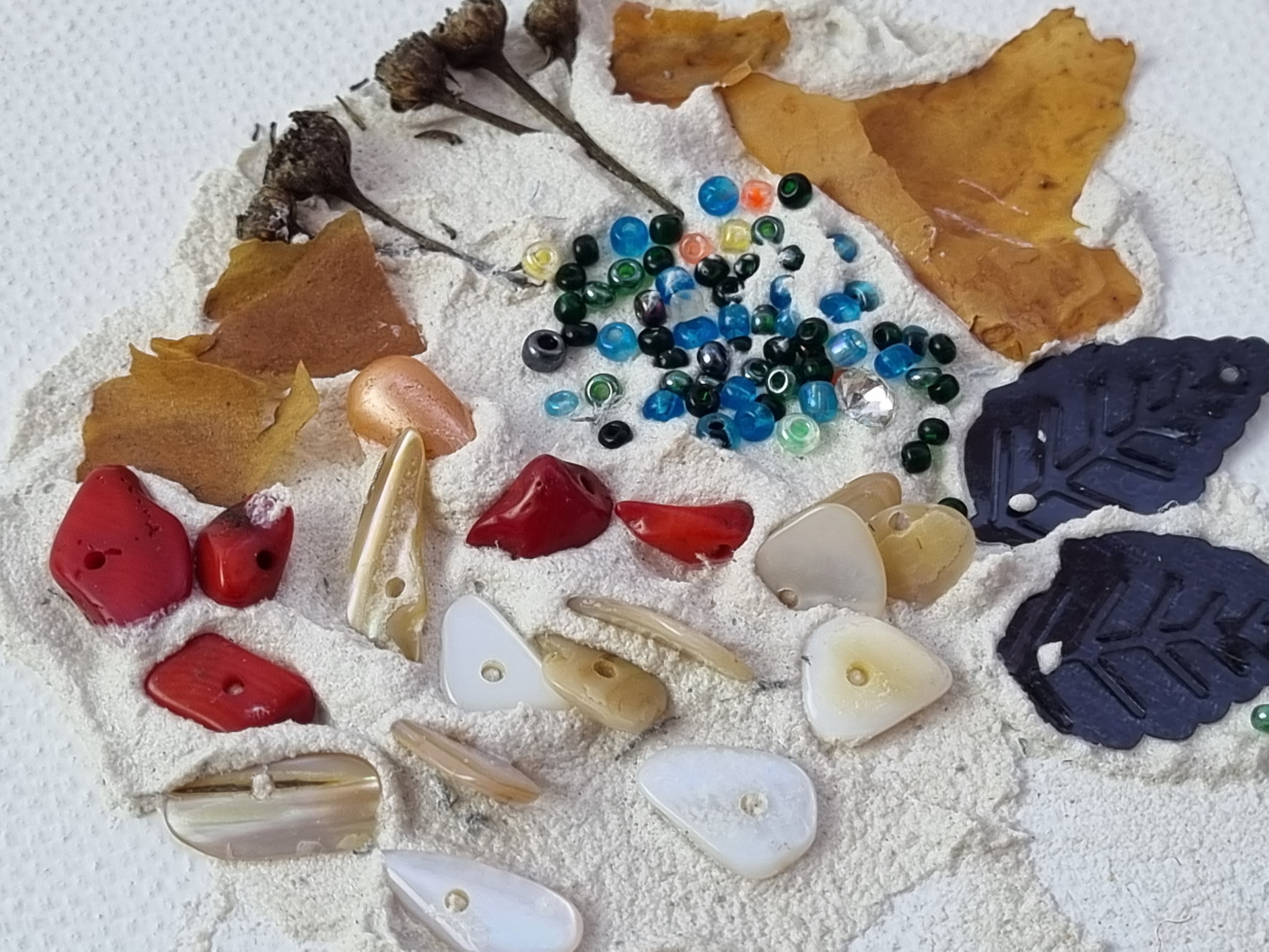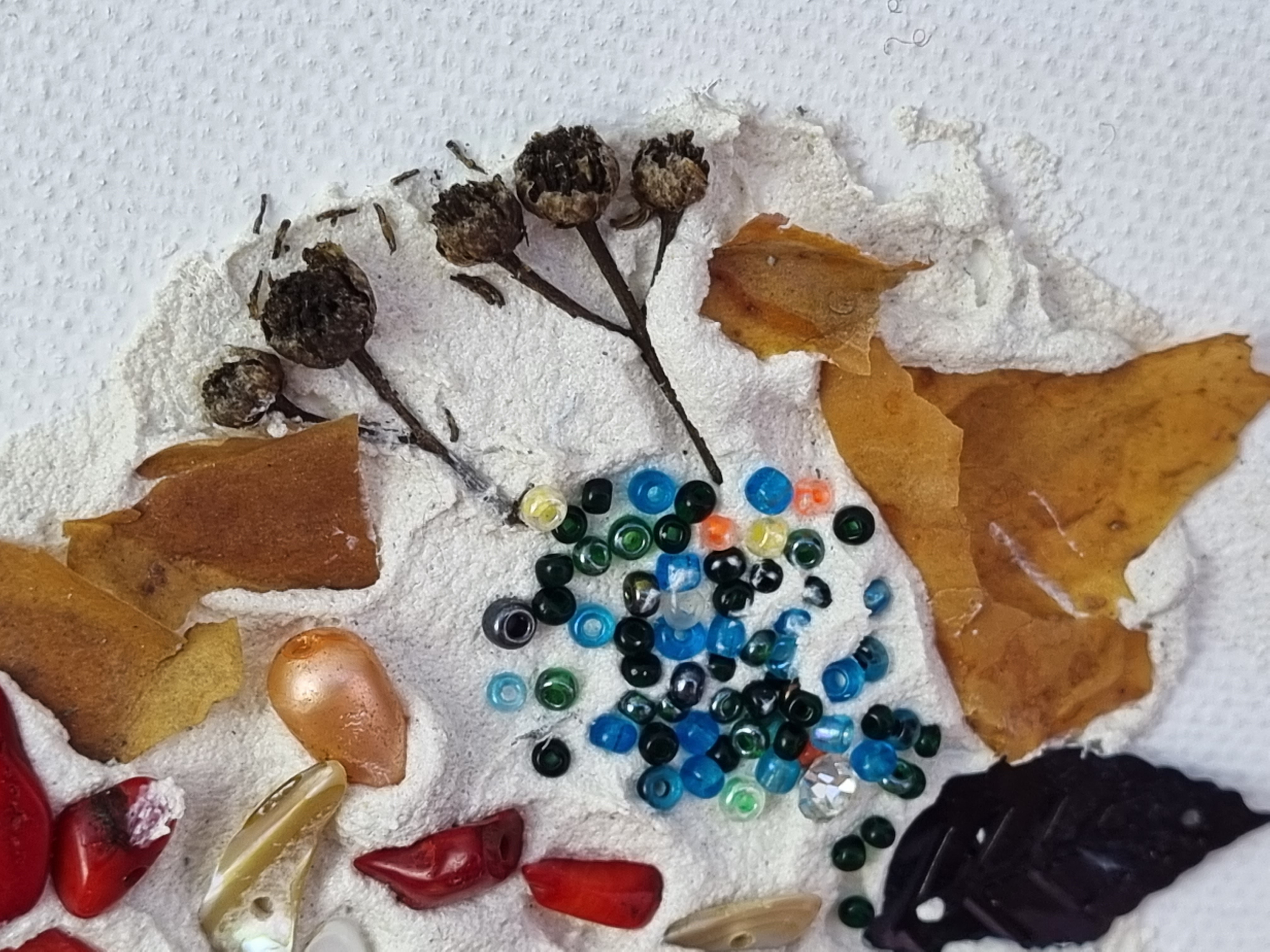 2 накладывается плотный слой и в него вдавливаются включения разного рода (бусины, сухоцветы, пайетки)