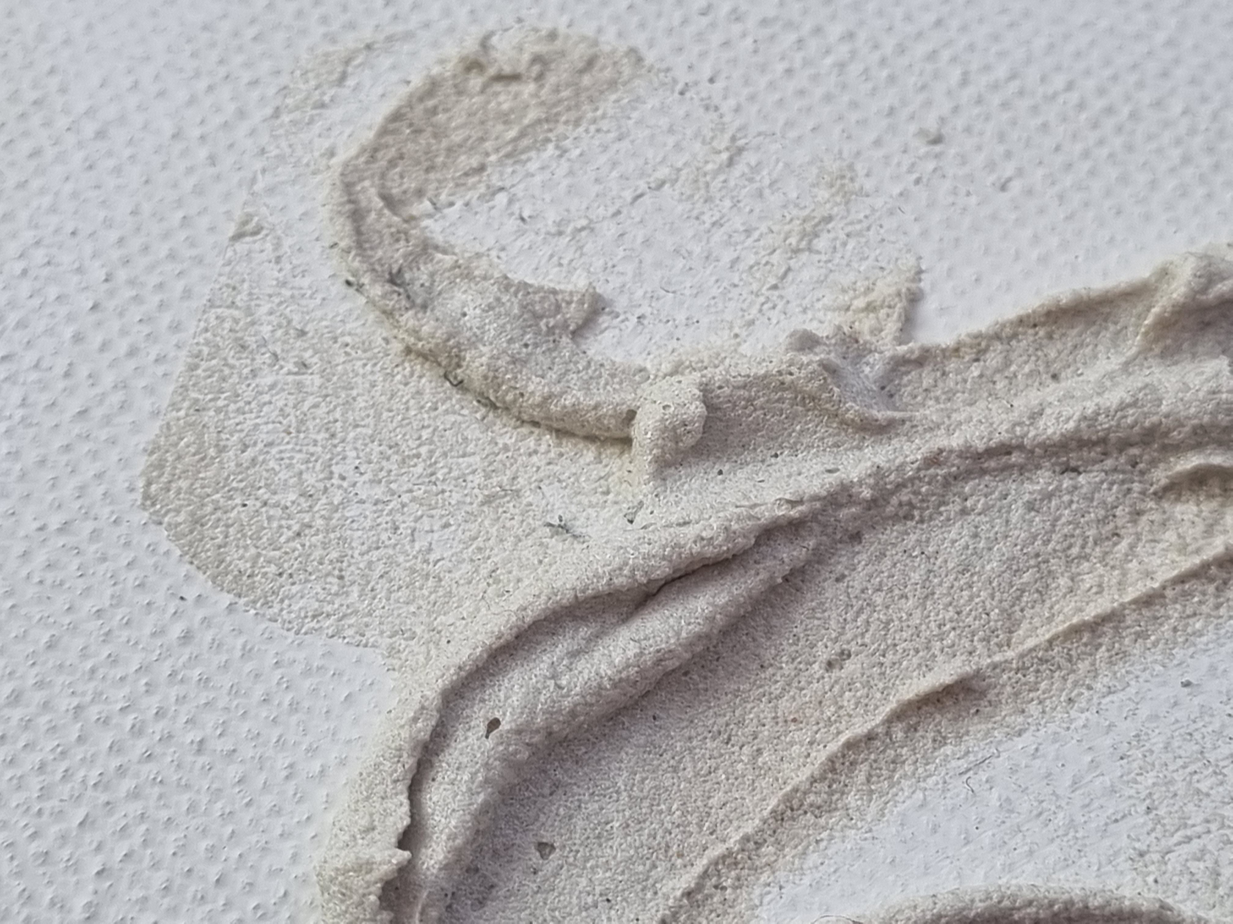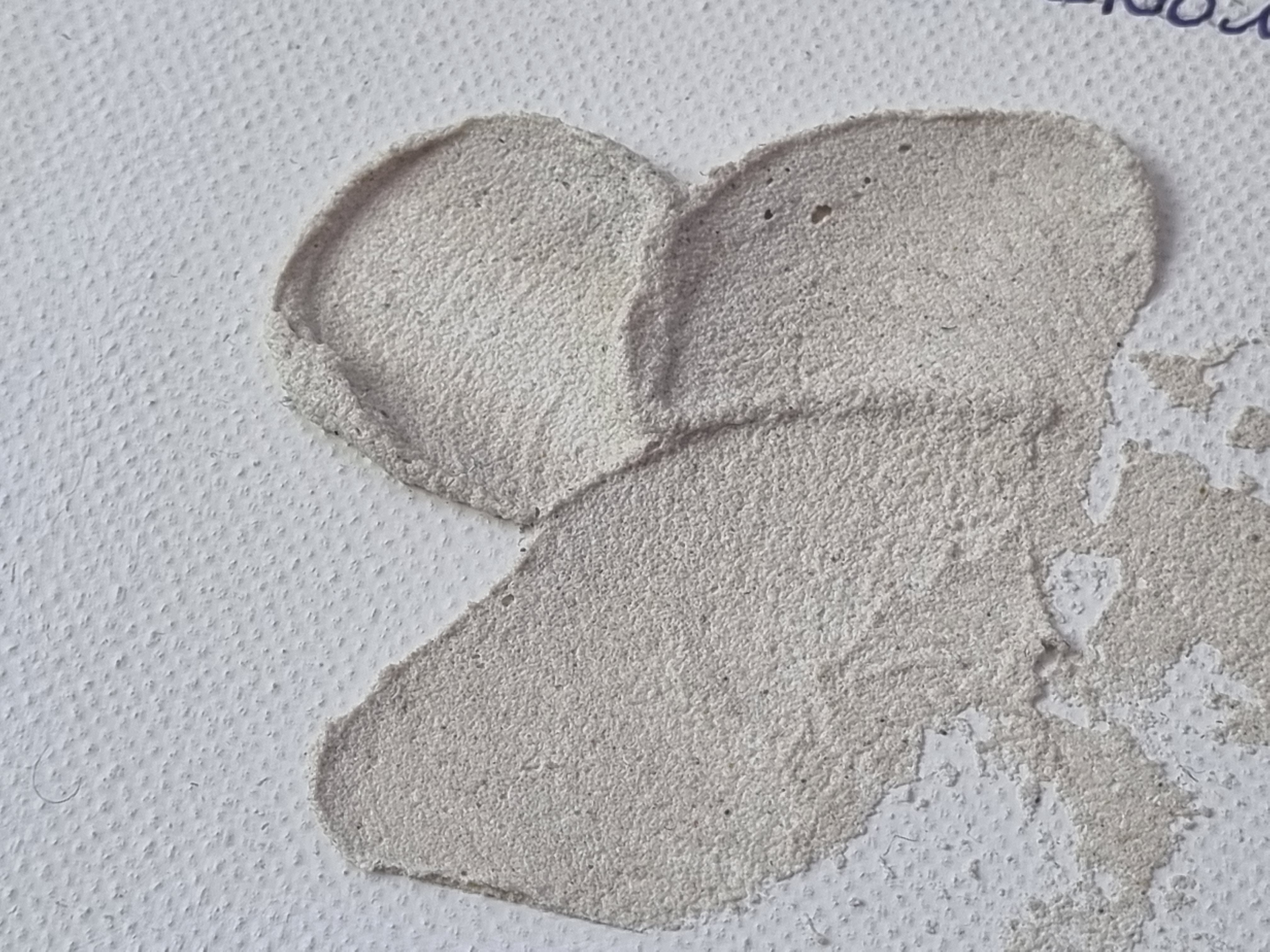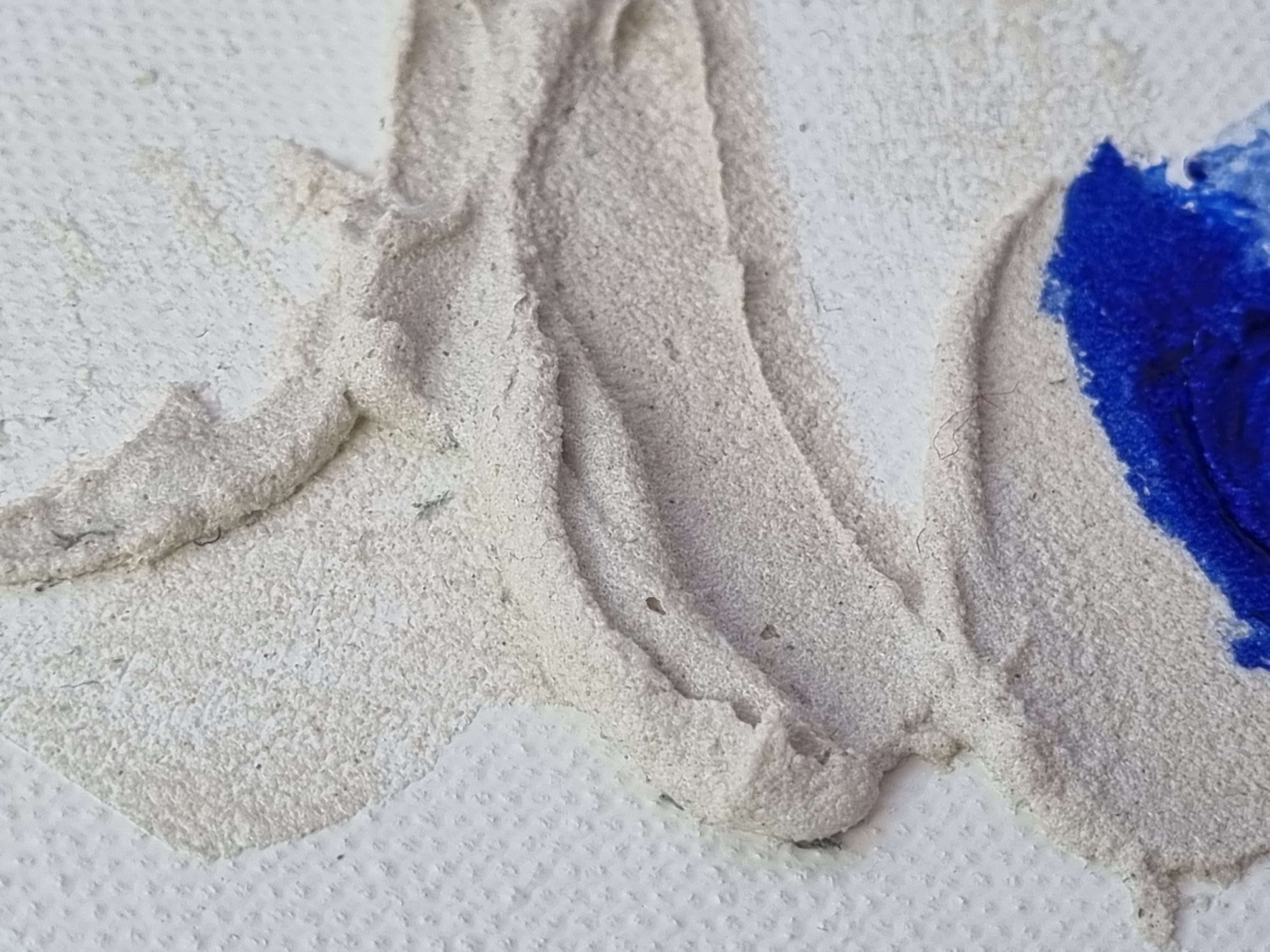 Важно отметить, что слой не трескается на холсте на подрамнике, т.е. на подвижной подложке, что очень важно и вовсе не повсеместно для такого рода материалов. При продавливании с изнанки холста, масса не расходится, образовывая трещины, а демонстрирует прекрасную адгезию с основой и свою целостность.