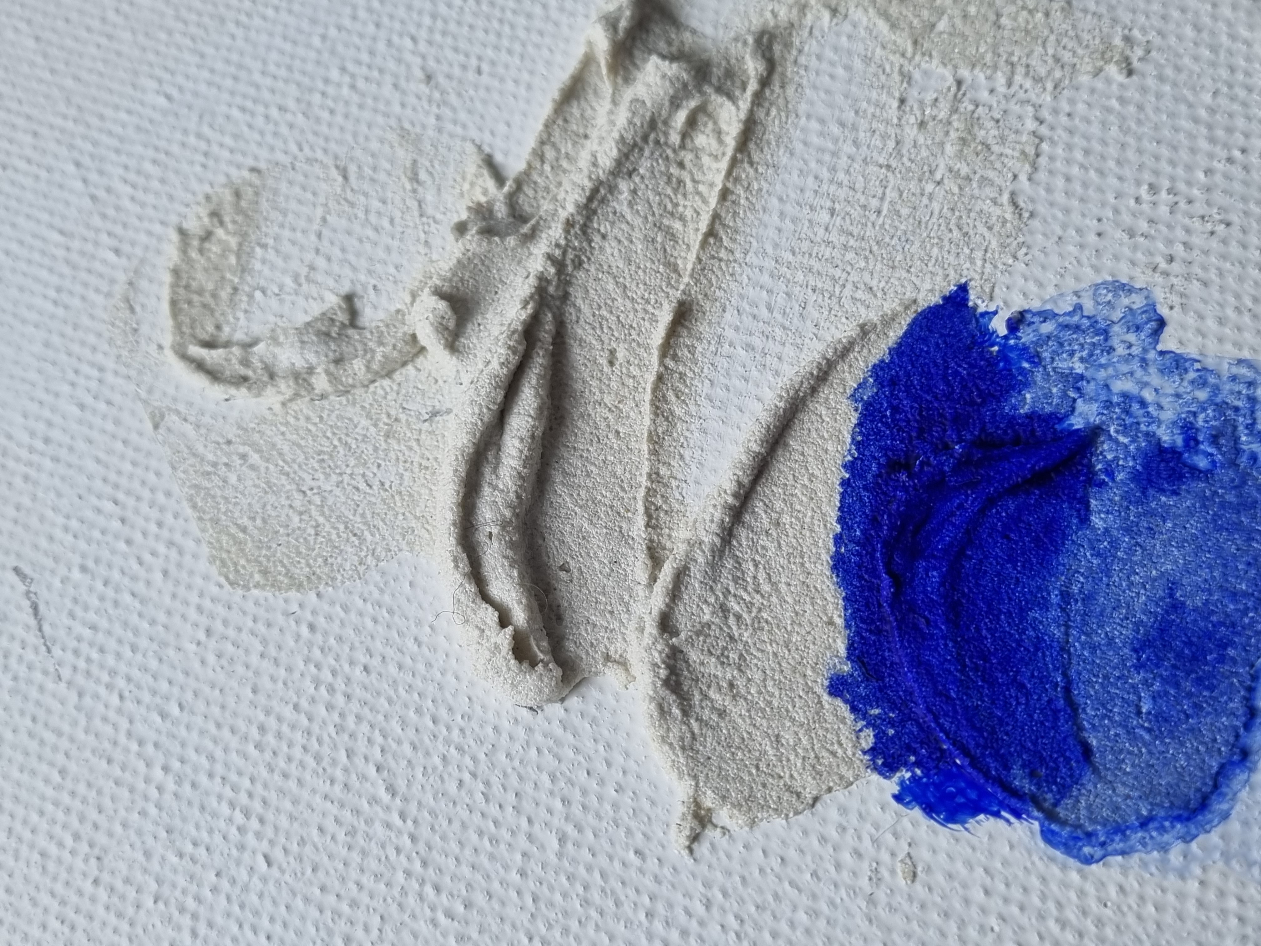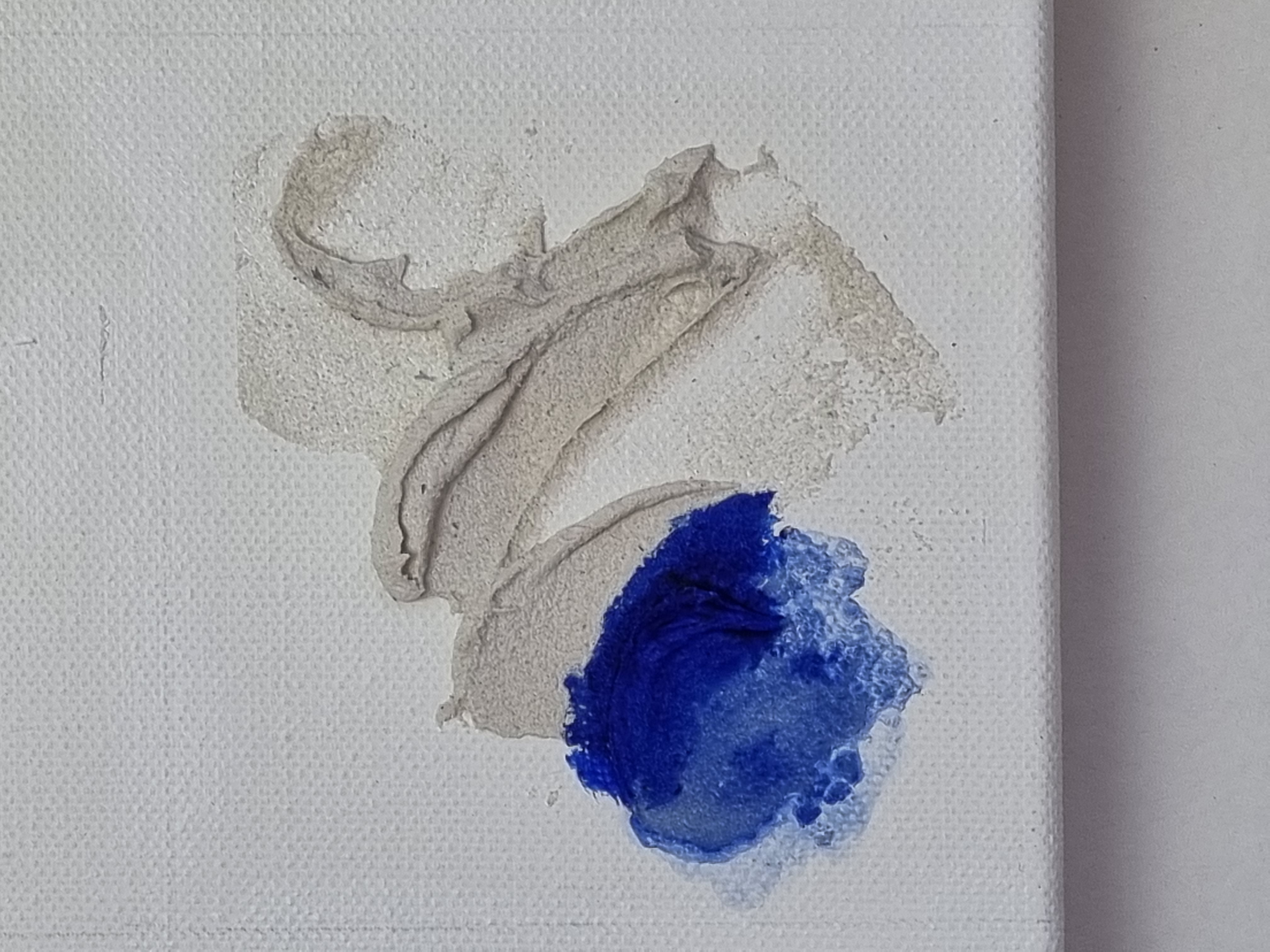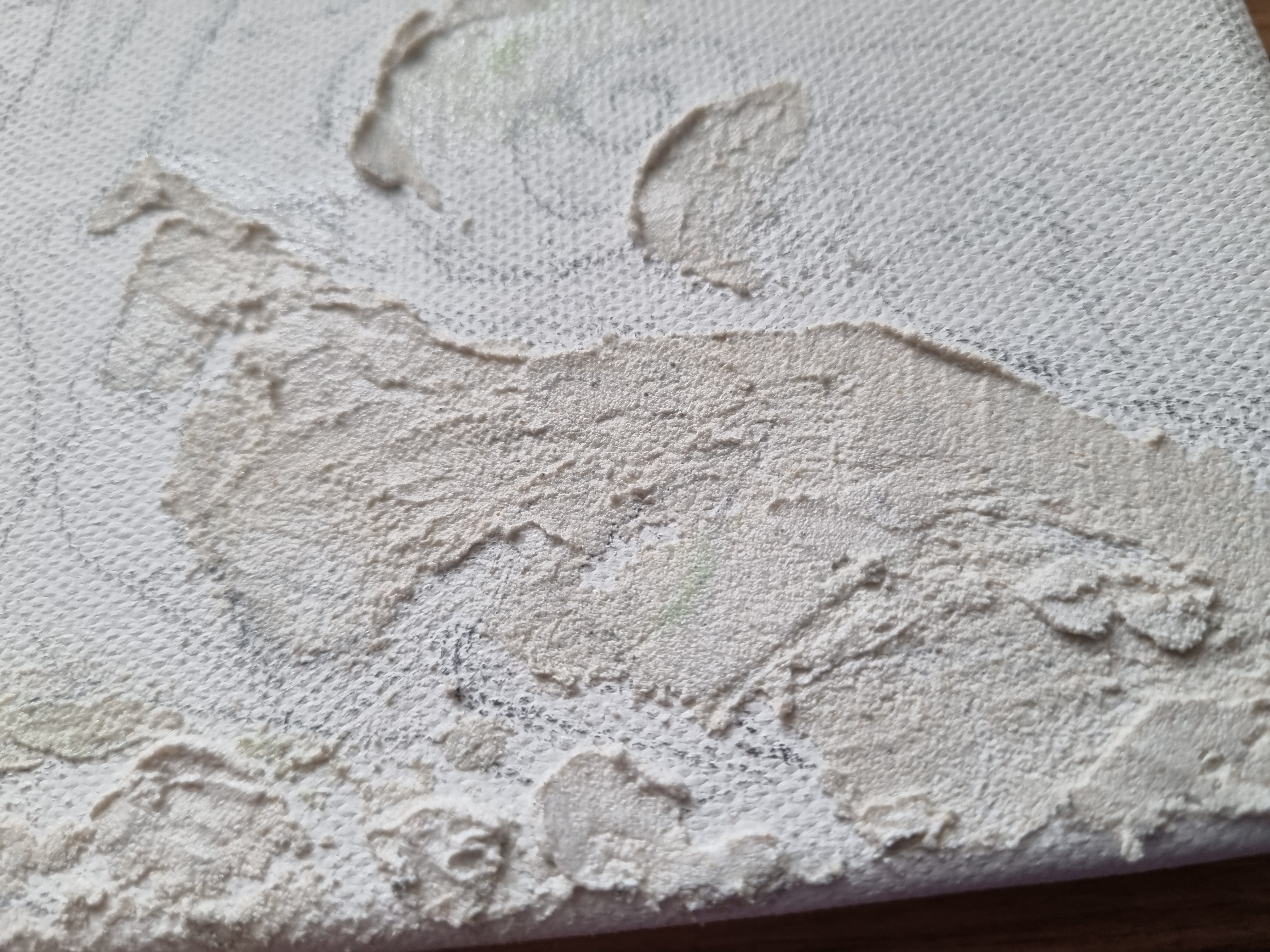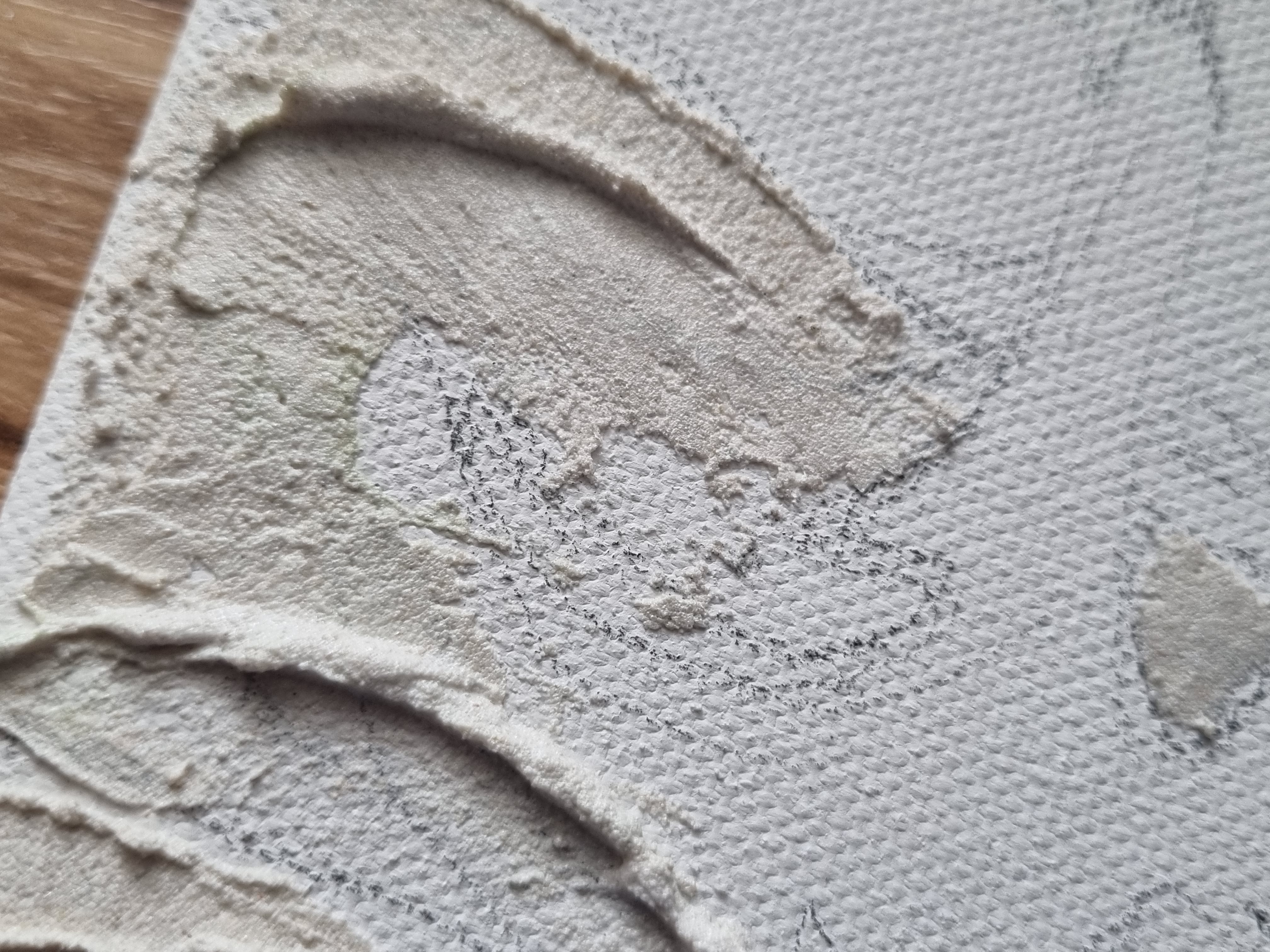 Важно отметить, что слой не трескается на холсте на подрамнике, т.е. на подвижной подложке, что очень важно и вовсе не повсеместно для такого рода материалов. При продавливании с изнанки холста, масса не расходится, образовывая трещины, а демонстрирует прекрасную адгезию с основой и свою целостность.
