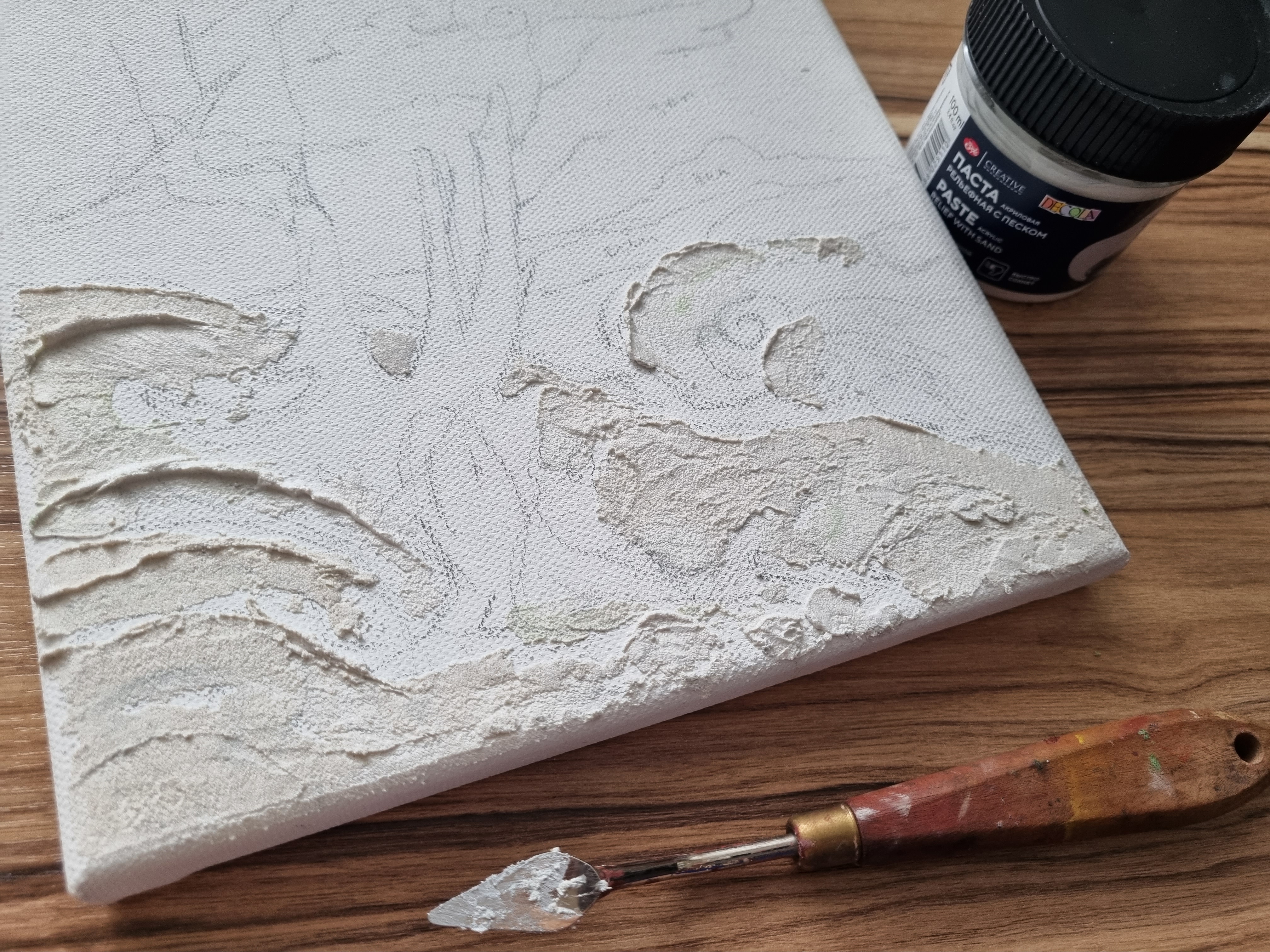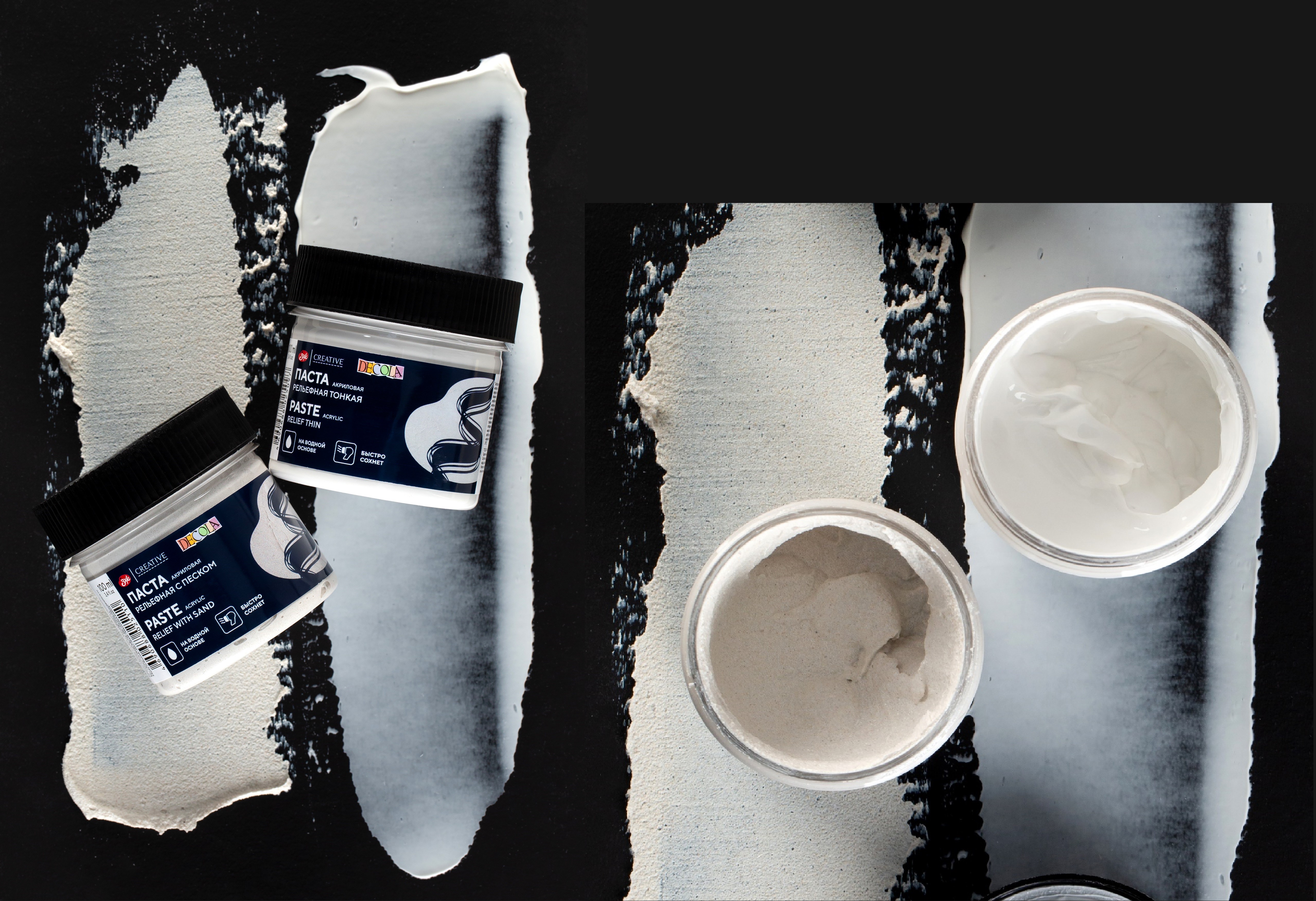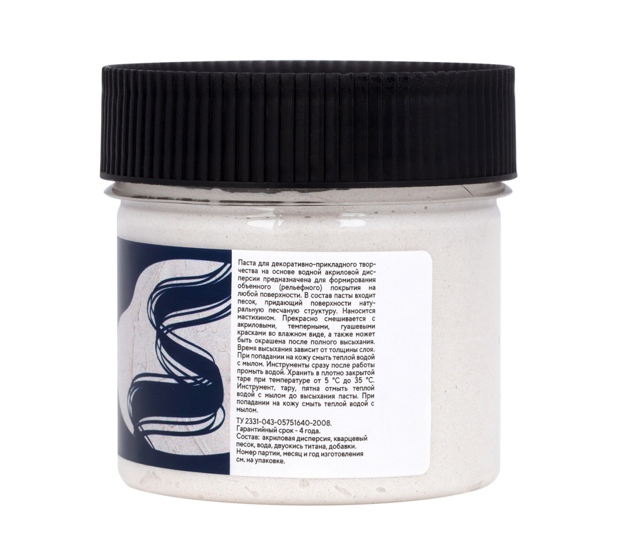 В состав пасты входит песок, придающий поверхности натуральную песчаную структуру. Наносится мастихином. Прекрасно смешивается с акриловыми, темперными, гуашевыми красками во влажном виде, а также может быть окрашена после полного высыхания.