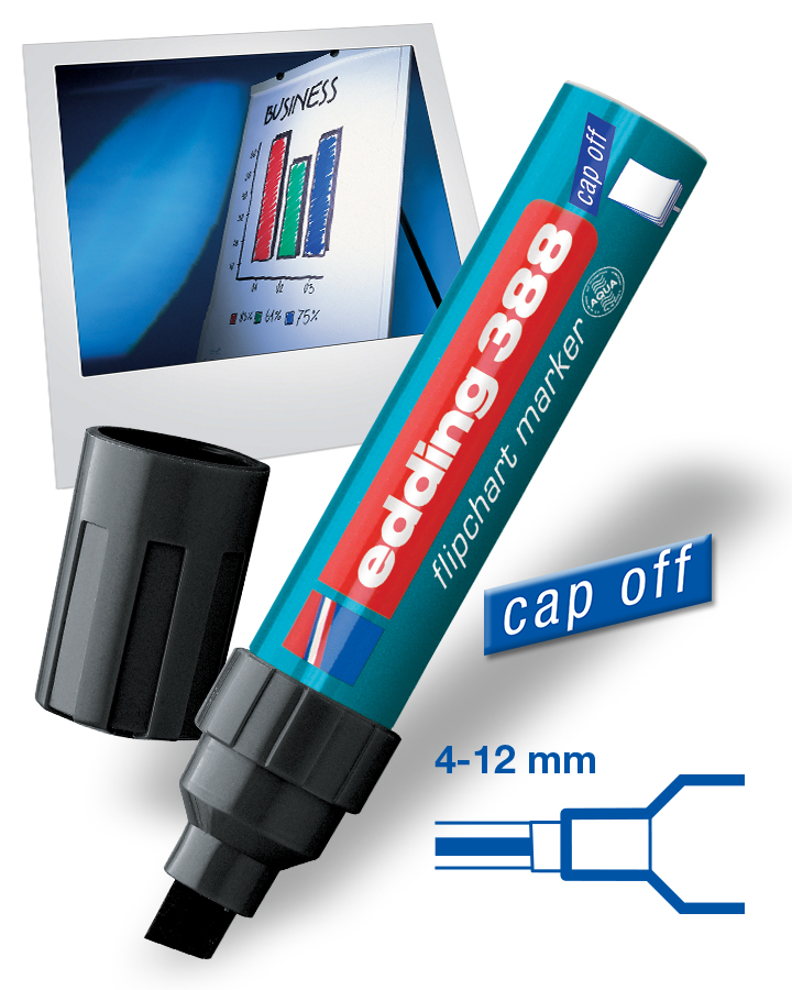 Флипчарт-маркер/скошен/4-12мм черный. Флипчарт маркеры Edding "388", служат для написания и маркировки текста на перекидных плакатах и пленках для презентаций. Чернила не просачиваются сквозь бумагу. Для маркера используется чернила cap-off, с помощью чернил cap-off, маркер может оставаться открытым без колпачка некоторое время и качество не пострадает. Маркер заправляемый.