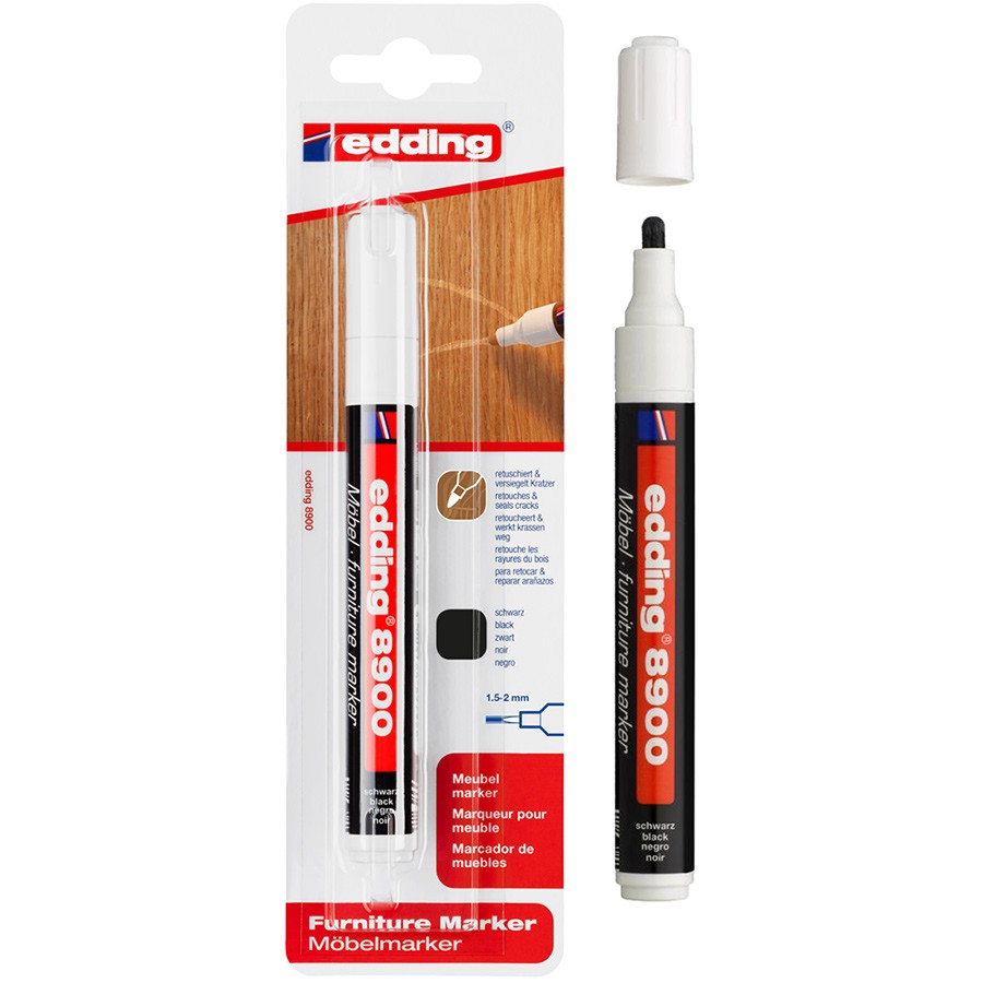 C помощью маркеров из серии Edding 8900 вы сможете самостоятельно вернуть мебели практически первоначальный вид. Маркеры разработаны для маскировки небольших повреждений и неглубоких царапин, имеют круглый наконечник шириной 1,5-2 мм и заправлены плотными непрозрачными чернилами с высокой кроющей способностью. Выпускаются в серии из 13 оттенков, соответствующих наиболее распространенным цветам мебельных изделий. Подходят также для закрашивания царапин на мебели из фанеры и ДСП. При первом использовании как следует потрясите маркер, снимите крышку и несколько раз надавите кончиком маркера на бумагу. Как только чернила заполнят весь наконечник, маркер будет готов к работе
