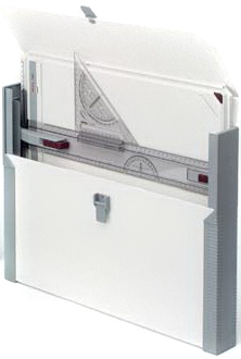 Доска из прочного не ломающегося и не царапающегося пластика; Эргономичный дизайн; Рейсшина с уникальным механизмом фиксации и освобождения; Полная фиксация листа по двум сторонам и одному углу; Направляющие для рейсшины имеются со всех 4-х сторон, что позволяет работать как при горизонтальном, так и при вертикальном положении; Нескользящая нижняя поверхность; В комплект входит треугольная чертежная головка; Снабжена съемными ножками для более комфортной работы; Снабжена пластиковым кейсом для хранения и переноски