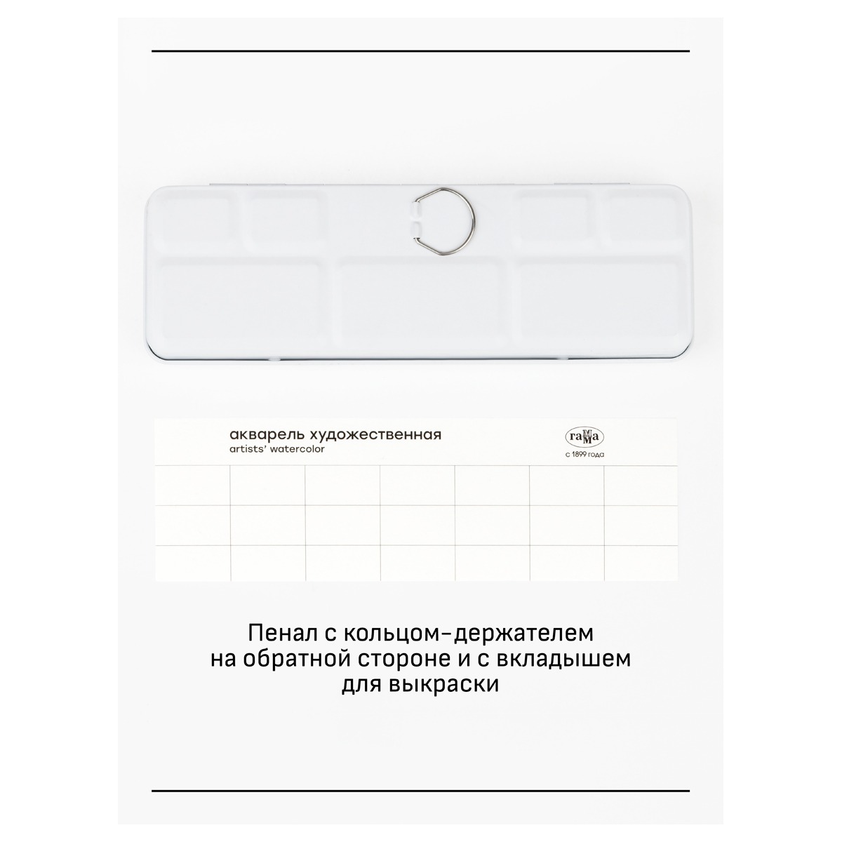Набор в металлическом пенале с удобными креплениями кювет, палитрой и кольцом-держателем на обратной стороне.