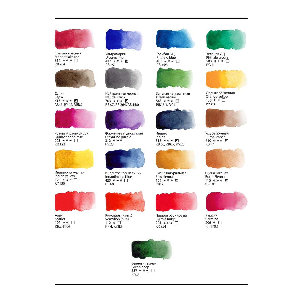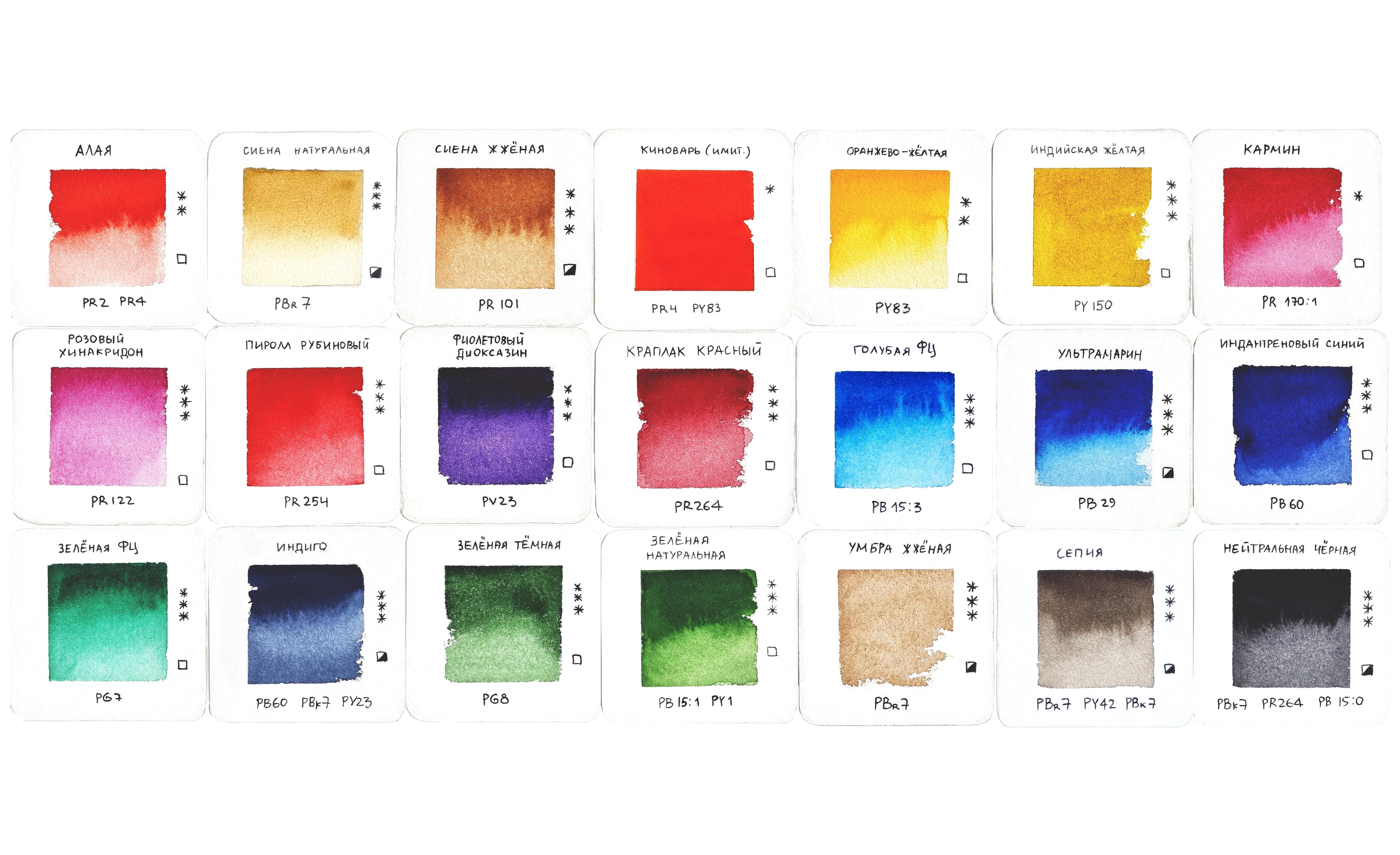 Краски изготовлены на основе органических и неорганических пигментов и гуммиарабика высшего качества. Цвета акварельных красок звонкие, чистые, прозрачные. Краски высокопигментированные, интенсивные, легко набираются на кисть. Маркировка светостойкости, колор-индекса и укрывистости указана на упаковке.